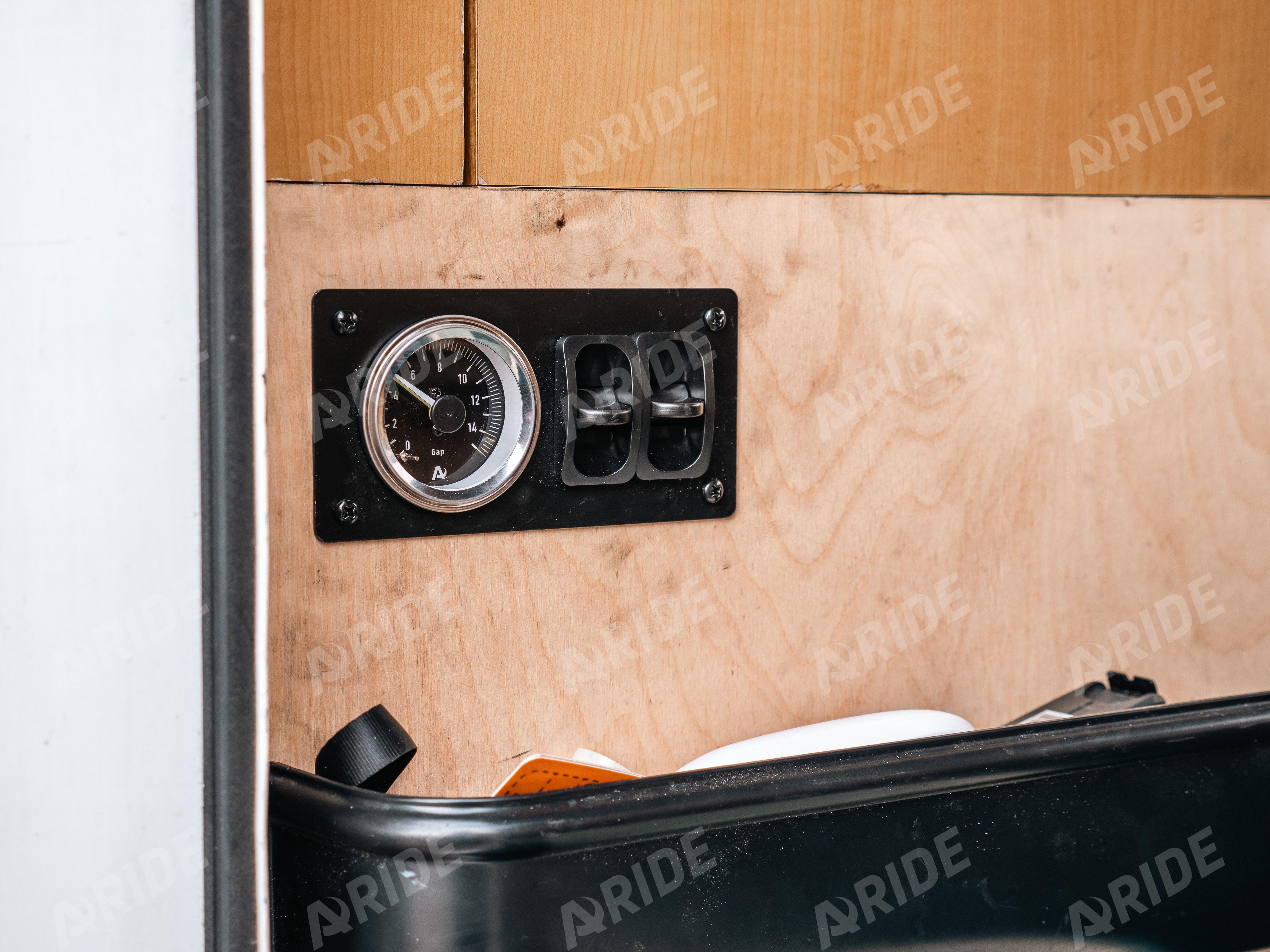 Регулировка давления в подушках реализована за счёт установленной двухконтурной системы управления. Так как это автодом, по просьбе клиента, система была установлена в заднюю часть автомобиля. Блок управления врезан в боковую панель, так же рядом с блоком был выведен разъём для подкачки колёс.