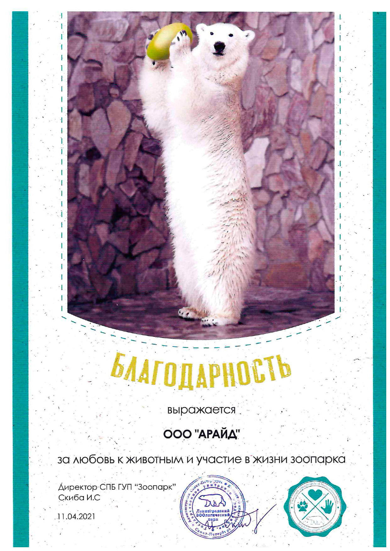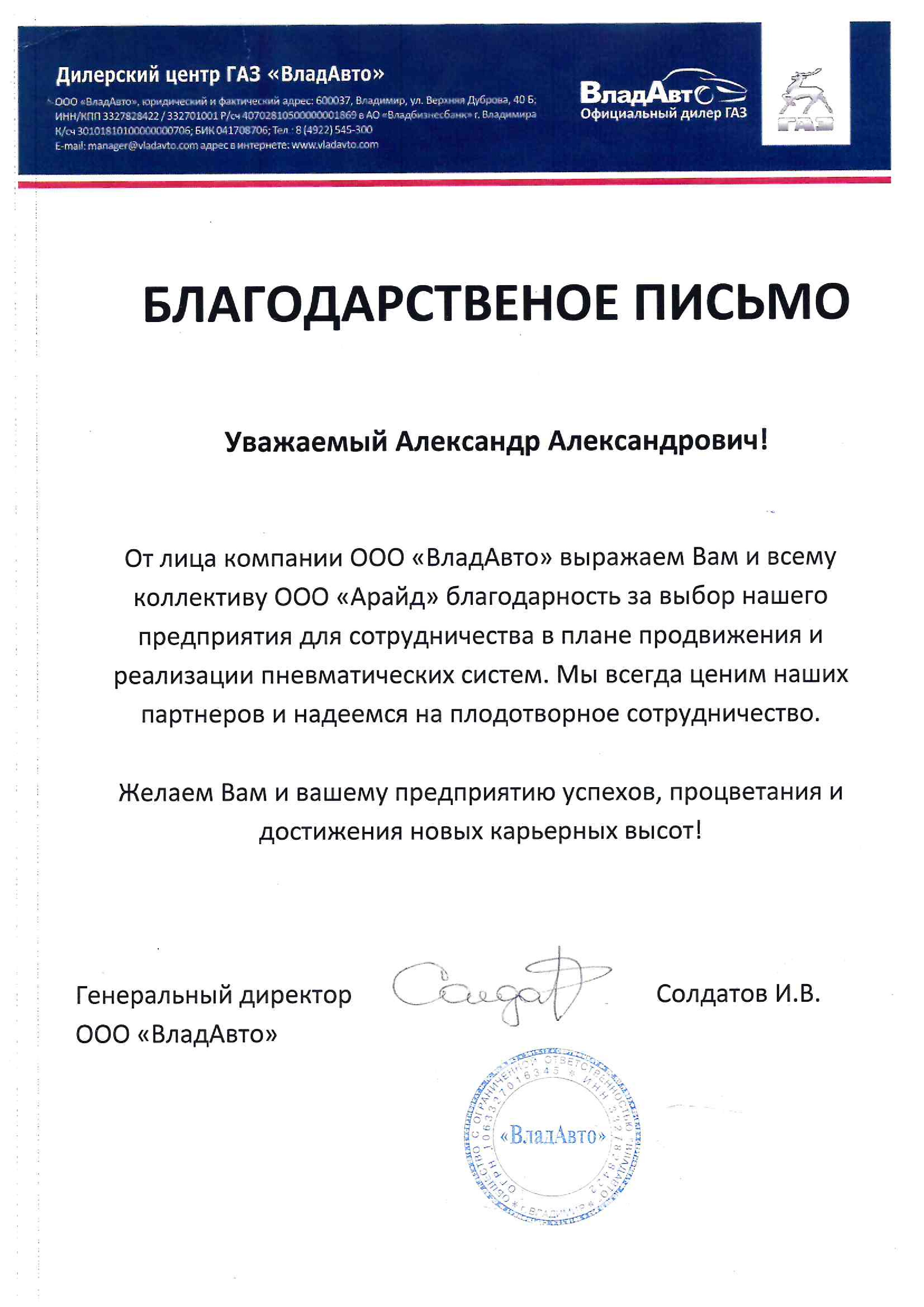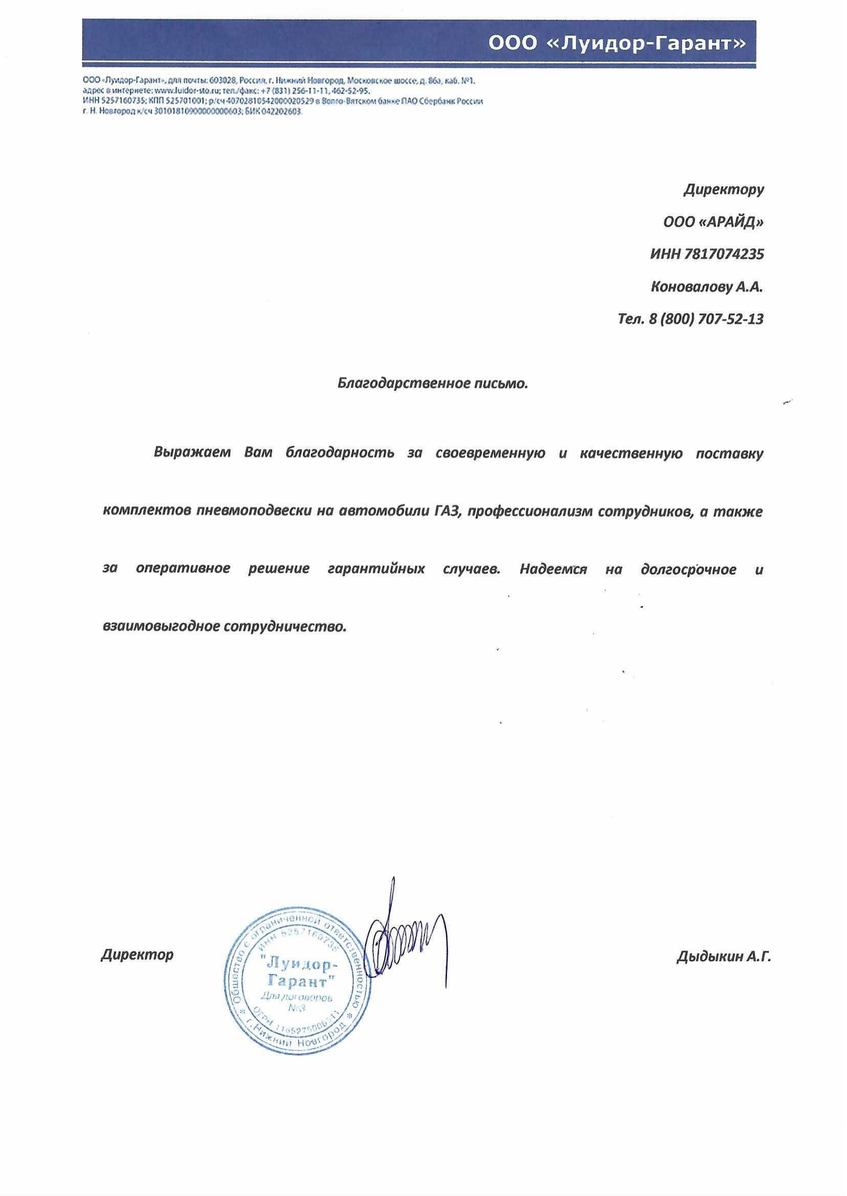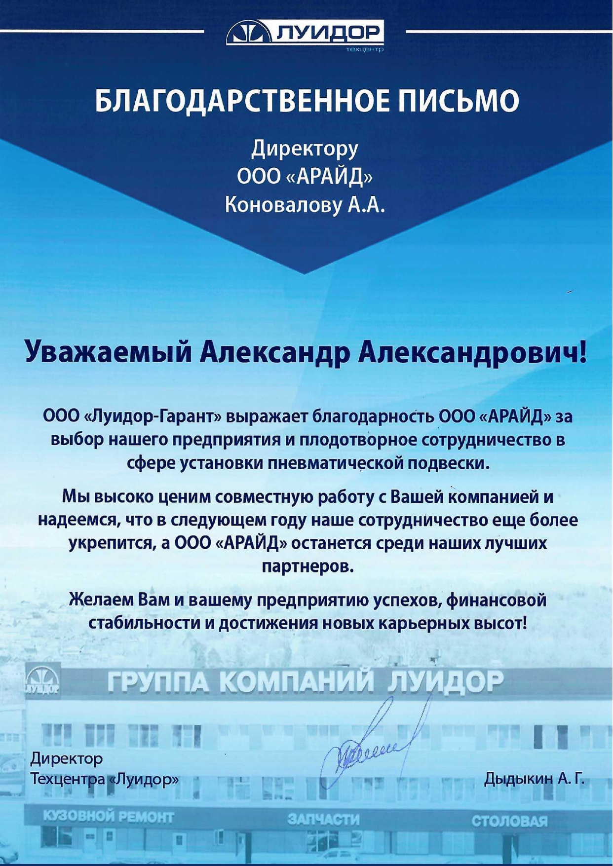 Дилерская сеть компании Арайд - благодарственные письма