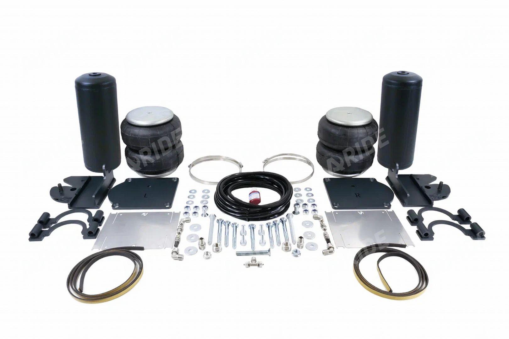 Комплект пневматической подвески разработан специально для автомобиля и включает в себя два пневмоэлемента, кронштейны для крепления к раме и мосту, крепеж, фурнитуру для накачки от внешнего компрессора, инструкцию по установки своими руками.