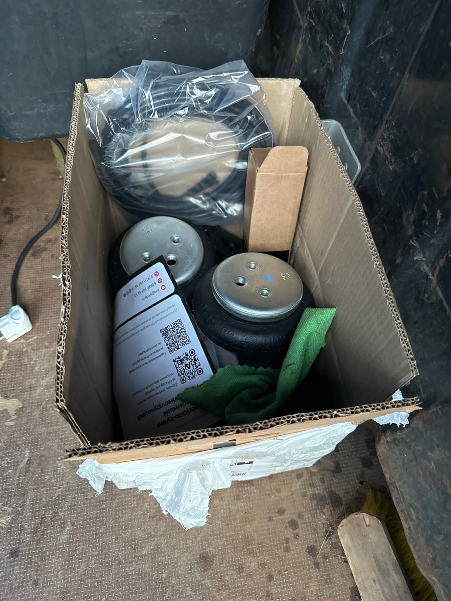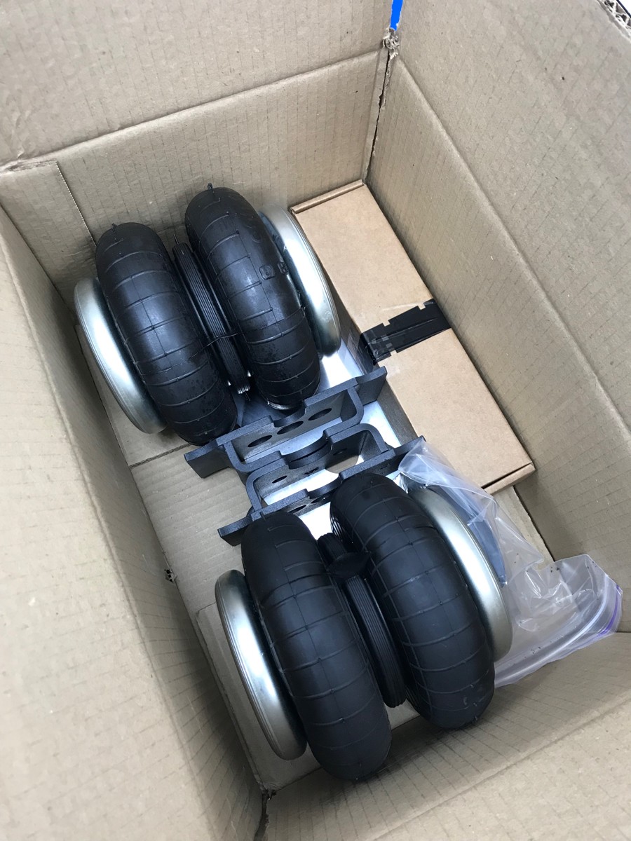 Комплект пневматической подвески разработан специально для автомобиля и включает в себя два пневмоэлемента, кронштейны для крепления к раме и мосту, крепеж, фурнитуру для накачки от внешнего компрессора, инструкцию по установки своими руками.