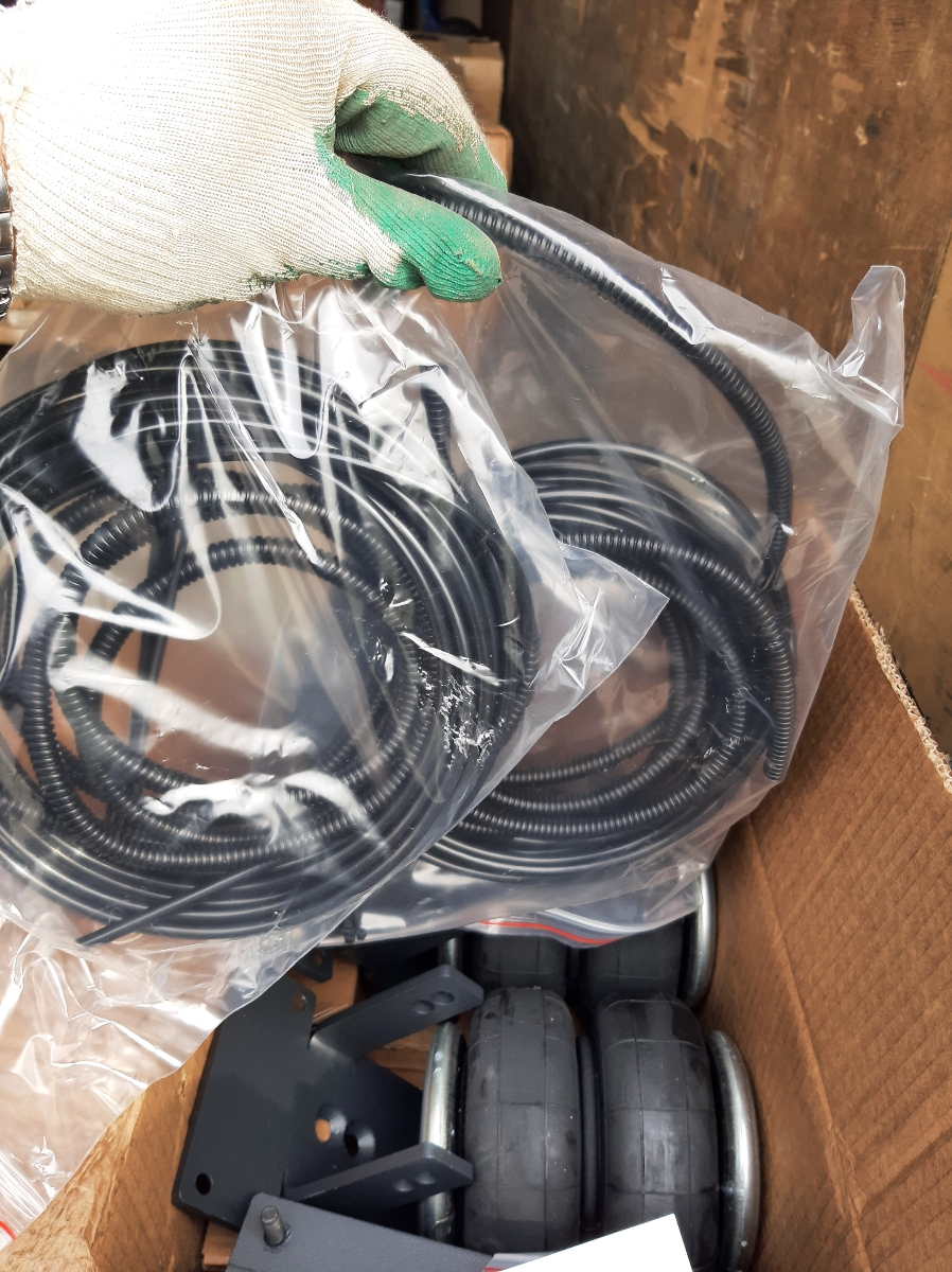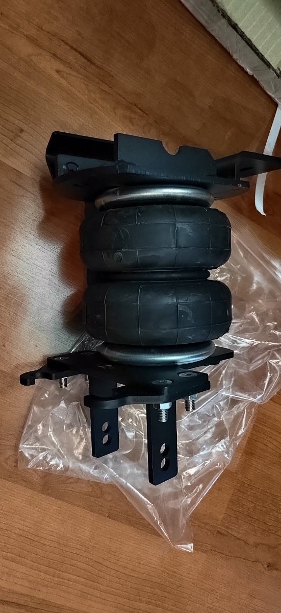 Комплект пневматической подвески разработан специально для автомобиля и включает в себя два пневмоэлемента, кронштейны для крепления к раме и мосту, крепеж, фурнитуру для накачки от внешнего компрессора, инструкцию по установки своими руками.
