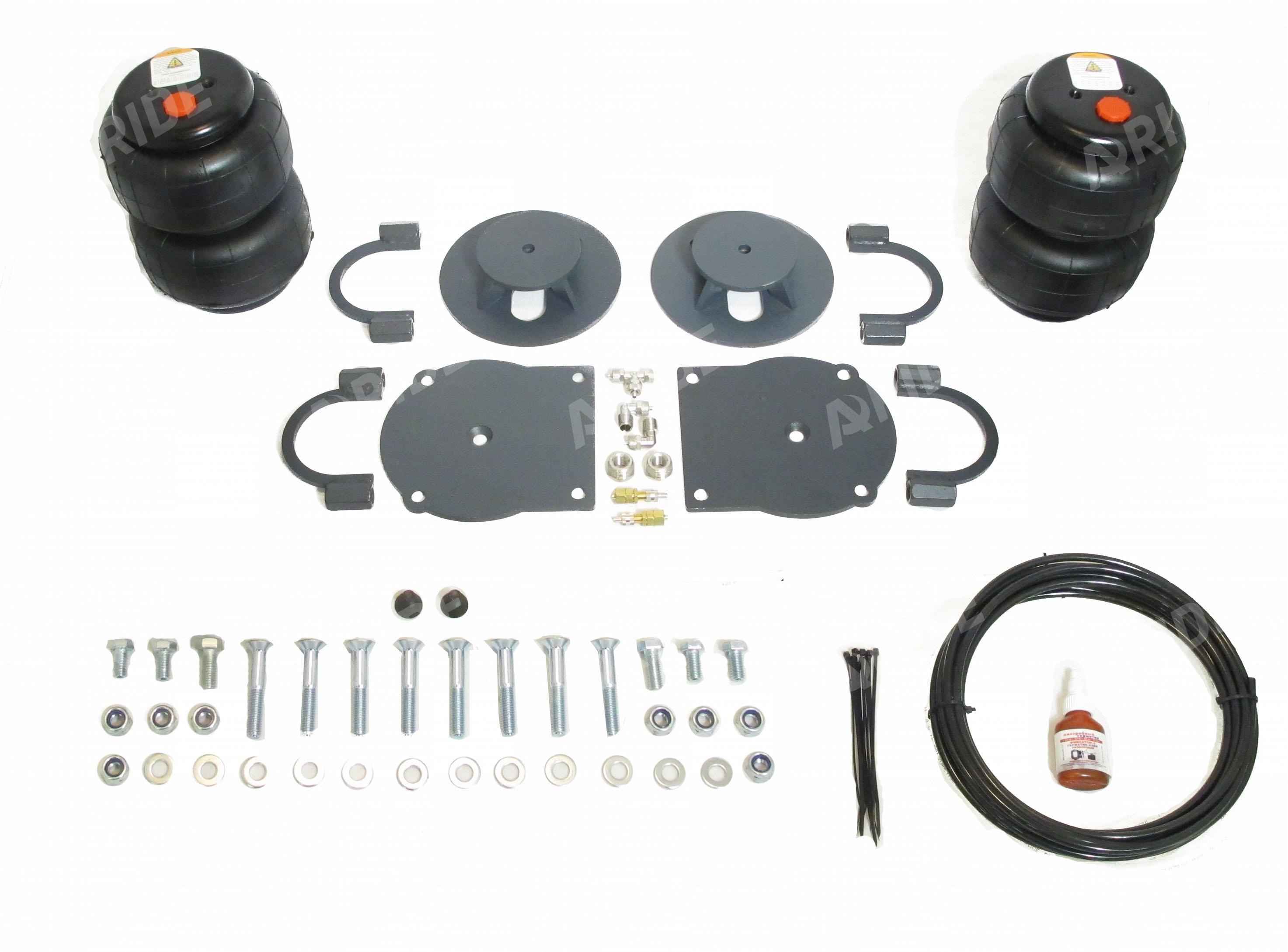 Комплект пневматической подвески разработан специально для автомобиля и включает в себя два пневмоэлемента, кронштейны для крепления к раме и мосту, крепеж, фурнитуру для накачки от внешнего компрессора, инструкцию по установки своими руками.
