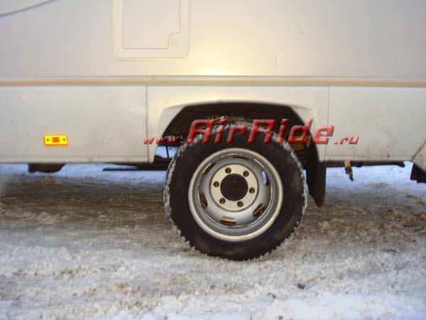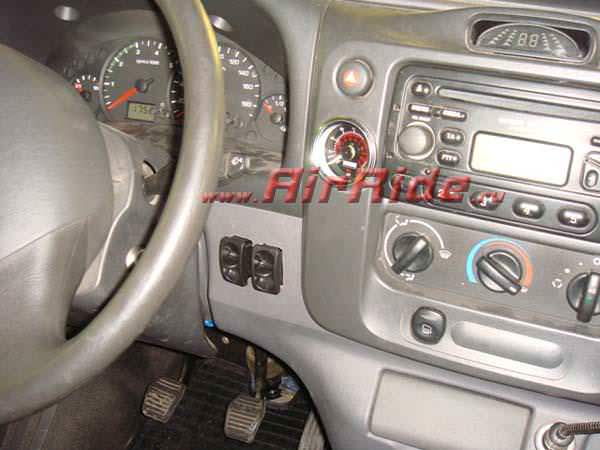 В машину инсталлирован комплект на заднюю ось, управление на базе пневмокнопок и двухстрелочный манометр. Вся система подключена к существующей подготовке воздуха (ресивер и компрессор).