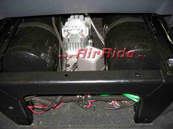Расположение органов системы управления (компрессор, ресивер) под передним пассажирским сидением. 3 манометра (2 осевых и 1 ресиверный) размещены на левой боковине водительского сидения. Под ним же, на фронтальной части, живут 4 пневматические клавиши. При установке комплекта ни один элемент интерьера нового дорогого автомобиля не пострадал! Дополнительно была установлена опция подкачки колёс.