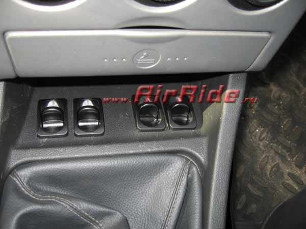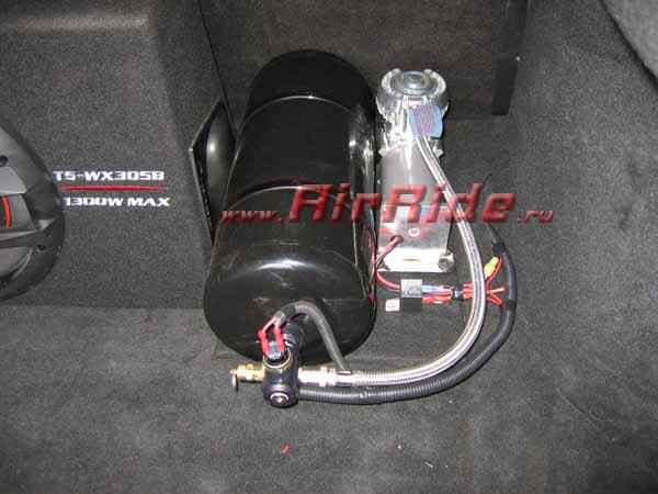 Установлен стандартный набор оборудования полной пневмоподвески. Управление 4х контурное на пневматических клавишах, система AirRide AR 4-150PS. Также была применена опция "максимальное занижение". Установлены дополнительные кронштейны задней балки (цена 2500 руб.). Промежуточный вал был не актуален, поэтому пришлось "подпилить" лонжерон. Манометры в последствии будут размещены на стойке в специальный подиум. Основные агрегаты пневмосистемы (компрессор + ресивер) заняли свой законное стандартное место в багажном отсеке.