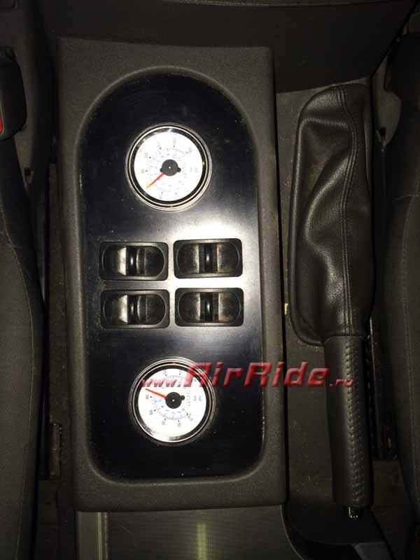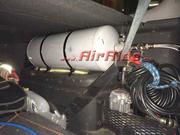Установлена полная пневматическая подвеска. Анонс проекта вышел с задержкой в 2 месяца, так как автомобиль находился на испытаниях. Теперь есть о чем писать. Задача: периодическое изменение клиренса в ручную. Обеспечение комфорта задней и передней осей и регулировка клиренса передней оси на малом давлении. Передние пневматические стойки изготовлены с отступлением от привычных стандартов. Для установки пневматического элемента большего диаметра на переднюю стойку при монтаже на автомобиль пришлось сместить её наружу. Эксперимент удался. Теперь вместо требуемых 12 BAR на подъём передней оси нужно 8 BAR. Тем не менее, для обеспечения комфортной характеристики работы передней пневмоподвески пришлось провести дополнительные работы по корректировке. Система управления на 150PSI стала возможна для работы в данном автомобиле (AirRide AR 4-150PS).