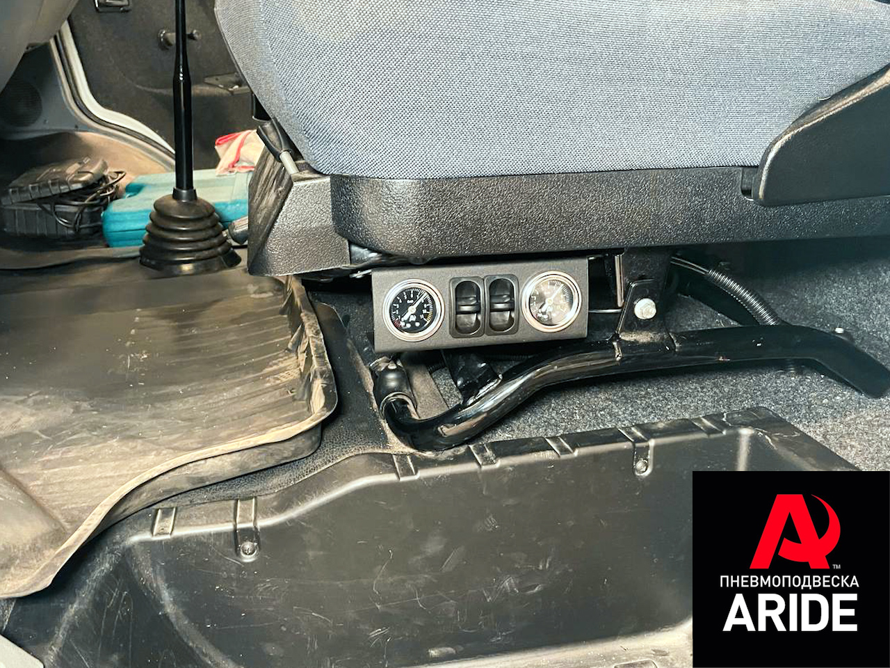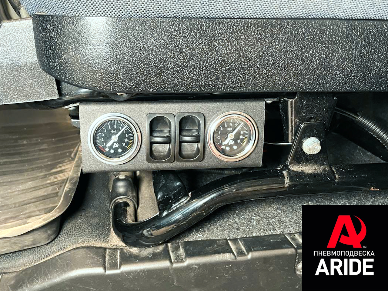 Система полностью устанавливается под водительское сидение. Блок управления с манометрами и пневмоклавишами так же выводится под водительское сидение. Максимальное давление, которое предусматривает данная система - 8 атмосфер.