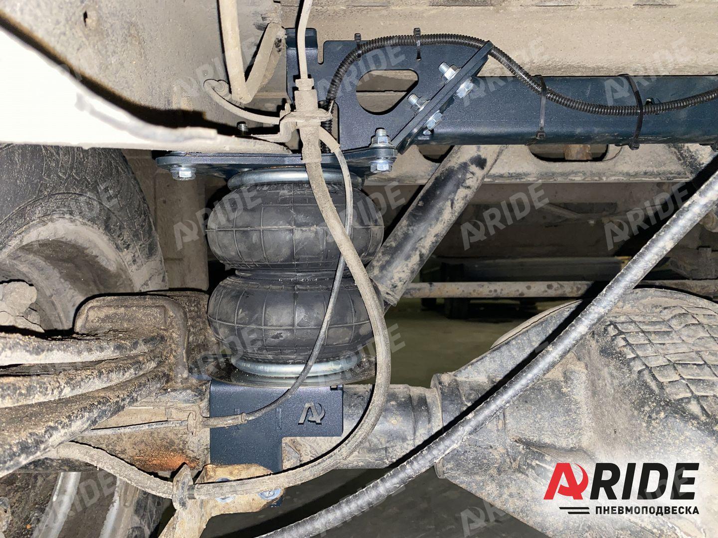 В данном случае клиентом было принято решение по дооснащению автомобиля вспомогательной пневматической подвеской. На заднюю ось был установлен комплект, отличительной особенностью которого являются пневматические подушки - 180D1. Комплект устанавливается между рамой и мостом автомобиля, тем самым разгружая пакет рессор.