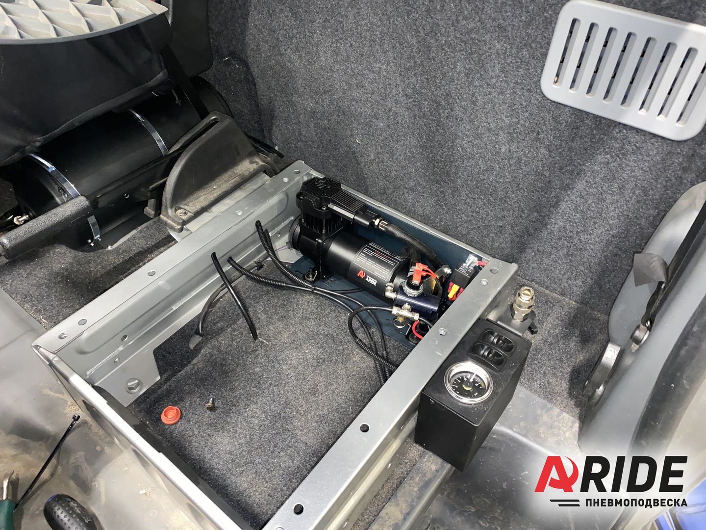 Для управления пневматической подвеской, была выбрана двухконтурная система управления - 2.150.ПС. В данной системе используется мощный компрессор - ARIDE 444 BLACK, десятилитровый ресивер, двухстрелочный манометр и две пневматические клавиши. Особенностью данной системы является не только высокопроизводительный компрессор и большой объём воздуха, а так же давление в системе, её пиковое значение достигает 10 атмосфер.