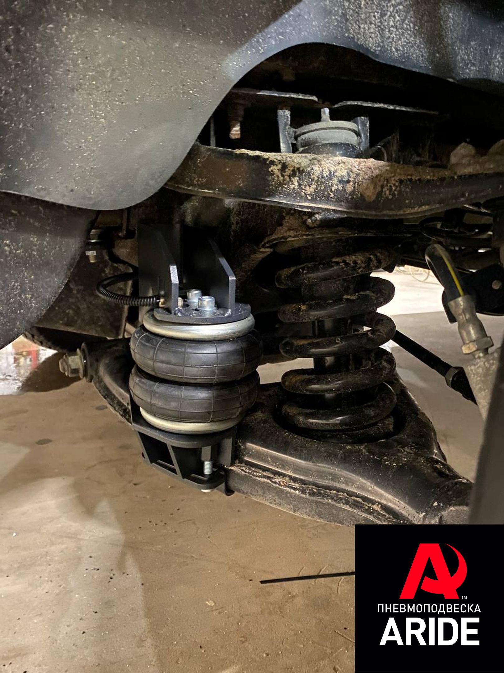 На авто была установлена вспомогательная пневмоподвеска на переднюю ось в дополнение к штатным пружинам. Это дало нам по 700-800кг. грузоподъёмности на каждой стороне спереди.