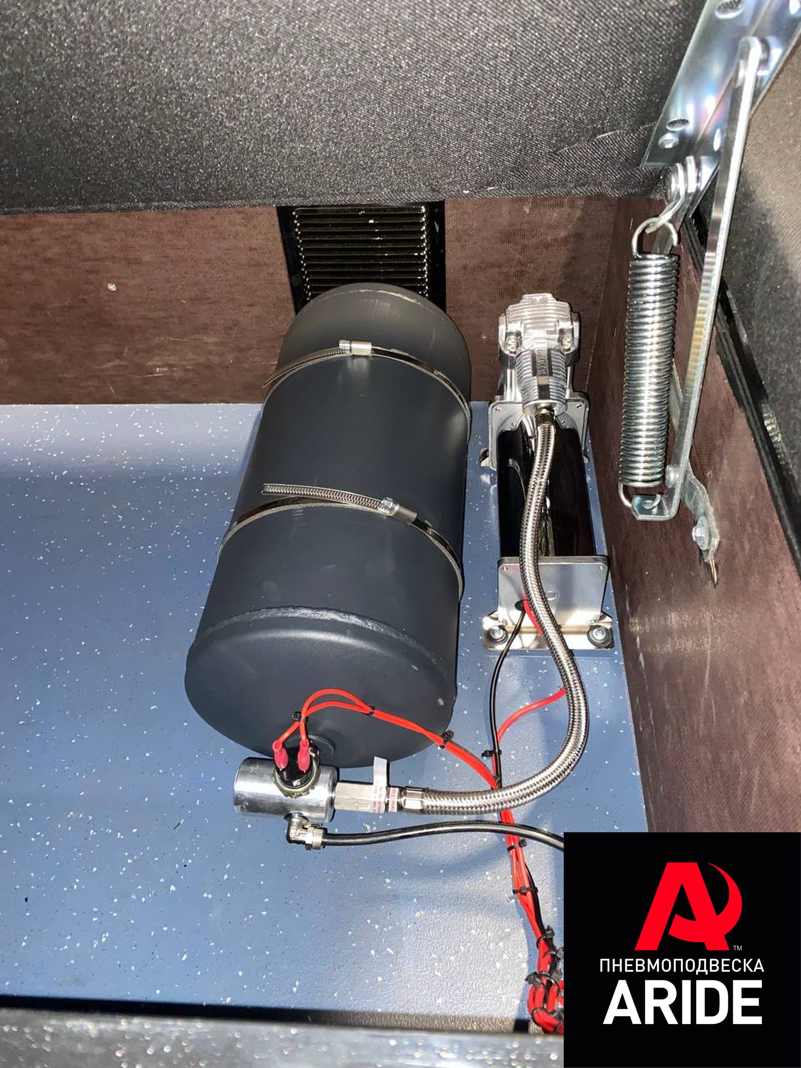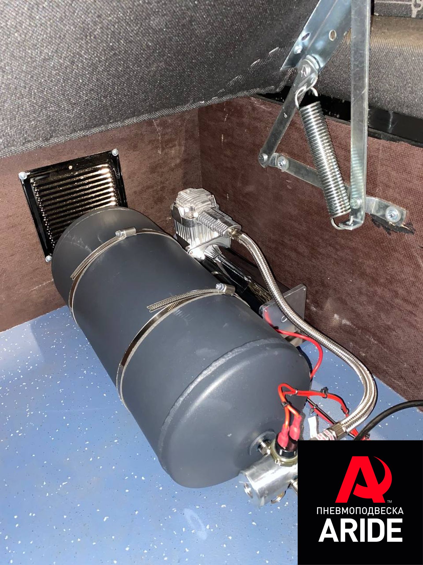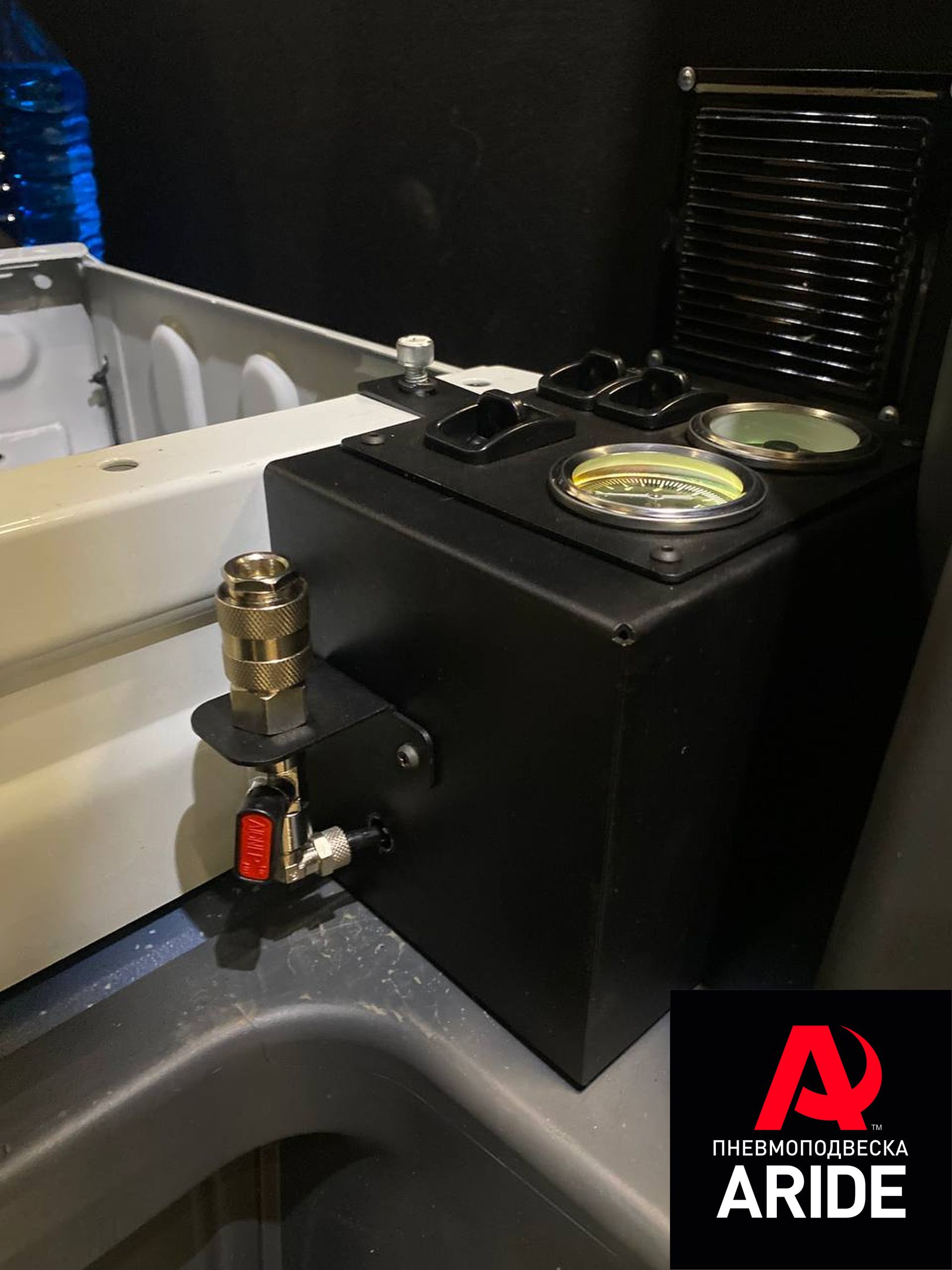 Для регулировки давления в подушках, нашими мастерами была установлена трёхконтурная система управления 3 150 ПС. Эта система оснащена нашим самым мощным компрессором ARIDE 444, 10-ти литровым ресивером, тремя пневмоклавишами и двумя маномтерами с подсветкой.