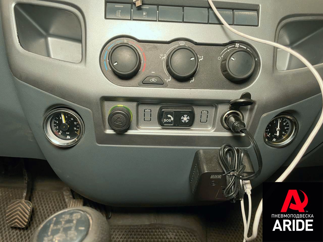 Управление пневматическими подушками реализовано за счёт трёхконтурной системы 3.120.ПС. По желанию клиента, компрессор был установлен под водительское сидение, клавиши управления - слева от водительского сидения, а сами манометры были вмонтированы в панель. Данная система имеет три контура подкачки, один на переднюю ось, и два на заднюю ось. Два контура на задней оси обеспечивают не только плавность хода, уменьшения крена автомобиля, но и при помощи двух контуров есть возможность отдельно отрегулировать высоту каждой стороны. Так же в дополнение к системе управления, была установлена подкачка колёс. Быстросъём был выведен рядом с пневматическими клавишами. А витой шланг и пистолет с манометром убраны в специальный ящик.