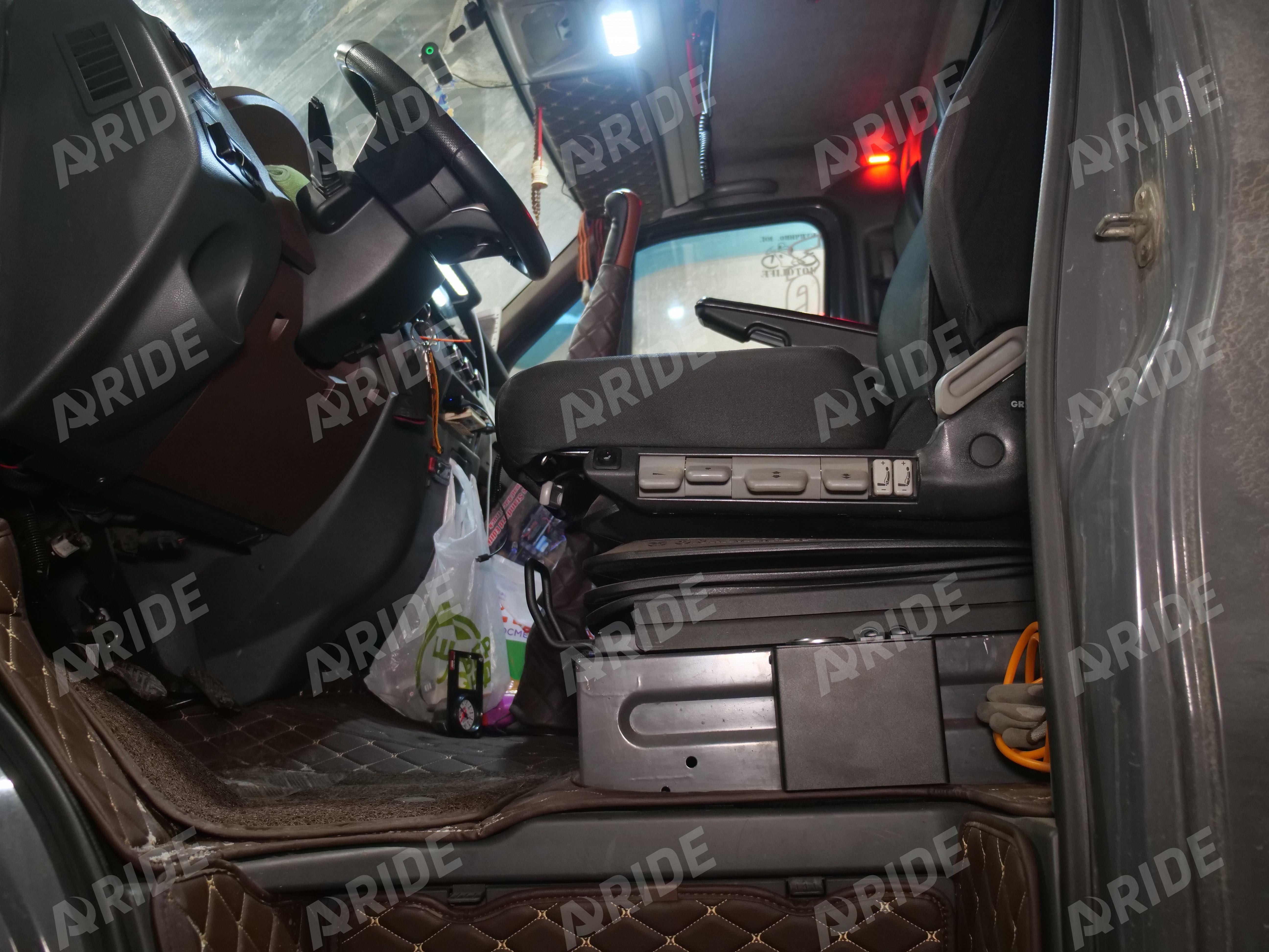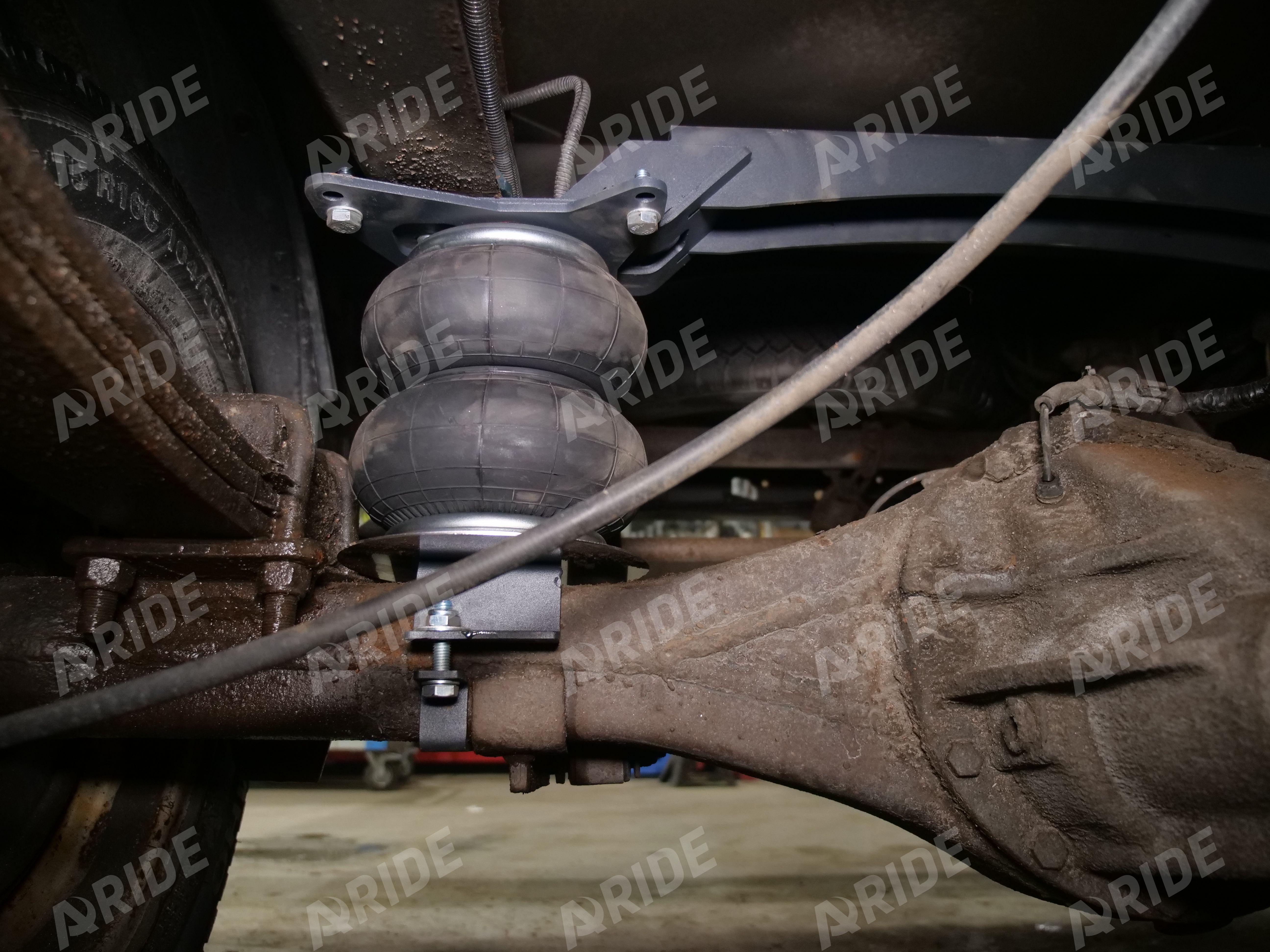 Наши специалисты приступили к демонтажу старого комплекта (на фотографии видны следы от старого комплекта, на раме), а на его место был установлен наш новый комплект. Комплект устанавливается и крепится к раме исключительно через заводские отверстия в ней. Для большей жёсткости всей конструкции, комплект включает в себя поперечный усилитель, который равномерно распределяет нагрузку между правой и левой частью рамы. Также для снижения нагрузки на нижнюю полку рамы, комплект оборудован дополнительными вставками, которые вставляются в раму, и крепятся через заводские отверстия. Нижние кронштейны устанавливаются на мост, и крепятся к нему за счёт специальных скоб. В комплекте используются пневматические подушки 180D1, каждая из которых берёт на себя нагрузку, равную 1500 килограмм.