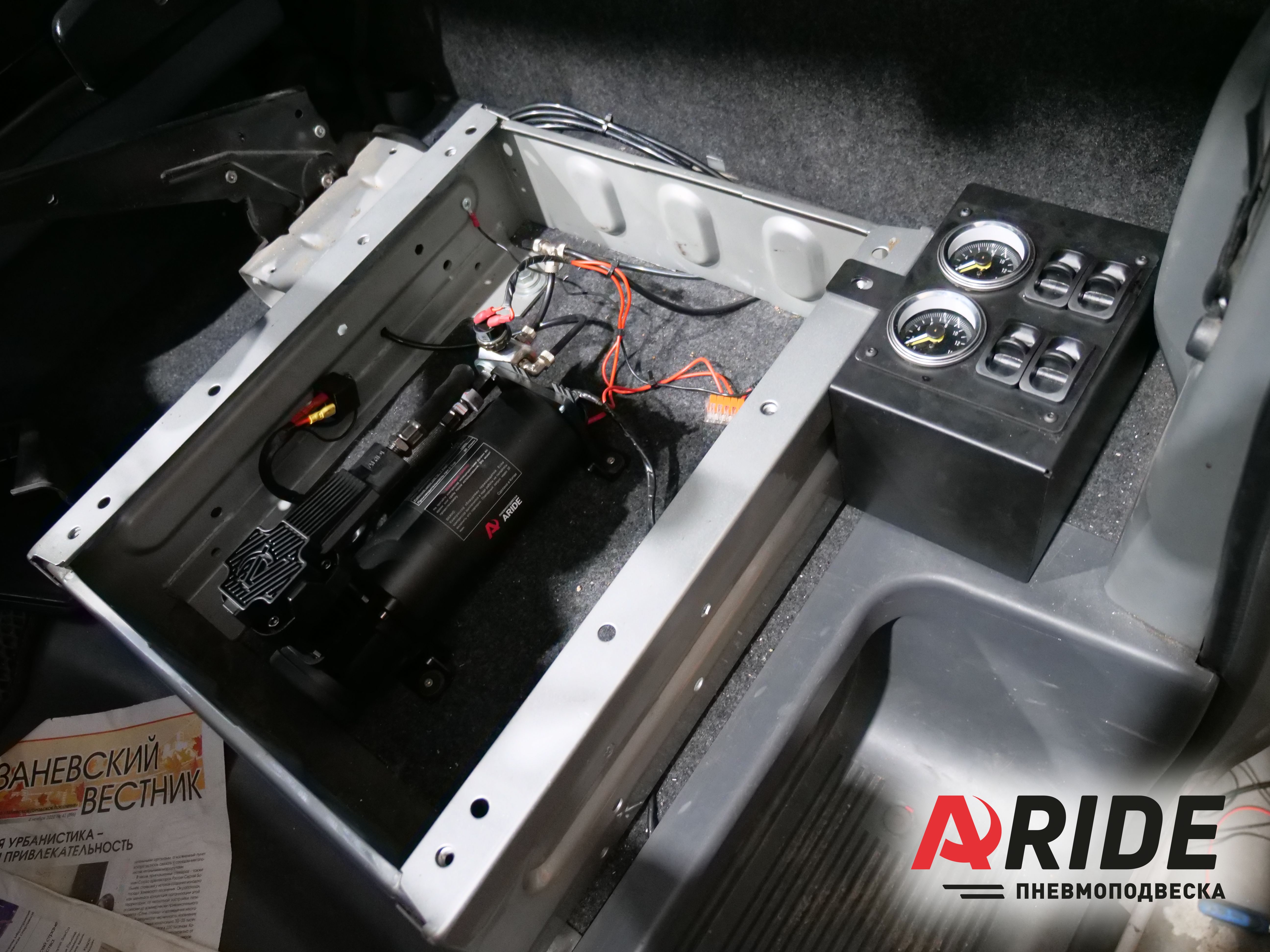 Для того чтобы регулировать давление в пневмоподушках, была смонтирована 4х контурная система управления 4.150.ПС. Она оснащена высокопроизводительным компрессором ARIDE 444, который способен нагнетать в пневмоподушки давление до 10 атмосфер. Так же данная система оснащена 10ти литровым ресивером, что позволяет подключить к ней подкачку колёс или продувку салона.