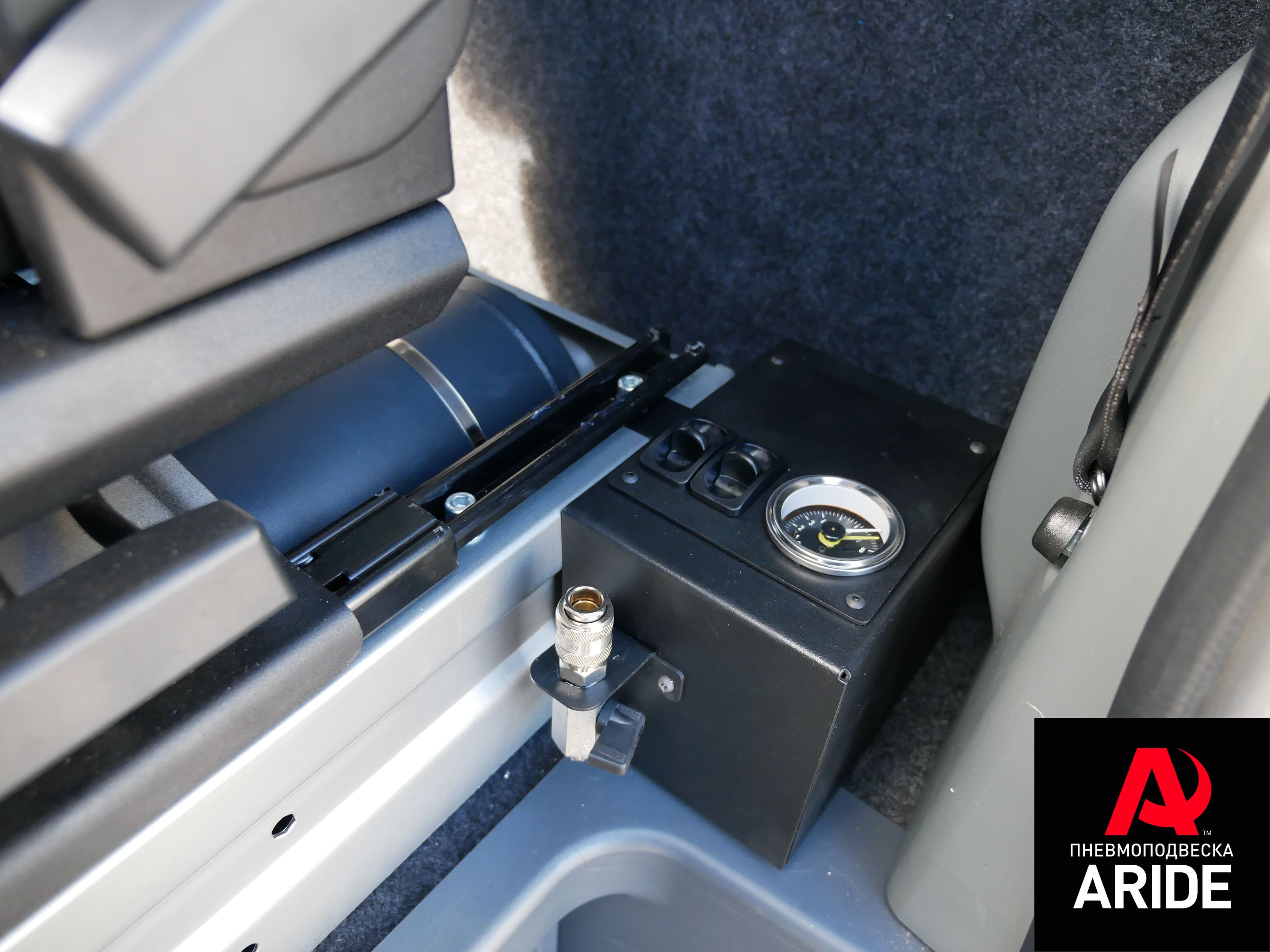 Очередная Газель Next, очередной универсальный для Газелей комплект 02090 на подушках 180D1 грузоподъемностью 1500 кг каждая. В качестве органа управления Клиент выбрал систему 2.120.PS, 5л ресивер спрятали под водительским сиденьем, компрессор убрали за сиденье. В панели управления так же вывели быстроразъем для подкачки колёс.