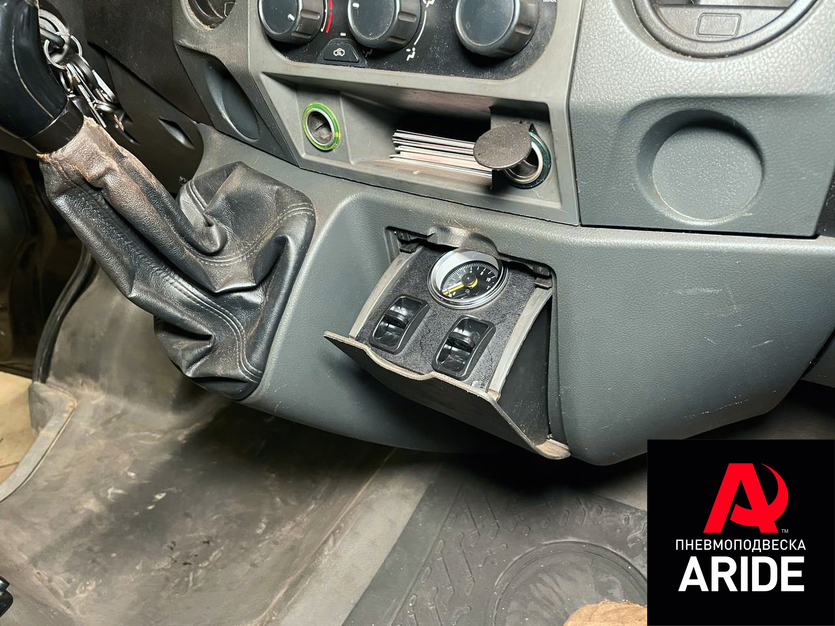 Для регулировки давления используются две пневмоклавиши и один двухстрелочный манометр с подсветкой. В данном проекте блок управления расположили в подстаканнике, справа от кулисы КПП.