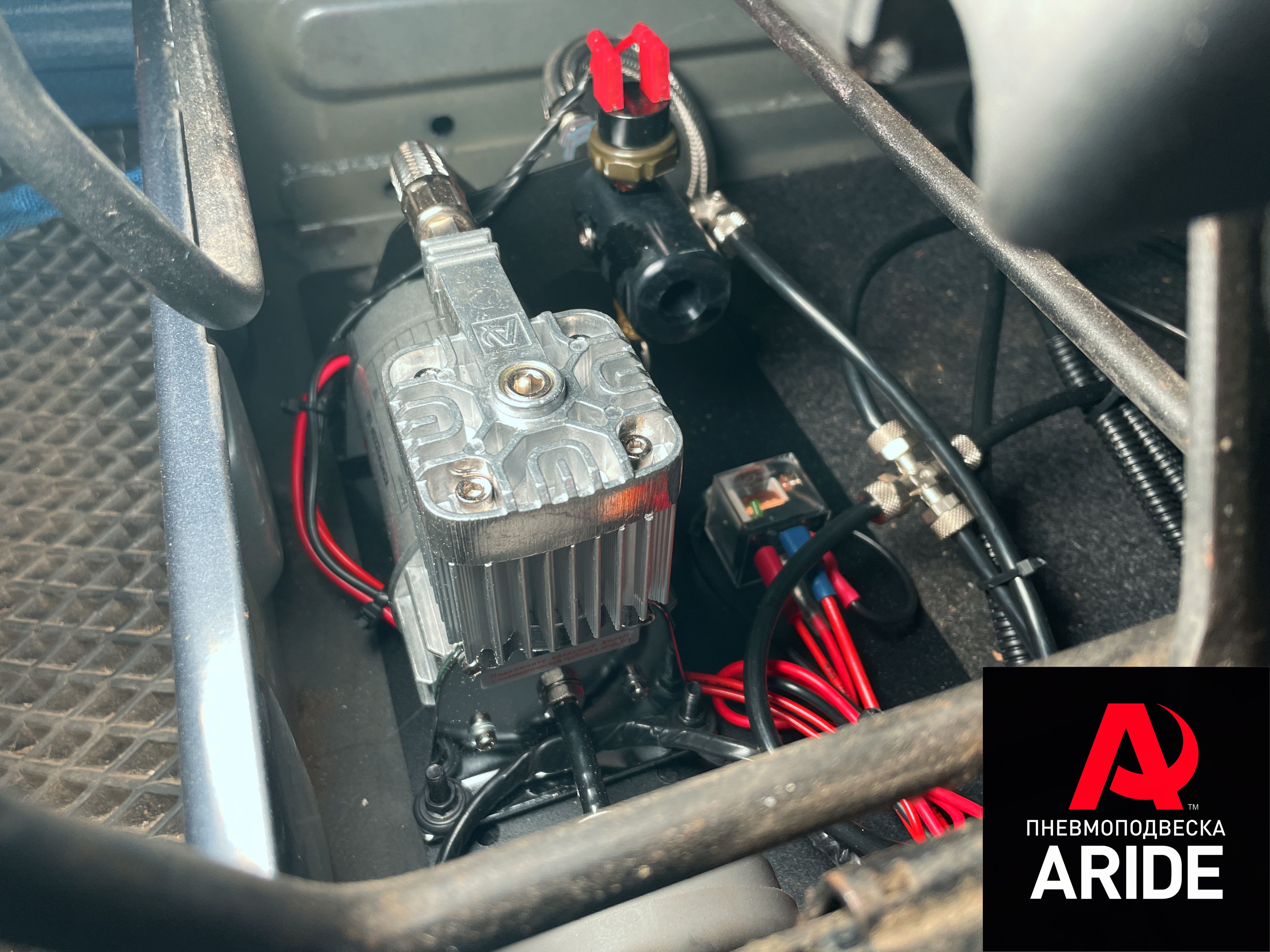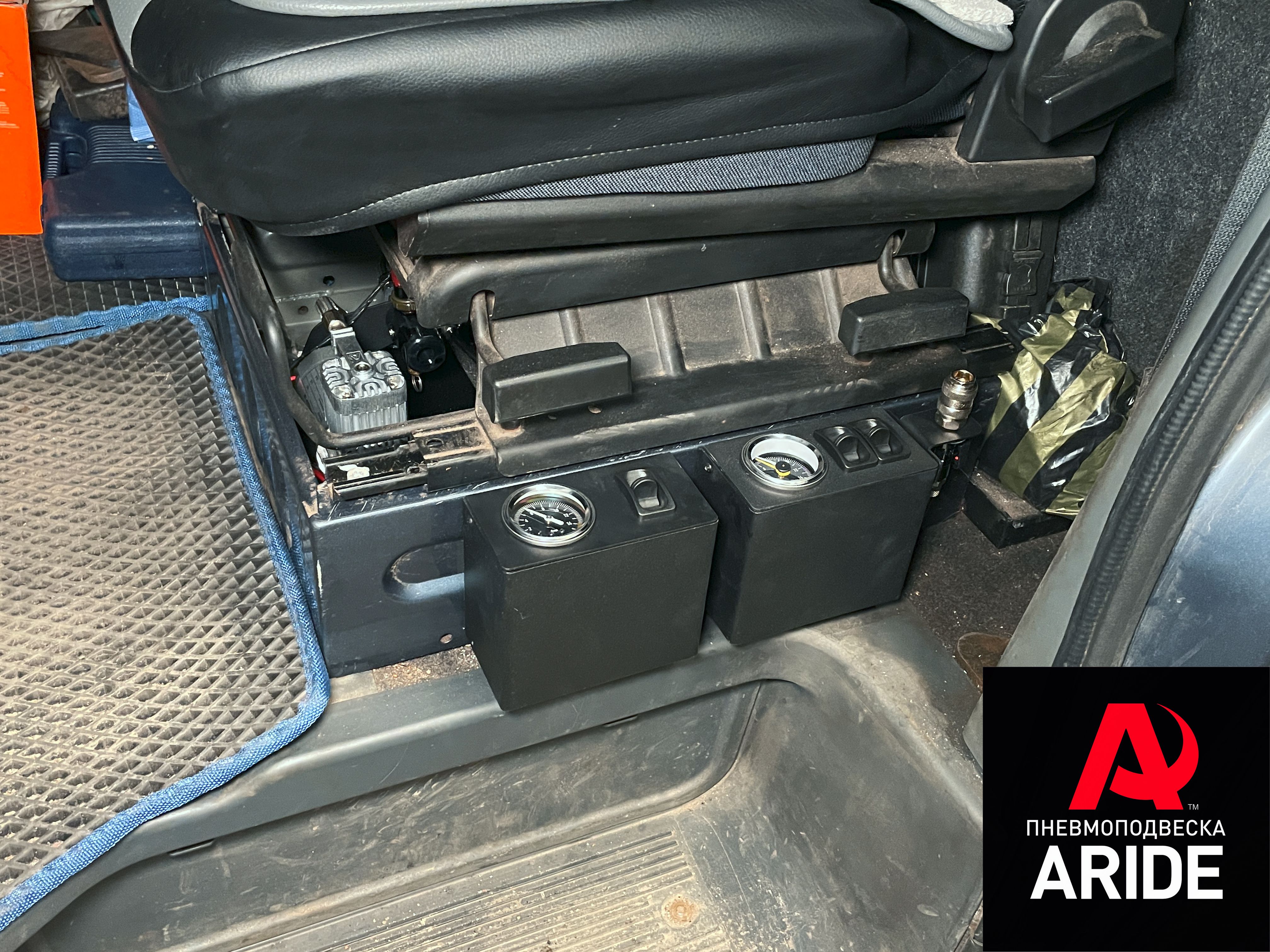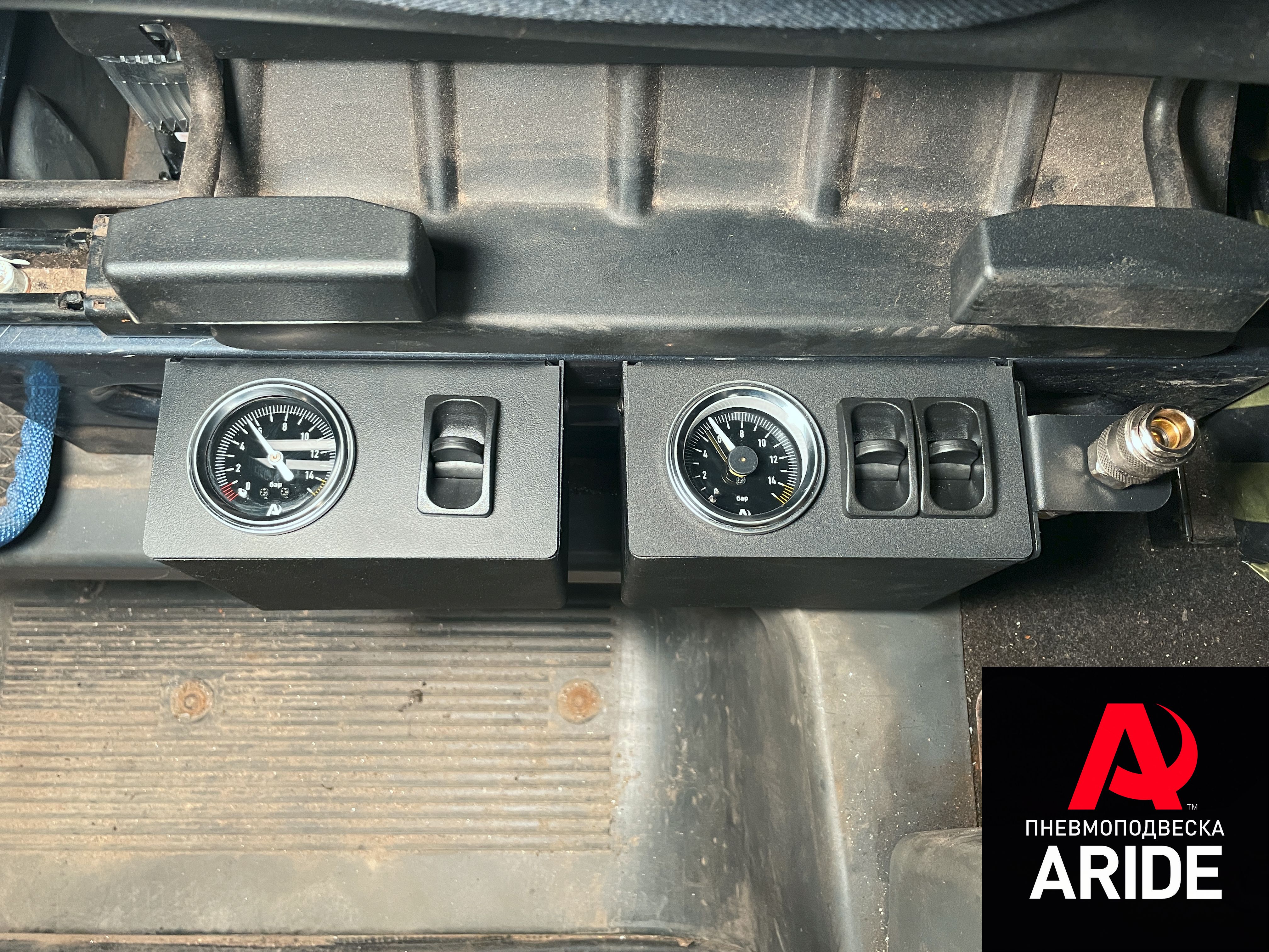 Так же на автомобиль была установлена трёхконтурная система управления 3.Оптимал. Данная система способна накачать в подушки до 8 атмосфер давления. Система оснащена двумя манометрами, пневмоклавишами и компрессором ARIDE 100.