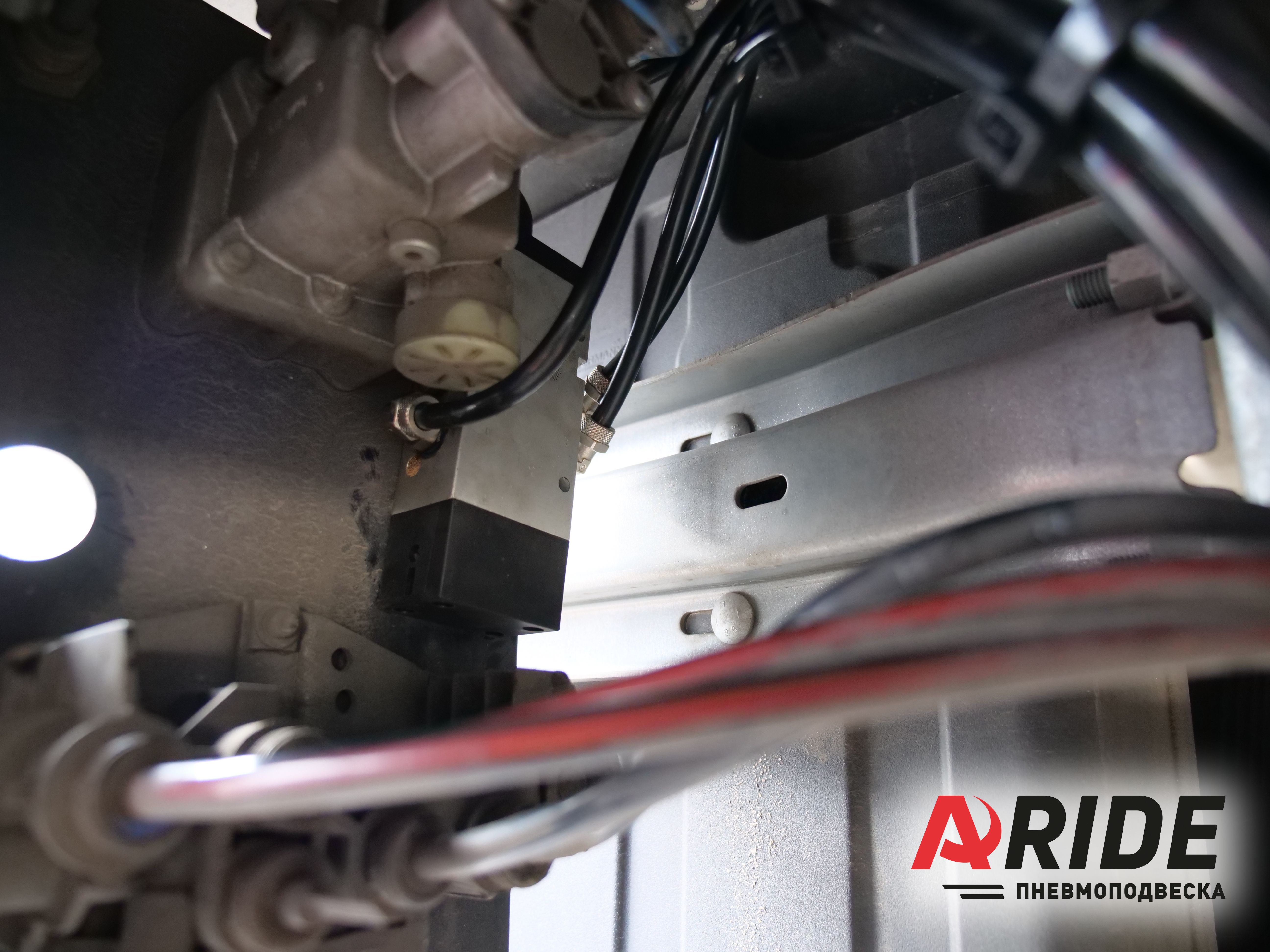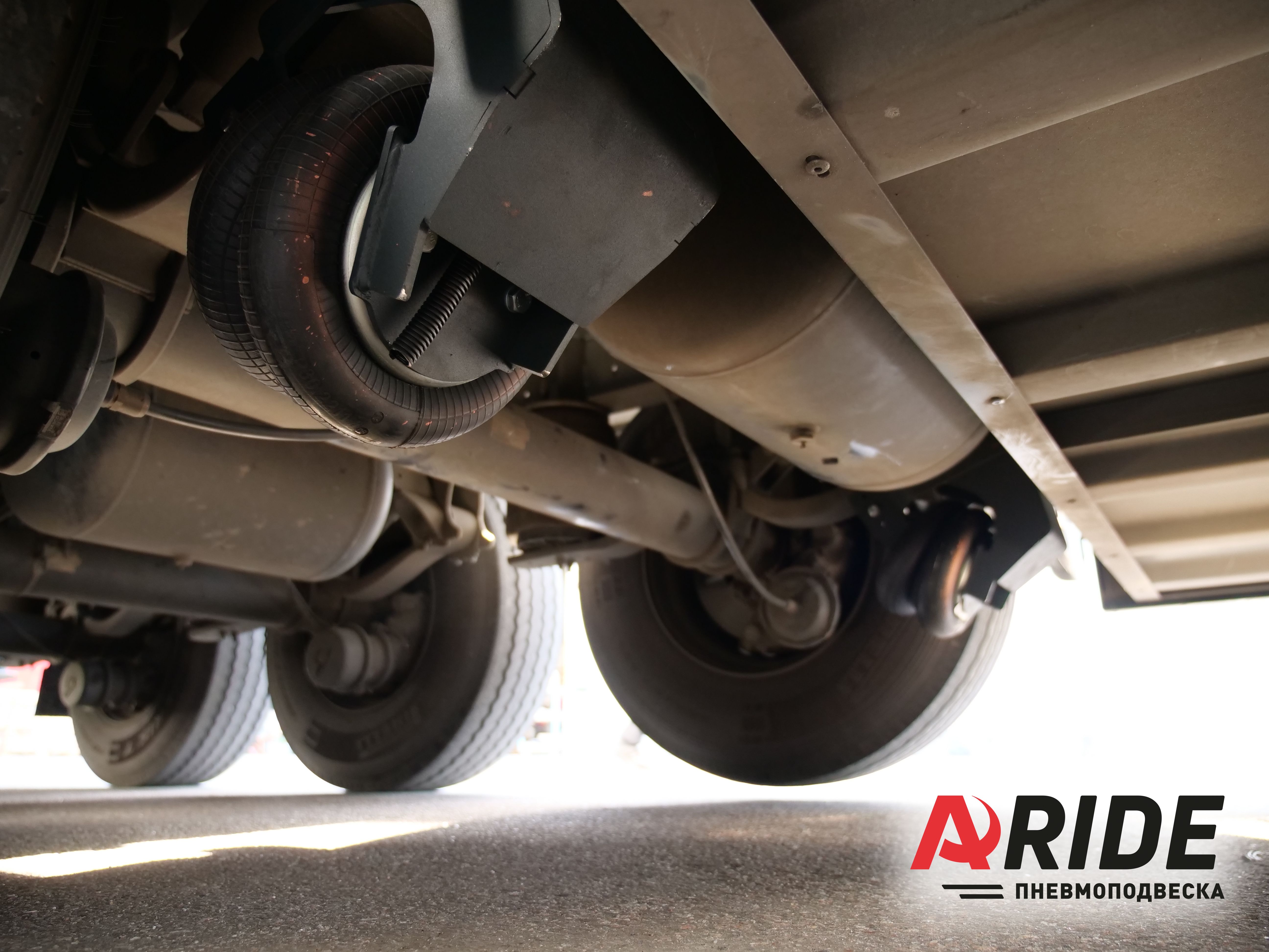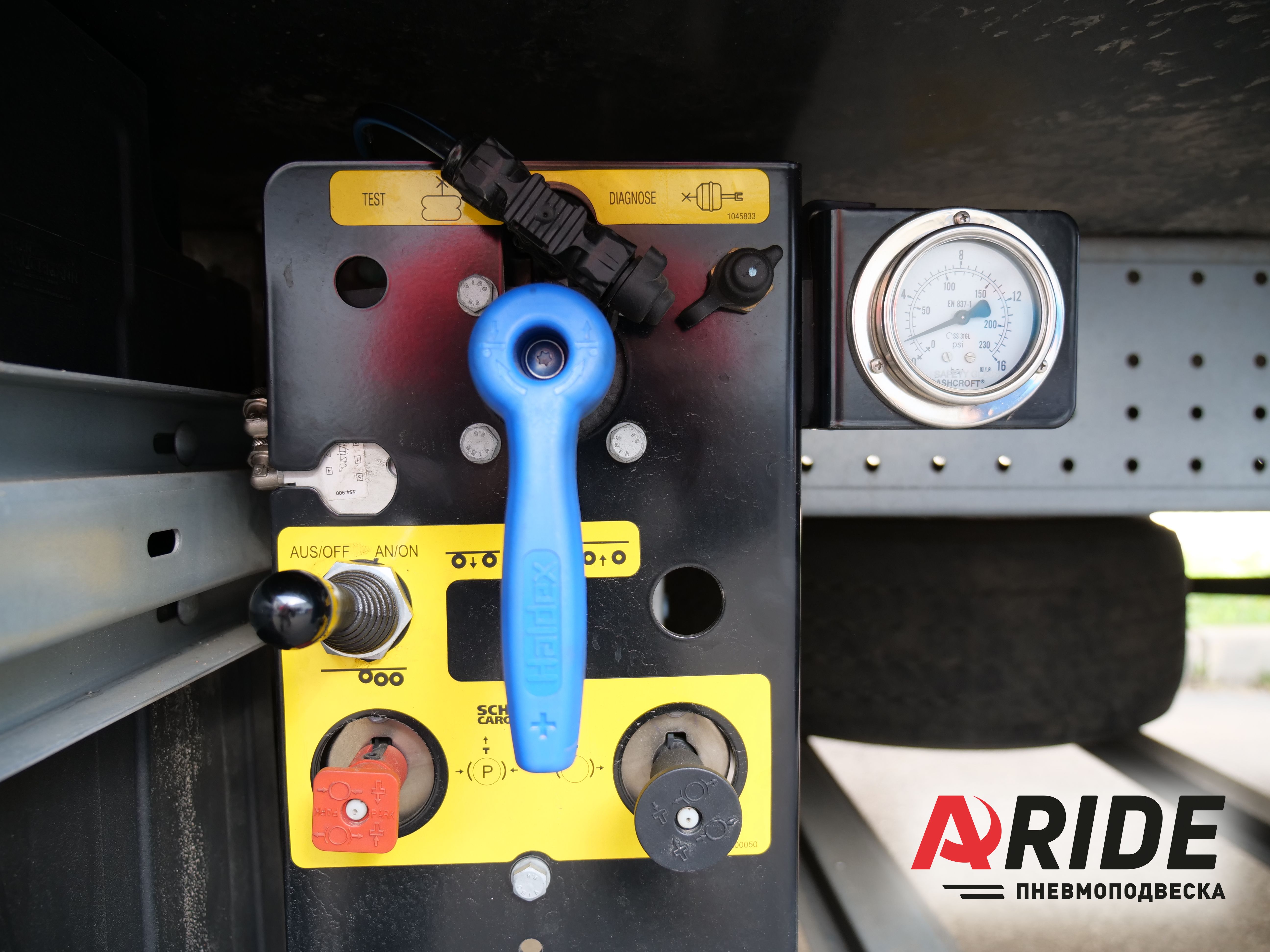 Подъём оси осуществляется за счёт раскрыва подушки под давлением. Именно за счёт давления пневмоэлемента на полурессору происходит подъём всей оси. Управление давлением в пневматических подушках осуществляется через специальную систему управления, которая так же была установлена на полуприцеп и подключена к заводской воздушной системе. Именно при помощи неё происходит спуск давления в заводских подушках рукавного типа, и накачка давления в пневматические подушки установленные для подъёма.