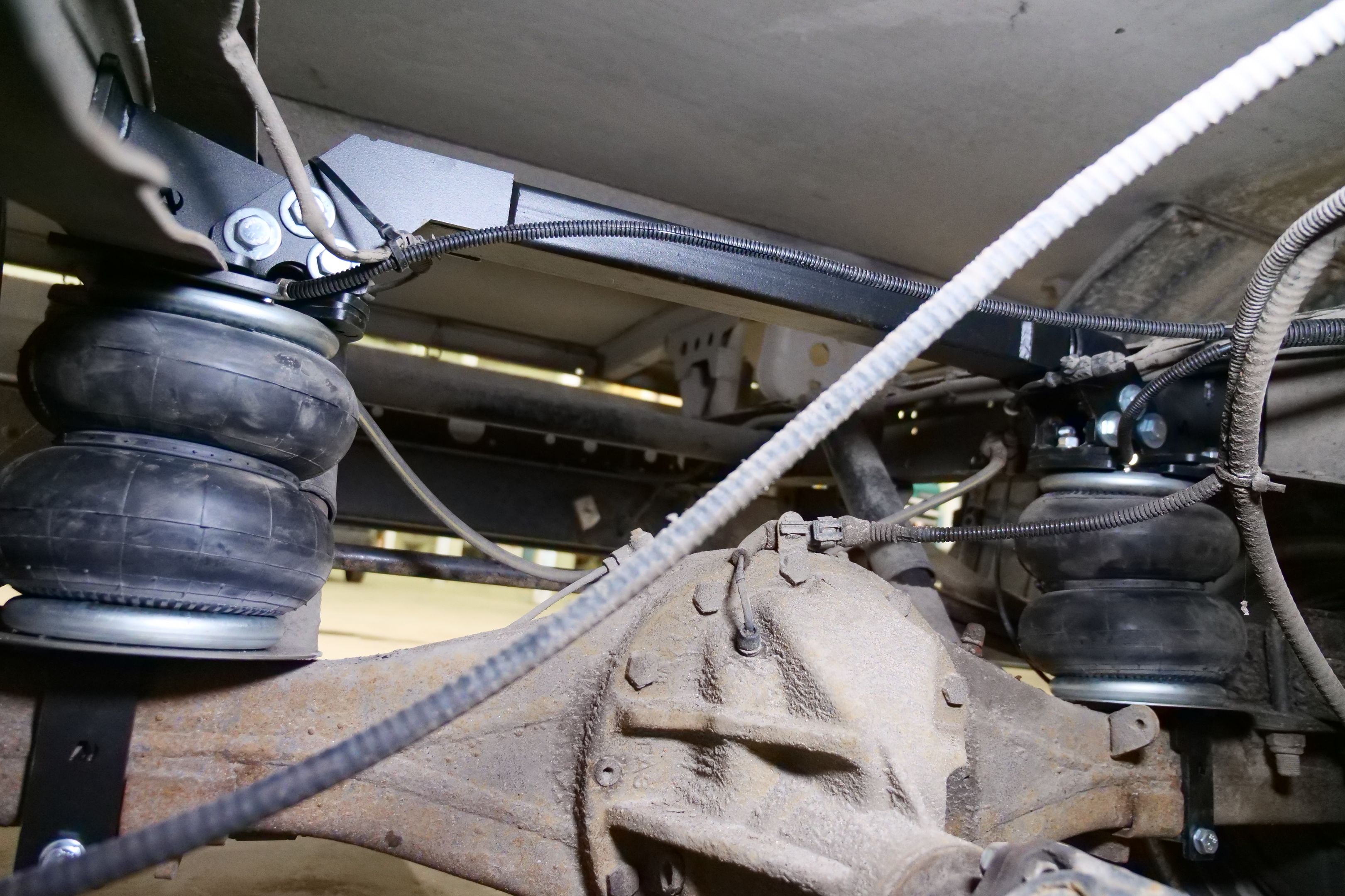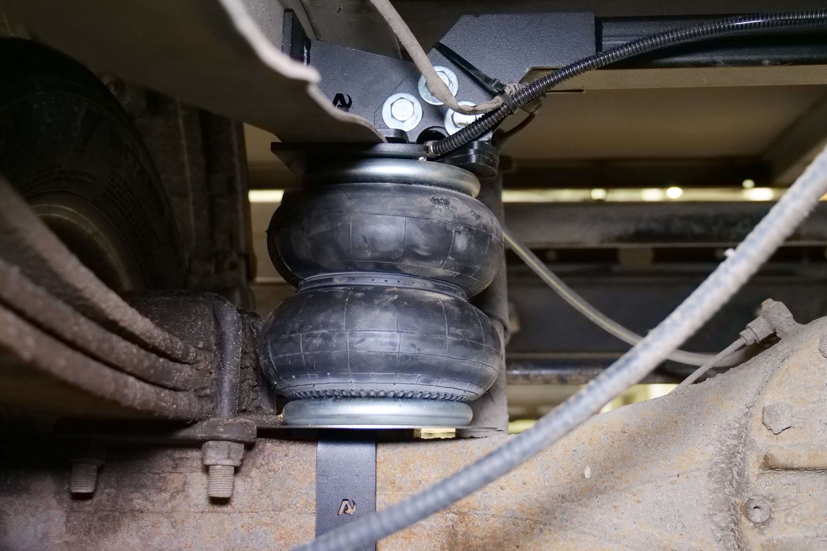 Для того что бы защитить задние рессоры от износа, на автомобиль устанавливаются пневмобалонны между рамой и мостом. На данный автомобиль устанавливаются подушки 180D1, каждая подушка способна поднять до 1500кг при давлении в 8 атмосфер. Снизу подушка притягивается к кронштейну, который в свою очередь крепится к мосту. Сверху же пневмоподушки так же притягиваются к кронштейнам, но у же крепятся к раме. Так же верхние кронштейны дополнительно соединяются поперечным усилителем, для придания большей жёсткости раме.
