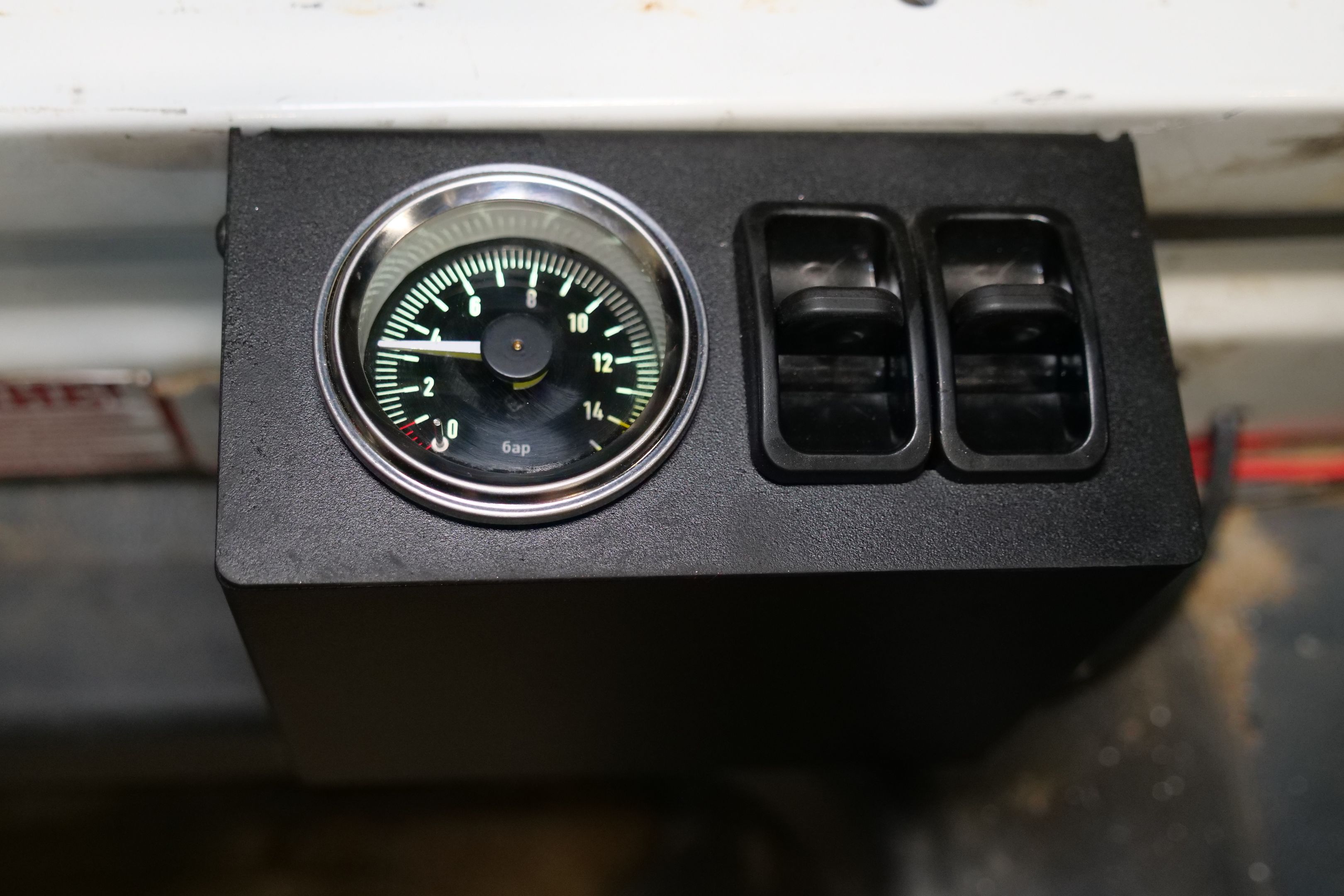 Отслеживание давления в подушках происходит при помощи двухстрелочного манометра, расположенного в специальном корпусе, слева от водительского сидения. Так же в этом корпусе располагаются две пневматические клавиши, при помощи которых можно регулировать давление в подушках.