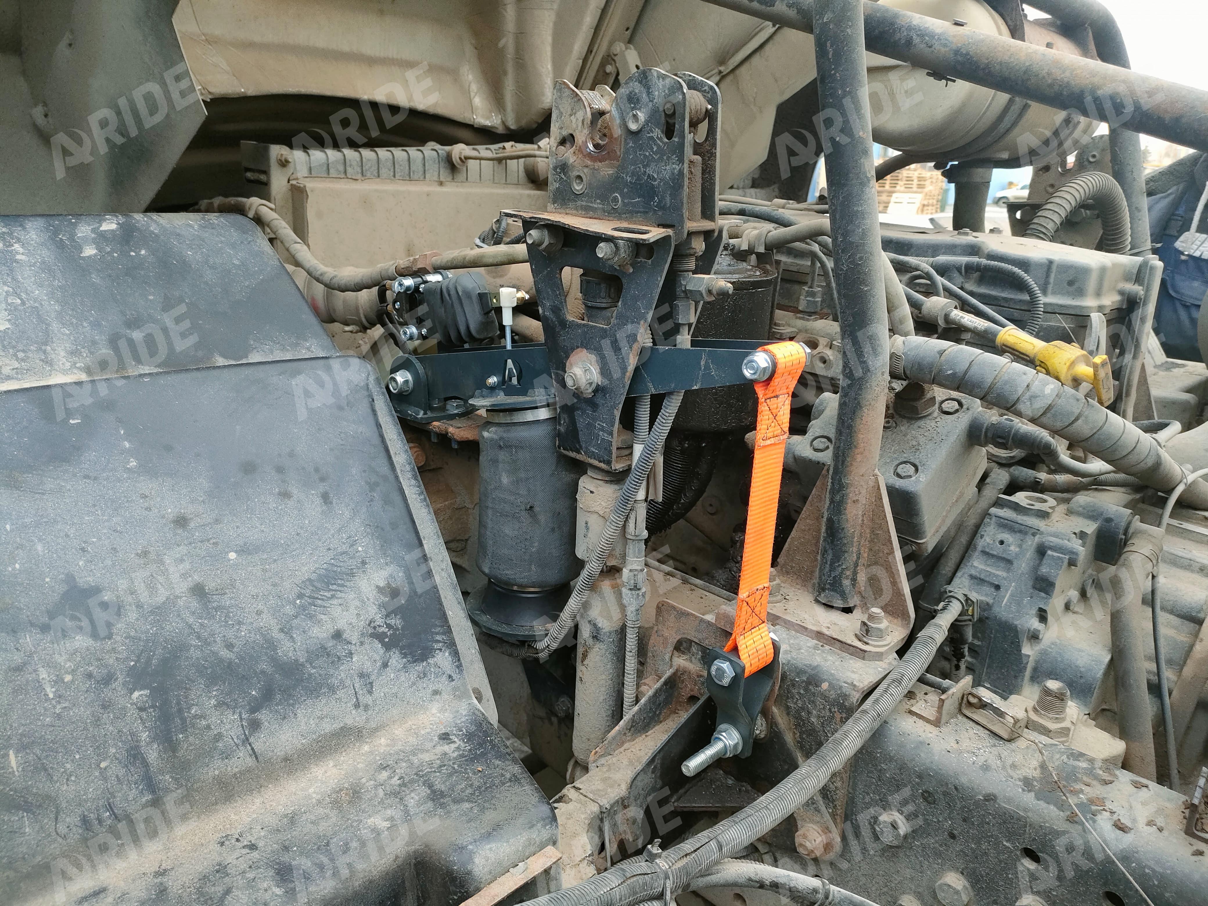 Также на автомобиль была установлена пневматическая подвеска на кабину. Ведь с завода грузовик оборудован рессорной подвеской кабины. Данный тип подвески отрицательно сказывается на комфорте водителя при эксплуатации транспортного средства, так как рессоры слишком жёсткие. При проезде любых неровностей возникают вибрации, которые моментально передаются на кабину. Для достижения максимального комфорта, данный рессорный пакет был заменён на комплект из пневматических подушек. Они устанавливаются на те же места, ровно в замен рессор. Для полноценного комфорта, регулировка клиренса и жёсткости происходит через кран уровня пола, установленный так же между рамой и кабиной. Эксплуатация КАМАЗа становится намного приятнее, так как пневматические подушки полностью гасят все вибрации и раскачку, которые приходятся на кабину.