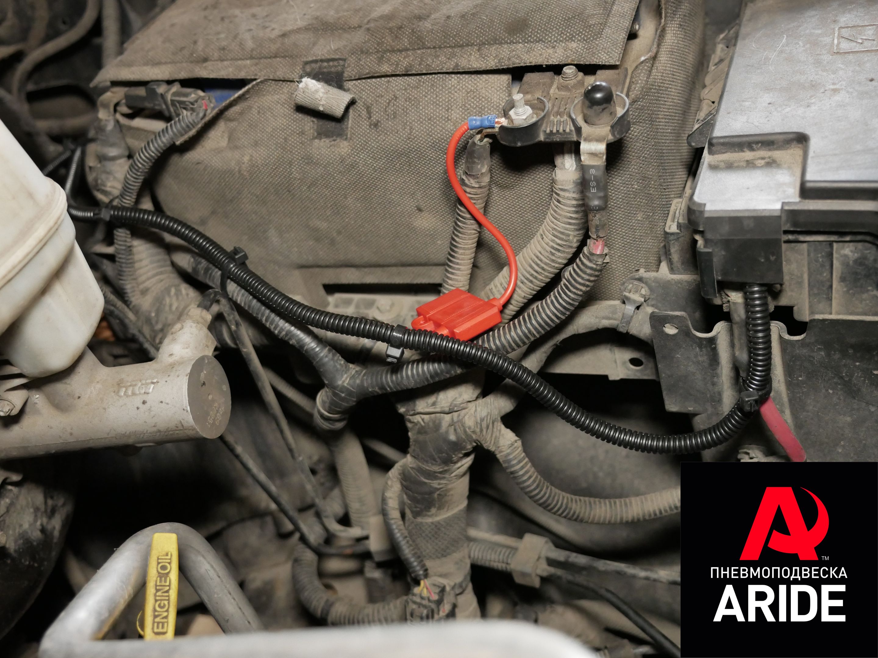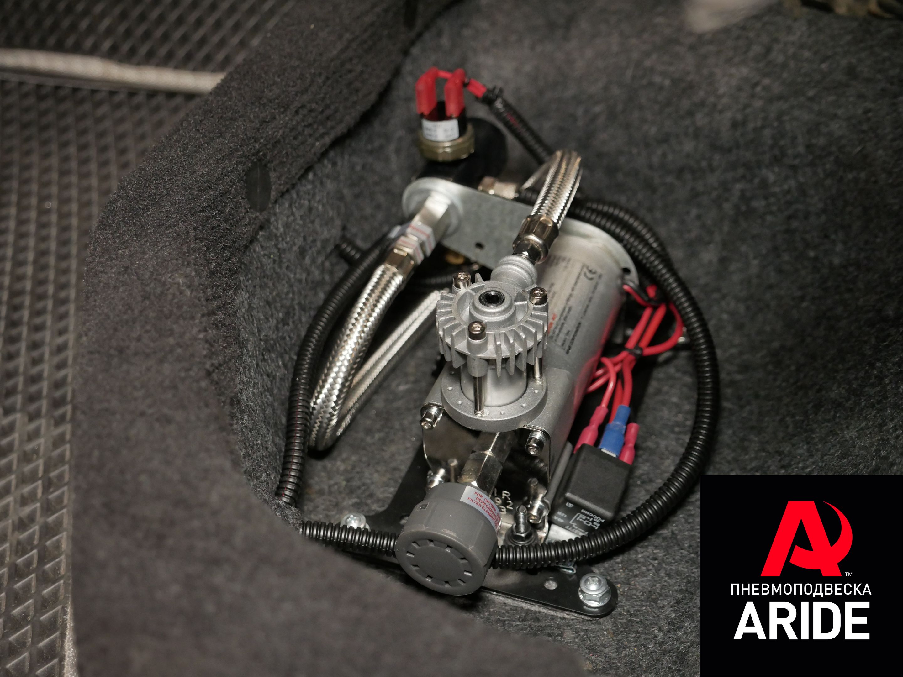 В данном случае, компрессор был убран под задний ряд сидений, все провода аккуратно подведены к нему от зажигания и аккумулятора.