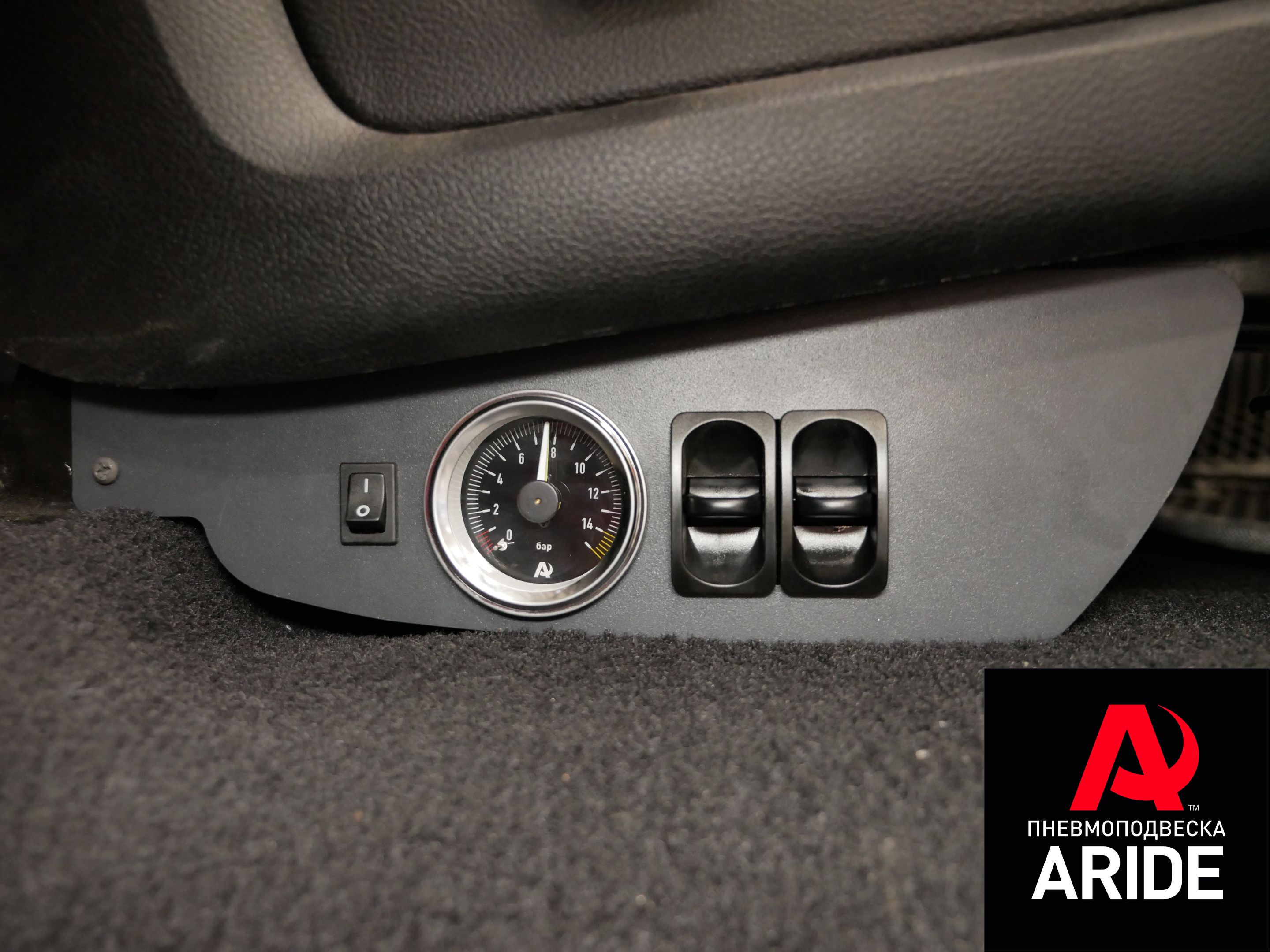 А манометр и две пневмоклавиши, наши мастера для удобства расположили под водительским сидением. Тем самым они не занимают полезного места и очень удобны в эксплуатации.