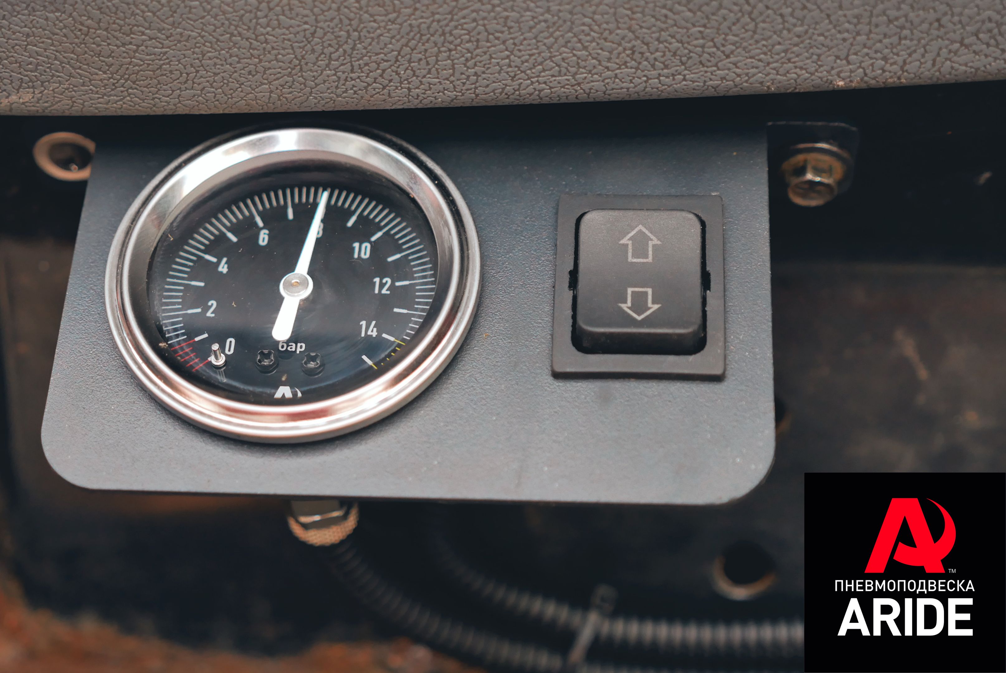 Для управления пневмоподушками была выбрана одноконтруная система управления 1.Simple. Эта система оборудована компрессором ARIDE 100. Данный компрессор имеет очень высокие технические характеристики, и легко справится с накачкой двух пневмопэлементов до 8 атмосфер на данном авто. Так же эта система управления включается в себя манометр с подсветкой, и электрическую клавишу, которая управляет клапанами спуска и накачки.