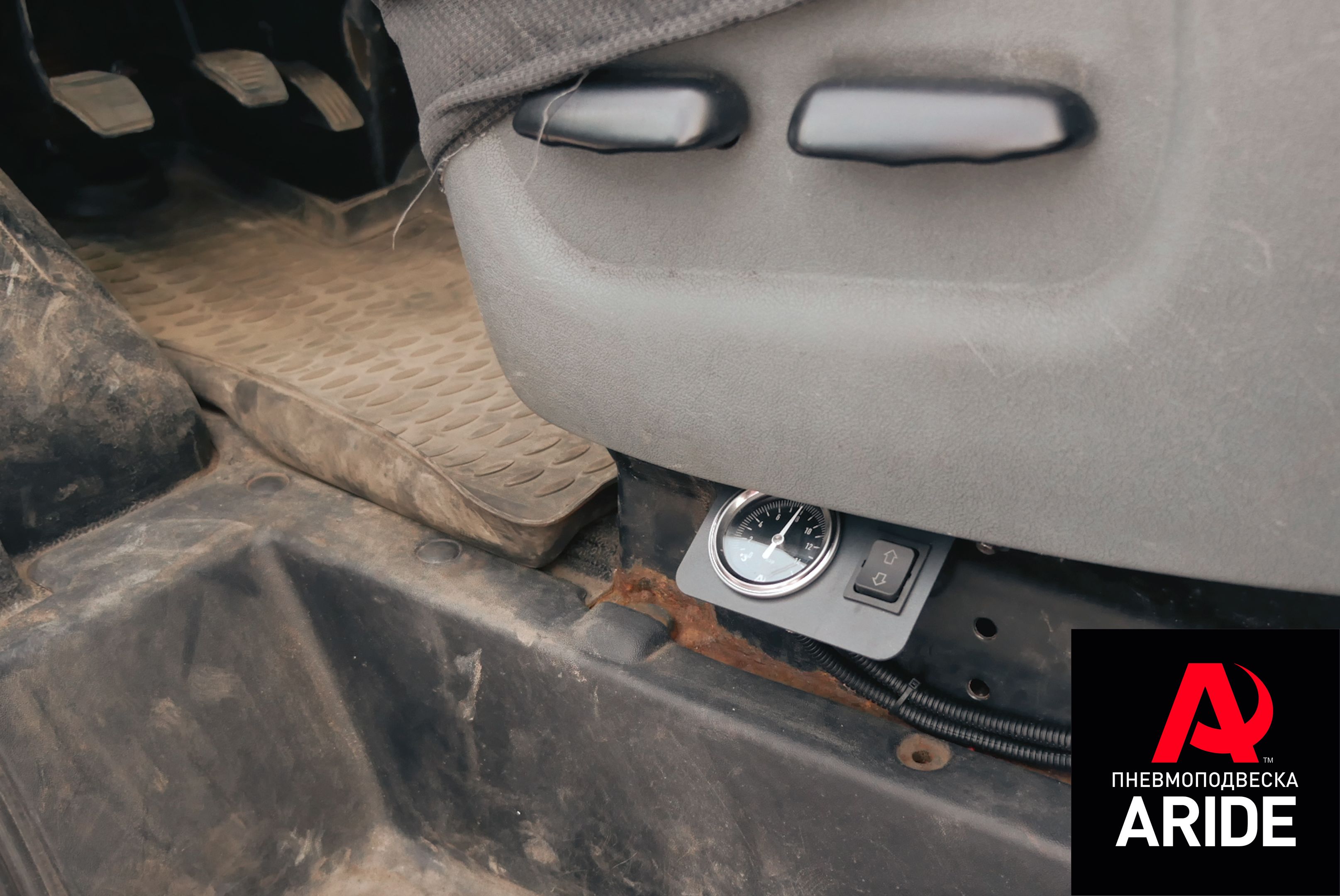 Компрессор расположили между пассажирским сидением и задней стенкой кабины. А манометр с клавишей, для удобства вывели слева от водительского сидения.
