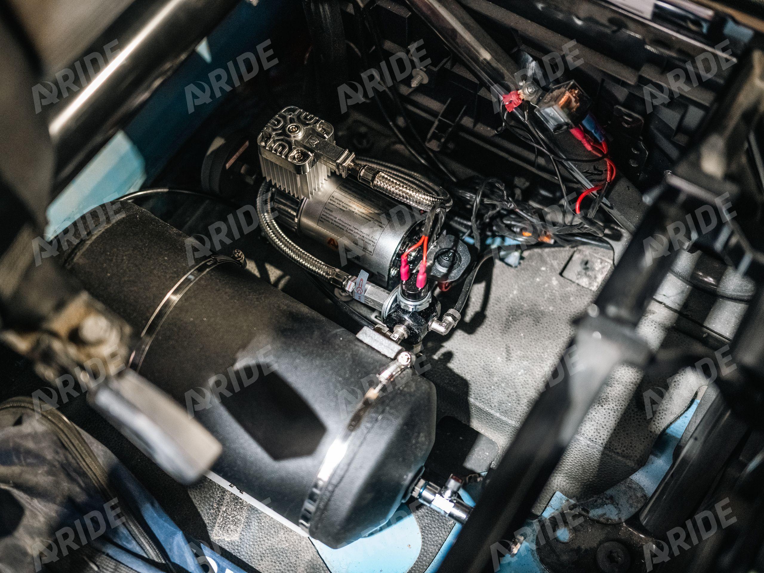 Так же на этот автомобиль была установлена двухконтурная система управления, которая позволяет дистанционно регулировать давление в каждой подушке, а в следствии - мягкость, жёсткость и клиренс. Все ключевые компоненты (ресивер, компрессор и т.д.) данной системы управления были расположены под пассажирским сидением. Сам блок управления (манометр и пневматические клавиши) был установлены рядом с водительским сидением, для удобства пользования.