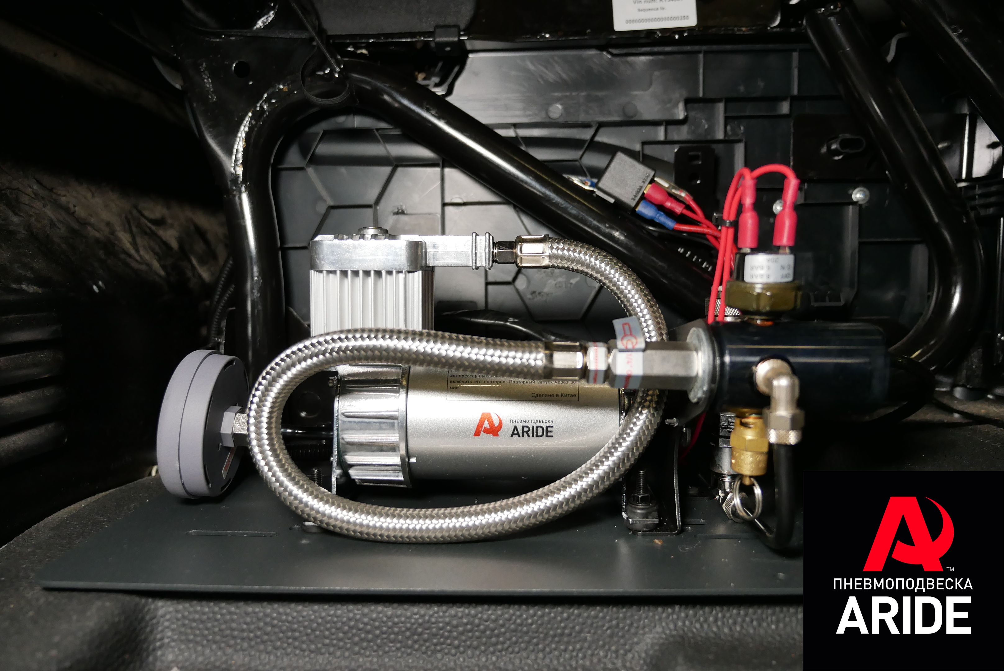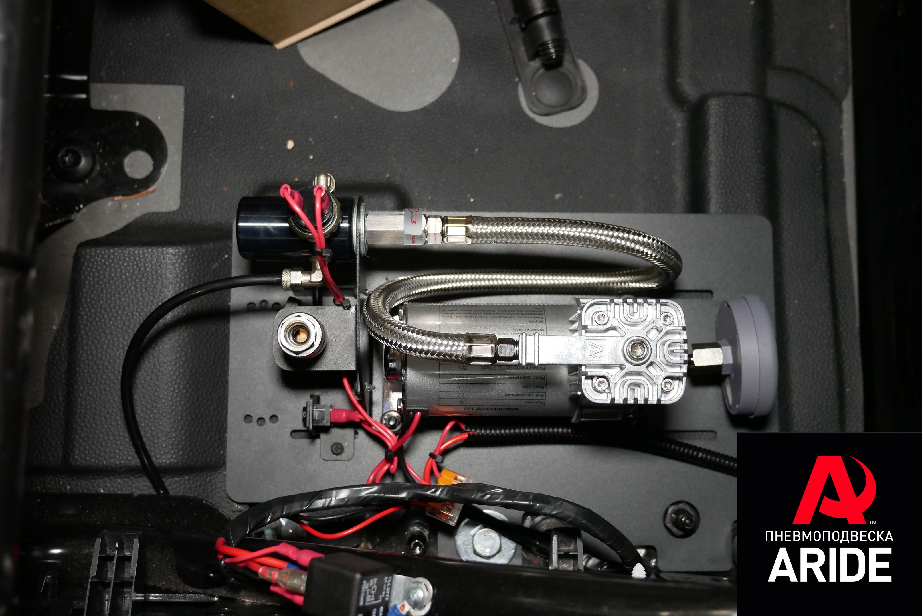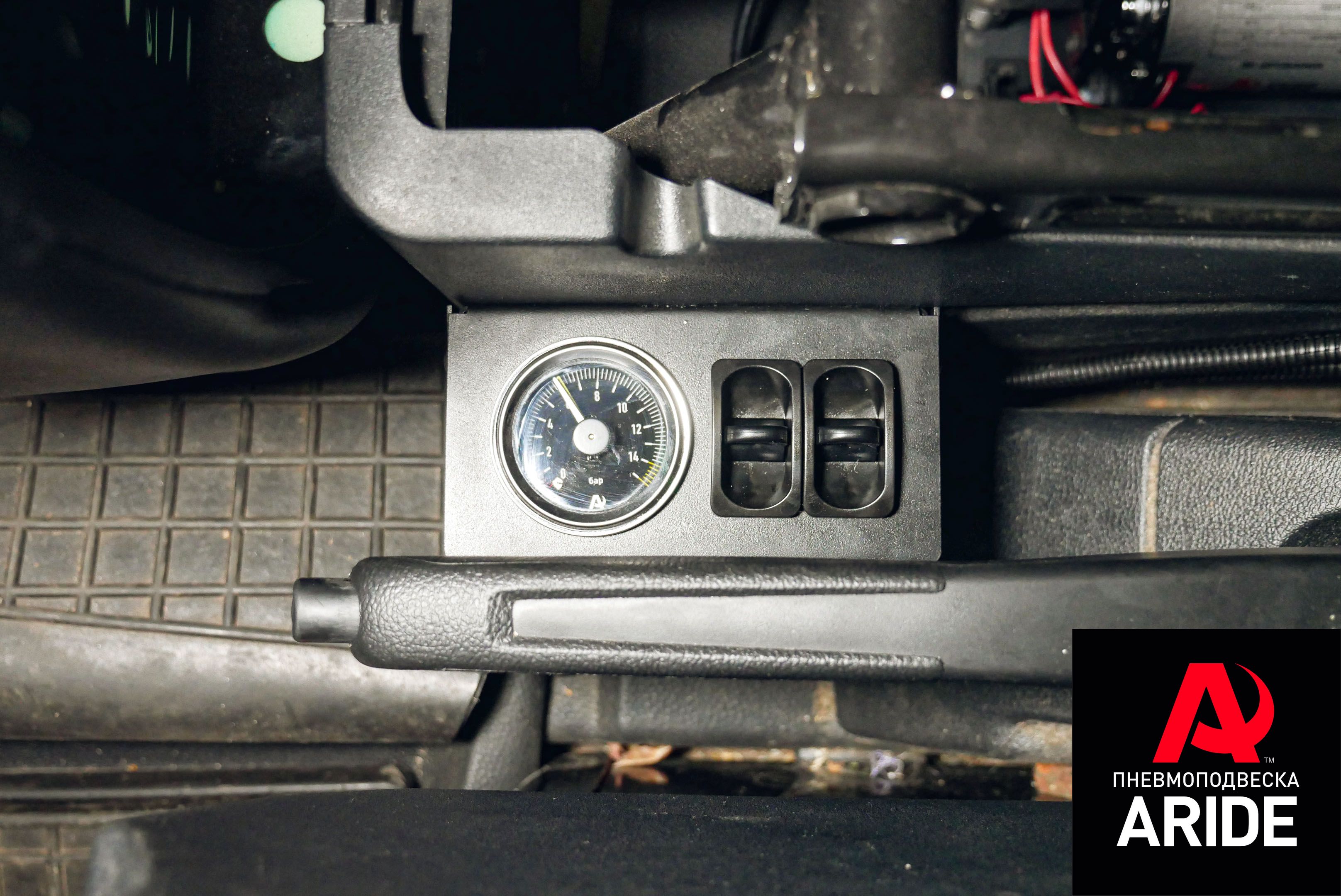 А для управления подушками, нашими мастерами была установлена двухконтурная система управления 2.Optimal.92. Компрессор разместился под пассажирским сидением, а по просьбе клиента мы установили двухстрелочный манометр и две пневмоклавиши между водительским сидением и пассажирским. Манометр с подсветкой, так что его будет отлично видно и днём и ночью. Подсветка реализована за счёт встроенного диода, который работает как и вся система управления, исключительно от зажигания.