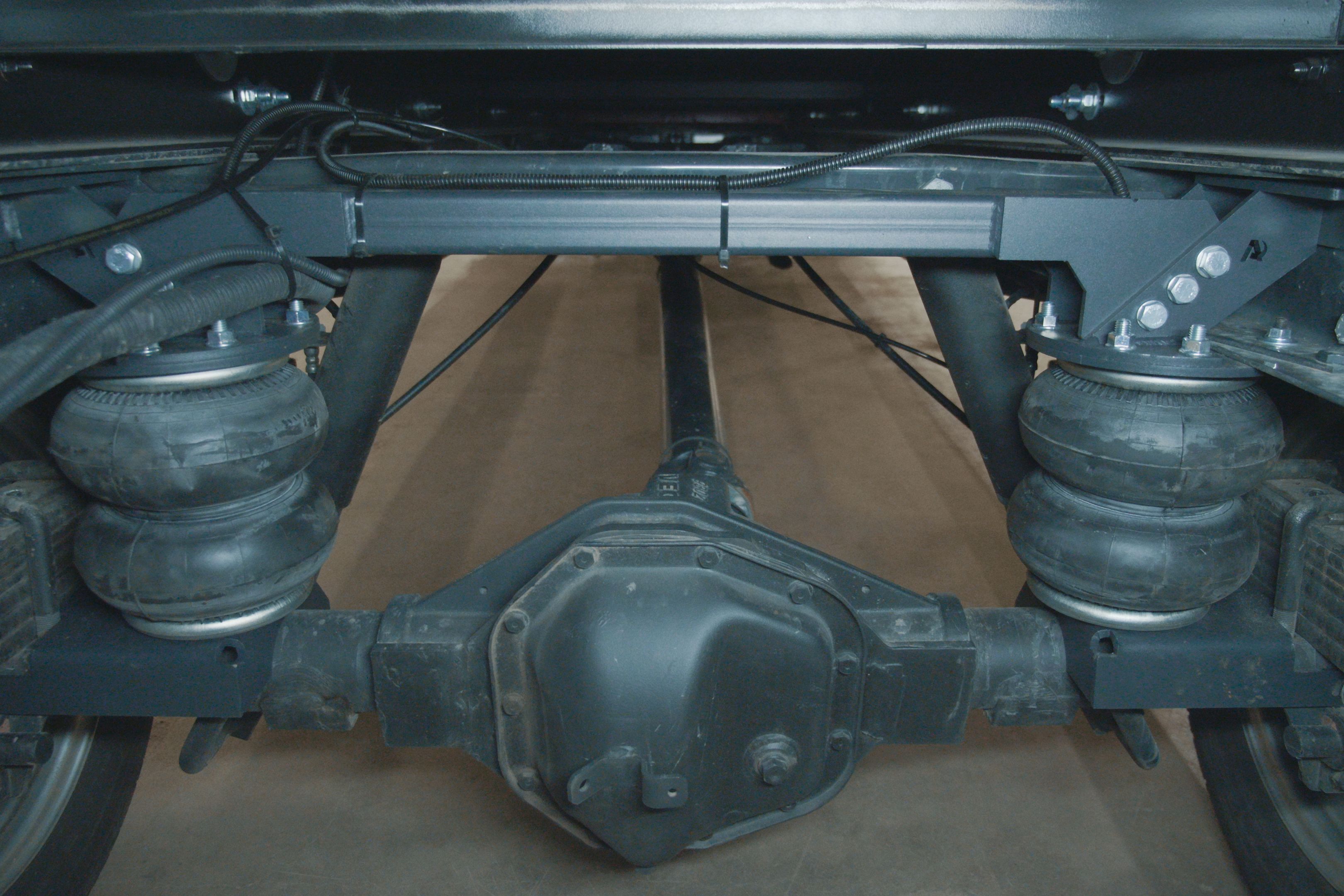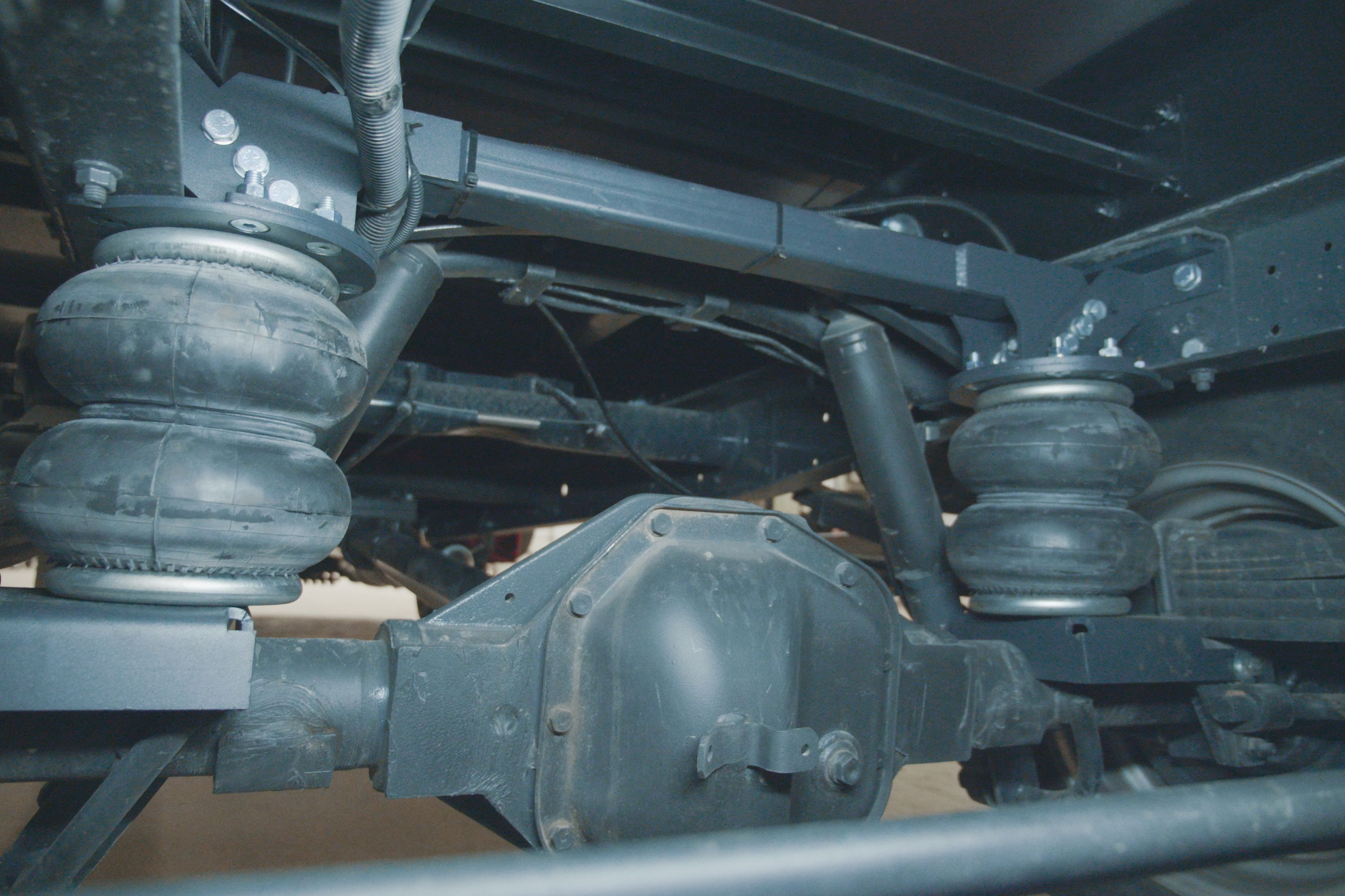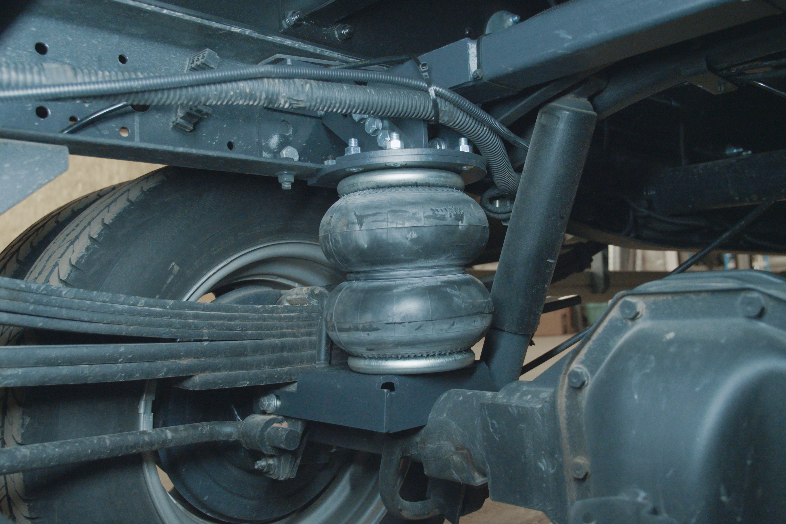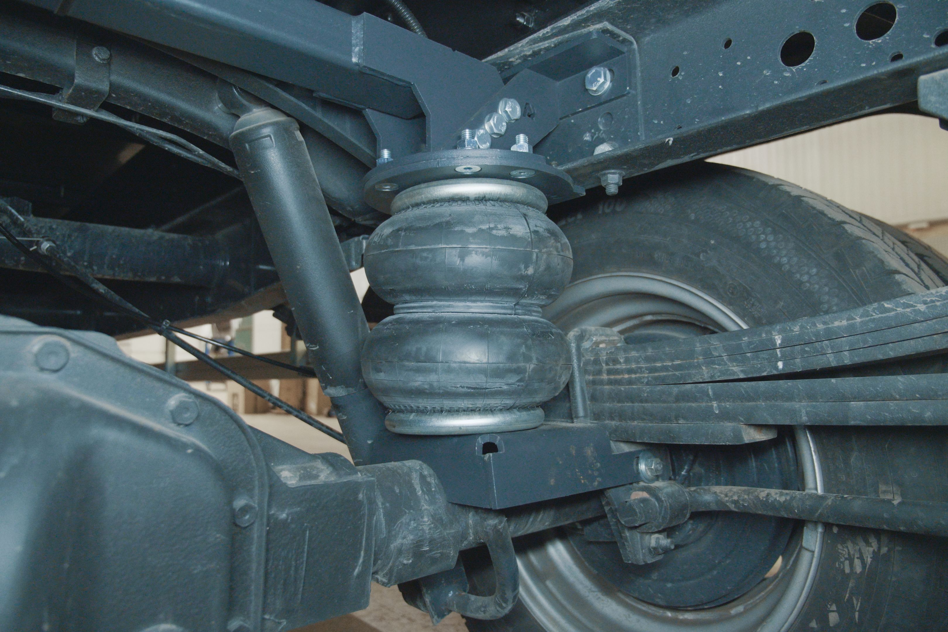 Нами был установлен усиленный комплект вспомогательной пневмоподвески на заднюю ось. Верхние кронштейны устанавливаются в раму и крепятся за счёт болтов в штатные отверстия в раме. Два верхних кронштейна связаны между собой поперечным усилителем, для того чтобы исключить вращающий момент, создающийся на раме. Нижние кронштейны обхватывают мост, и так же крепятся к нему за счёт болтов в штатные проушины в мосту.