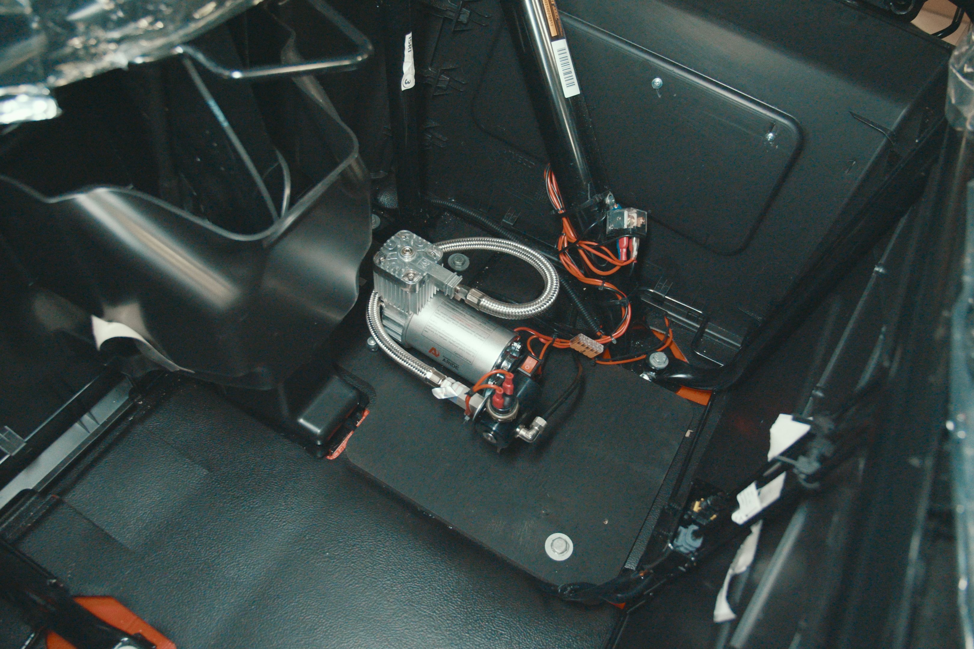Так же была установлена двухконтурная система управления 2.Оптимал. Ключевой её особенностью является компрессор ARIDE 100, который в кратчайшие сроки способен накачать давление в подушки. Максимальное давление 8 атмосфер. Пульт управления - манометр и две пневмоклавиши, для удобства были расположены справа от водительского сидения. Двухконтурная пневмоподвеска даёт возможность регулировки каждой подушки отдельно, тем самым можно регулировать клиренс на каждой стороне, выравнивать машину при неравномерной загрузке, уменьшить валкость при езде.