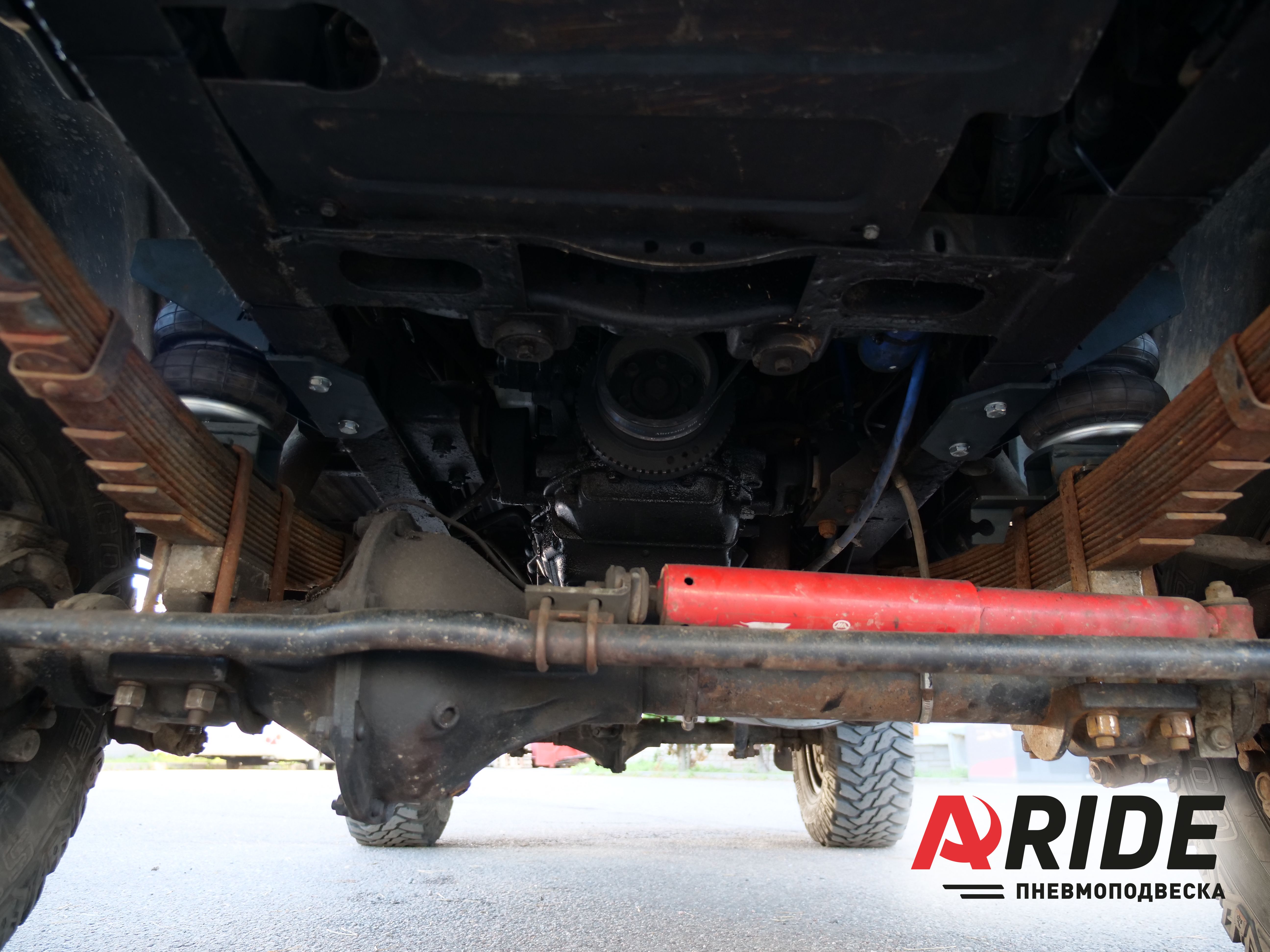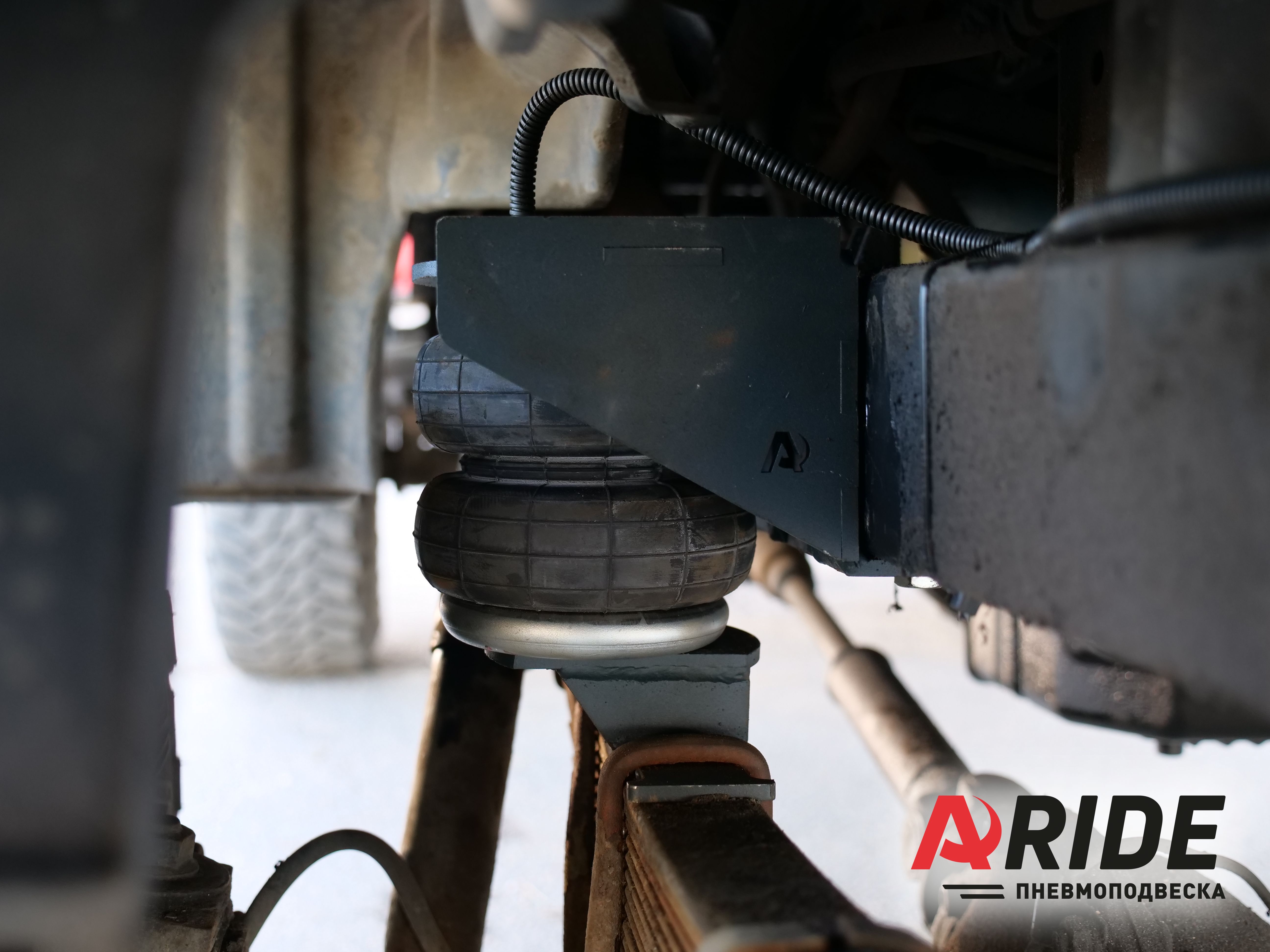 Верхние кронштейны монтируются на раму, а нижние устанавливаются на рессорный пакет. Между двумя кронштейнами устанавливаются пневматические подушки. Трубка выходящая из пневмоподушек, прокладывается вдоль рамы, и заходит в салон. По желанию клиента, ниппеля подкачки были установлены на центральную консоль.