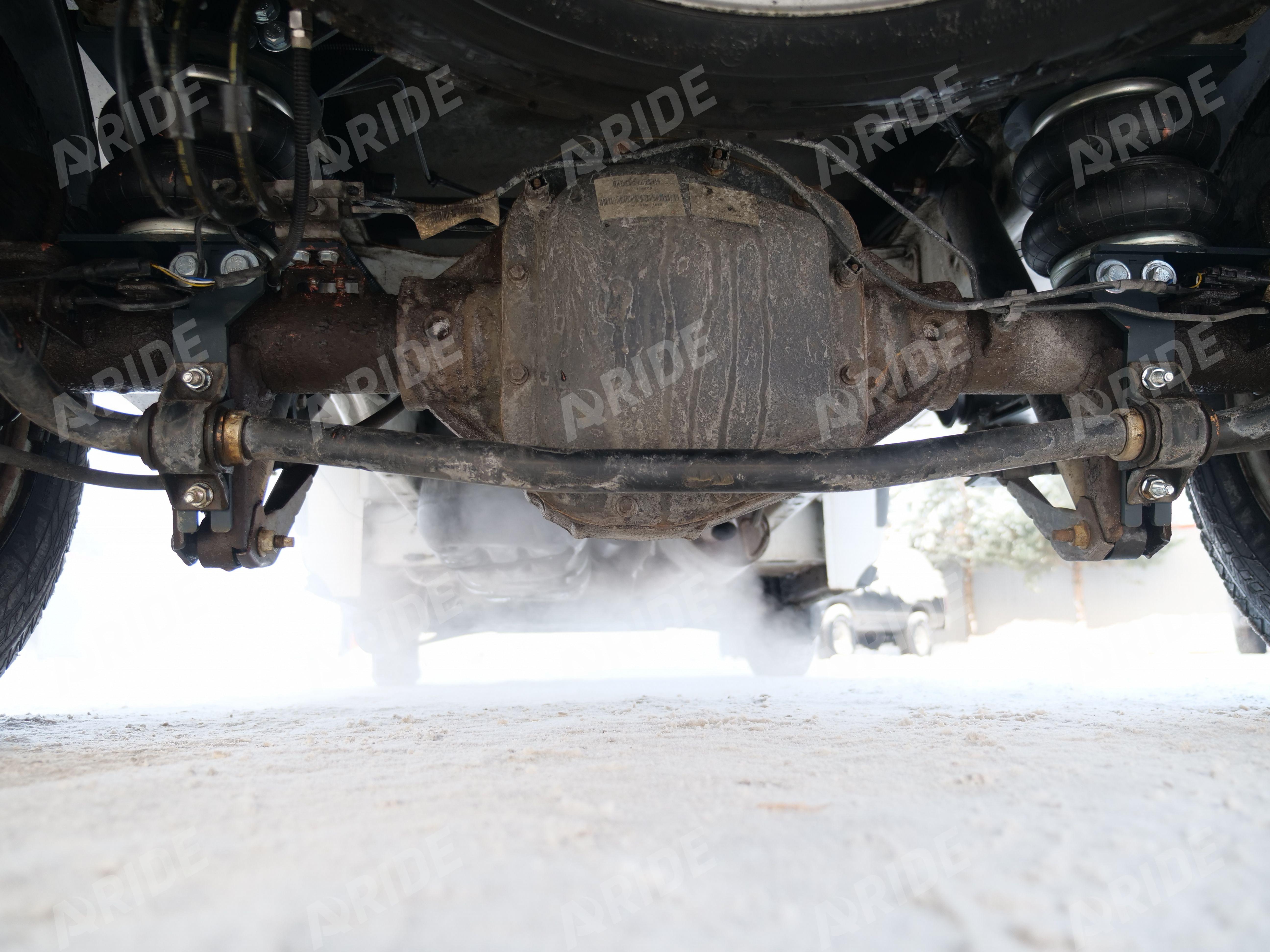 Установка вспомогательного комплекта пневматической подвески на автомобиль Ford Transit 7-го поколения. На данном автомобиле, пневматические подушки устанавливаются на задний мост. Основной их задачей является - снятие нагрузок с заводских рессор. Так как пневматические подушки устанавливаются между рамой и задним мостом, они работают совместно с заводским пакетом рессор. При давлении в 8 атмосфер, каждая установленная подушка способна компенсировать до 1500 килограмм. Обе пнемоподушки установлены и закреплены на автомобиле при помощи кронштейнов. Монтаж верхних кронштейнов производится после демонтажа заводского отбойника, вкрученного в раму. Верхние кронштейны одеваются на раму, и крепятся к ней, через заводскую закладную гайку, установленную внутри рамы. Так же два верхних кронштейна связаны между собой, при помощи поперечного усилителя, который снижает вращающий момент, возникающий на раме. Нижние кронштейны крепятся к мосту, через отверстия для крепления стабилизатора.
