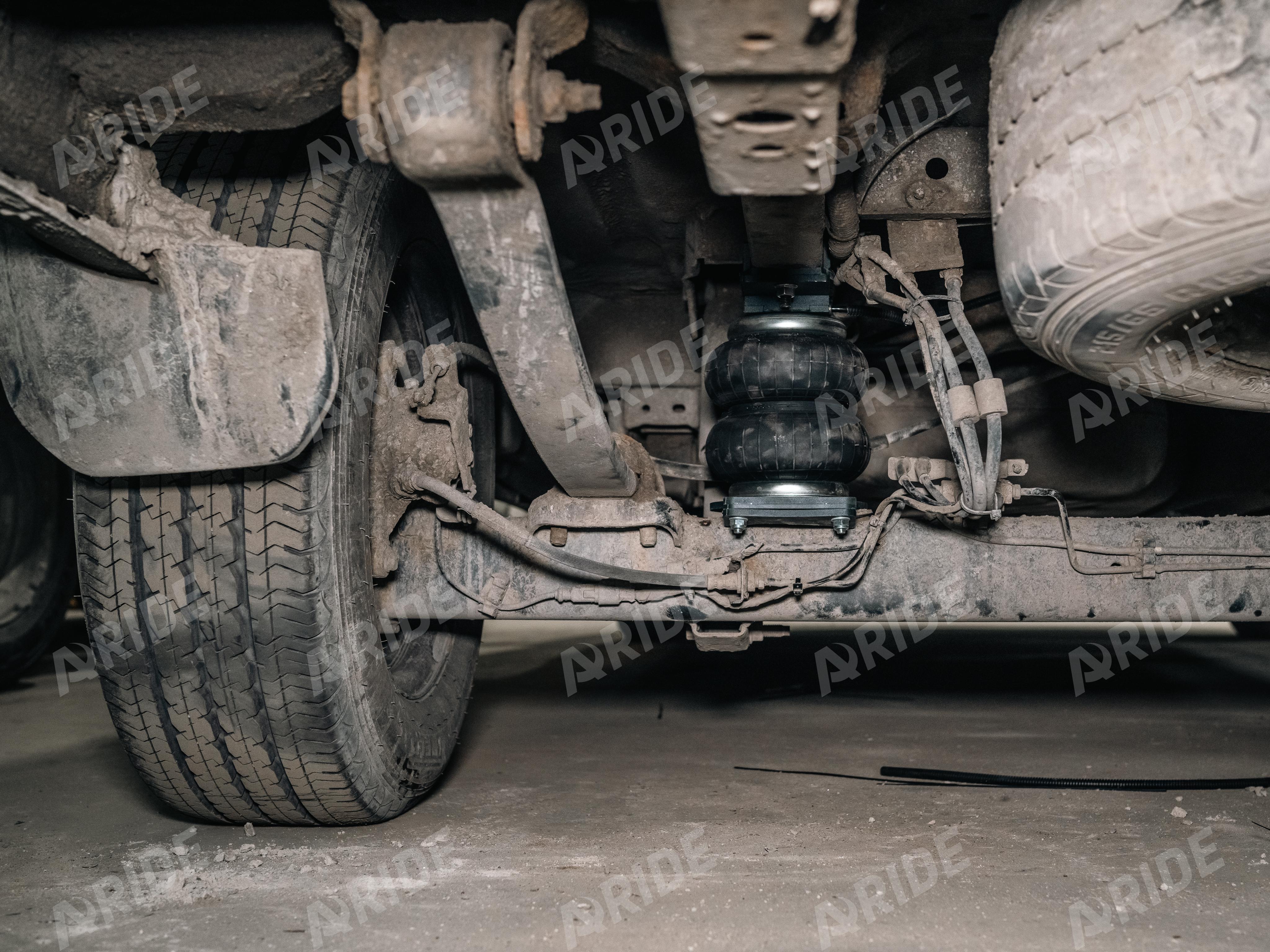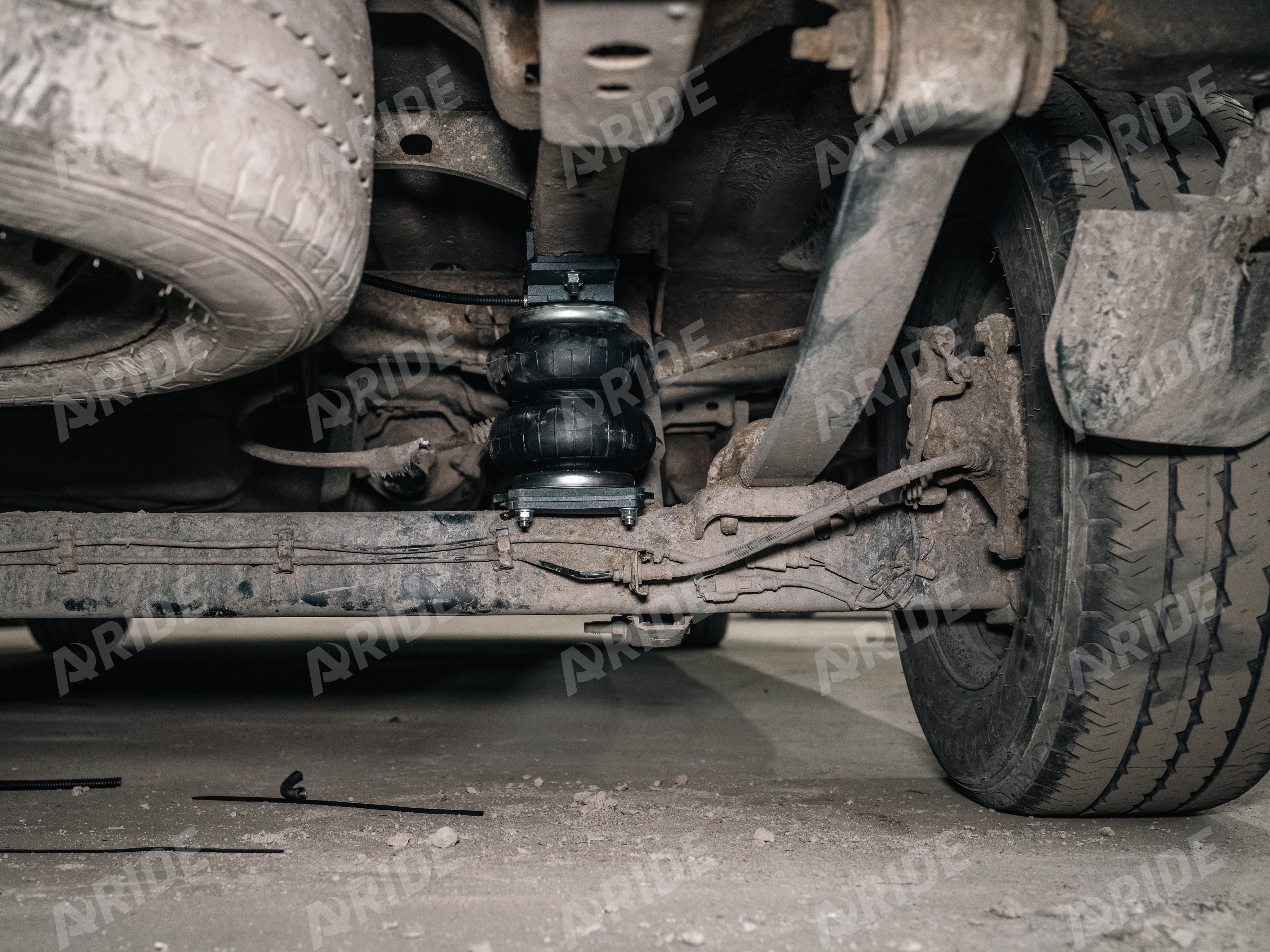 Комплект был установлен в дополнение к заводским рессорам. Монтаж пневматических подушек осуществлён при помощи специальных кронштейнов, которые изготавливаются под данное поколение автомобилей Форд Транзит. Кронштейны крепятся к интегрированной раме, через заводское крепление для отбойника, нижняя же часть устанавливается на балку, и кронштейны притягиваются к балке через заводской подпятник.