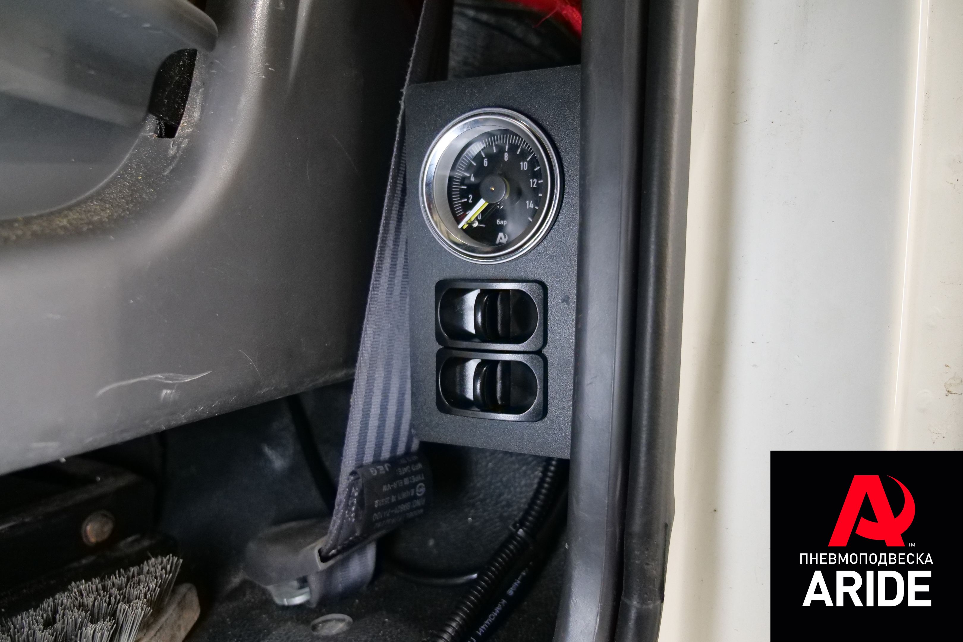 Доброго времени суток. К нам на установку приехала довольно таки интересная машина Huyndai HD 120. Автомобиль оборудован большим и тяжёлым изотермическим фургоном, который в свою очередь оказывает большой вес на пакет задних рессор. В силу большого веса, рессоры начинают быстро изнашиваться и "проседать". Для решения данной проблемы нами был разработан и установлен совершенно новый комплект вспомогательной пневмоподвески на заднюю ось. Комплект изготовлен из 6мм стали, он полностью повторяет все контуры заднего моста и идеально прилегает ко всем поверхностям редуктора, что в свою очередь предотвращает возможность смещения комплекта или подушек. Так же верхняя часть комплекта оборудована поперечным усилителем, который предотвращает скручивающий момент, возникающий на раме в момент максимального давления пневмоэлементов на верхнюю часть рамы. Сам комплект оборудован двумя подушками 250/2, что в сумме дают 4000 кг грузоподъёмности на задней оси. Для управления вспомогательной пневмоподвеской, нами был установлен комплект системы управления 2.ОБ.ПС. Это хорошо всем знакомая двухконтурная система управления, главным плюсом которой является то, что она подключается к заводской воздушной системе, и не требует установки электрического компрессора. Панель с манометром и двумя пневмоклавишами мы расположили на задней стойке, слева от водительского сидения.