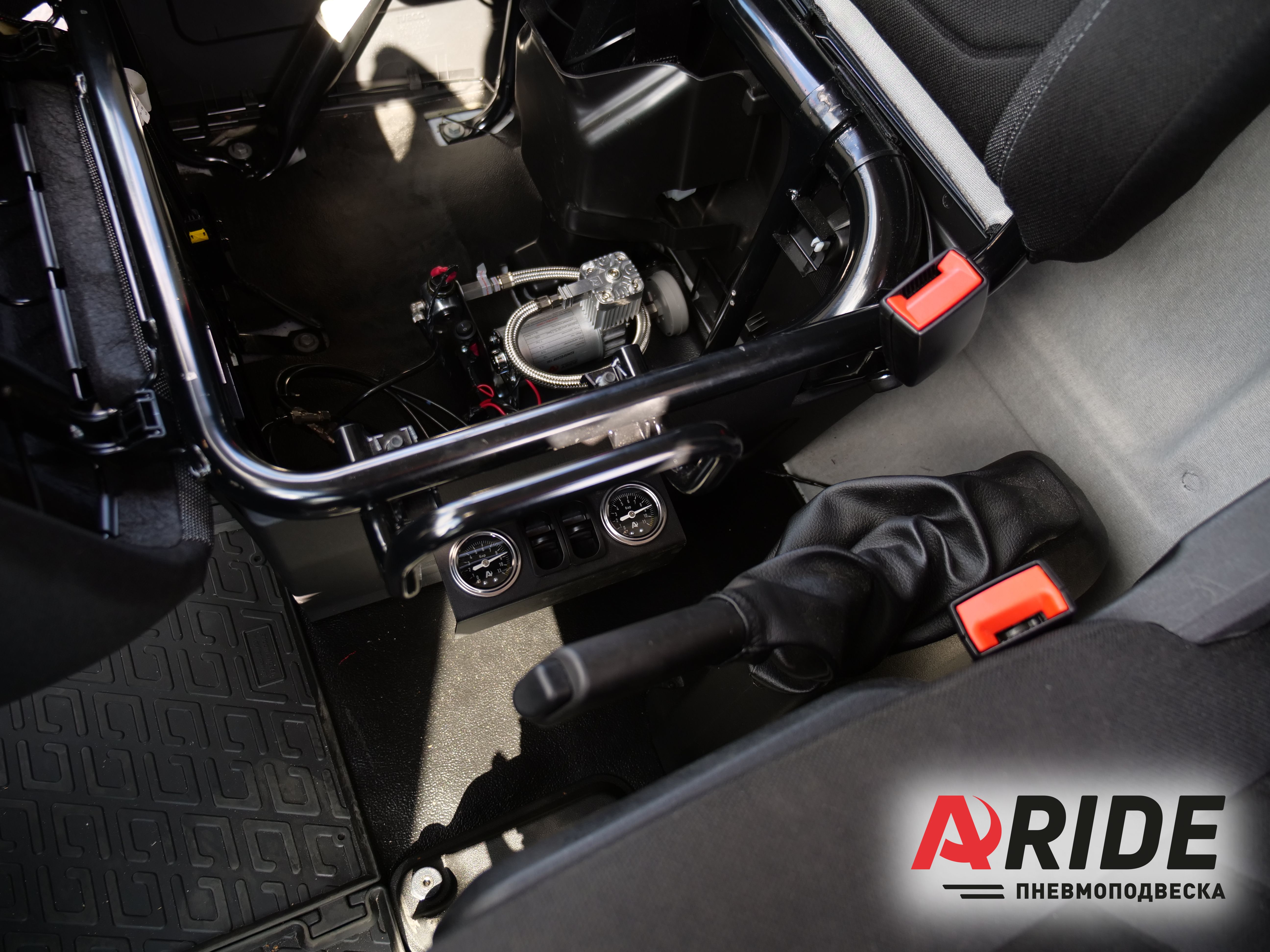Регулировка давления осуществляется при помощи двухконтурной системы управления. Компрессор был смонтирован под пассажирское сидение, а манометры расположены между водительским и пассажирским сидением. При помощи данной системы возможно регулировать давление отдельной в каждой пневматической подушке.