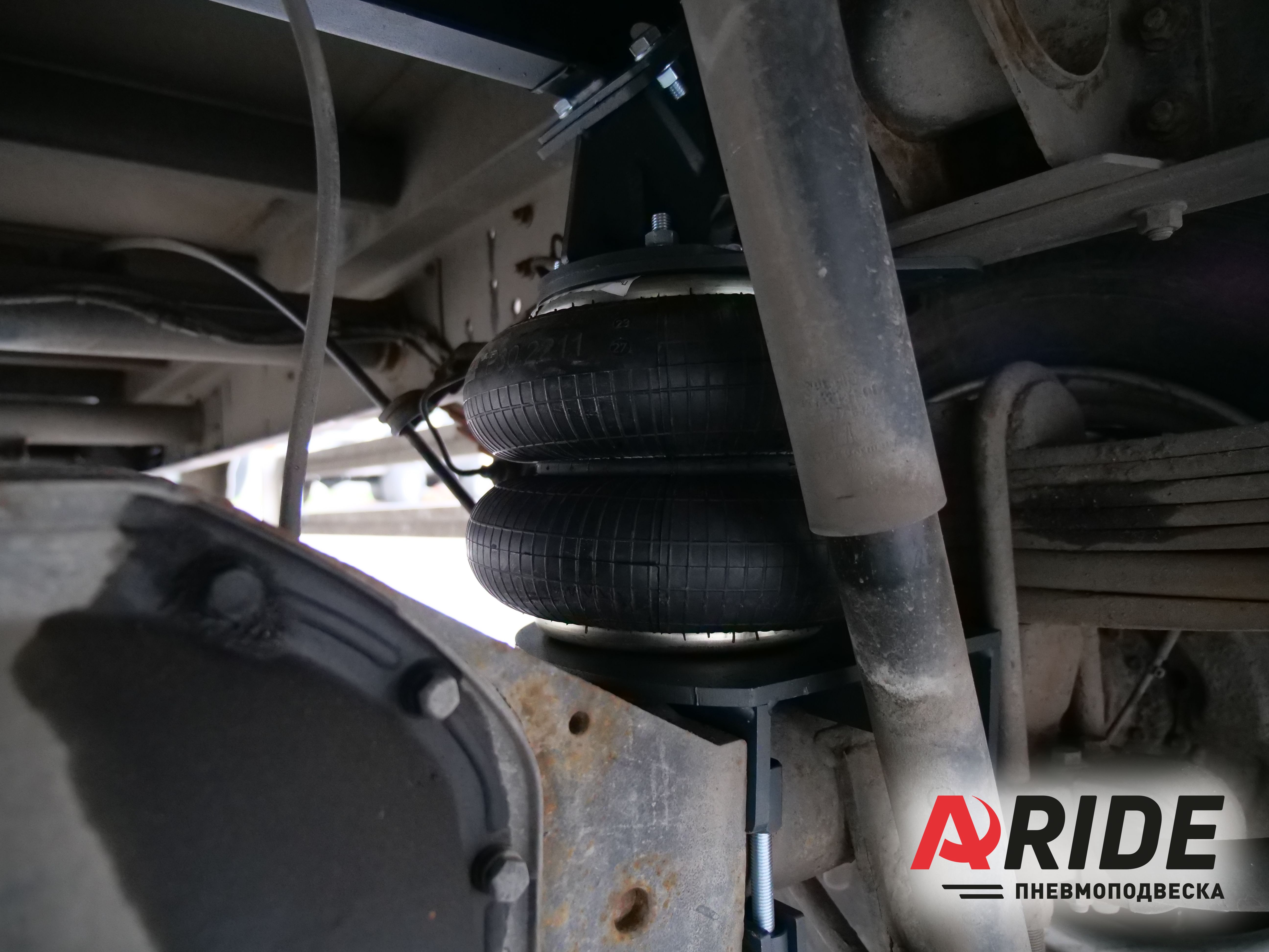Комплект был установлен на заднюю ось. В нём используются пневматические подушки 250/2, которые в паре способны компенсировать до 4000 килограмм нагрузки с заднего рессорного пакета. Для того что бы обеспечить высокую прочность и надёжность всей конструкции, кронштейны выполняются из стали, толщиной 6 и 8 миллиметров. Верхние кронштейны крепятся к раме, и притягиваются через заводские отверстия в ней.