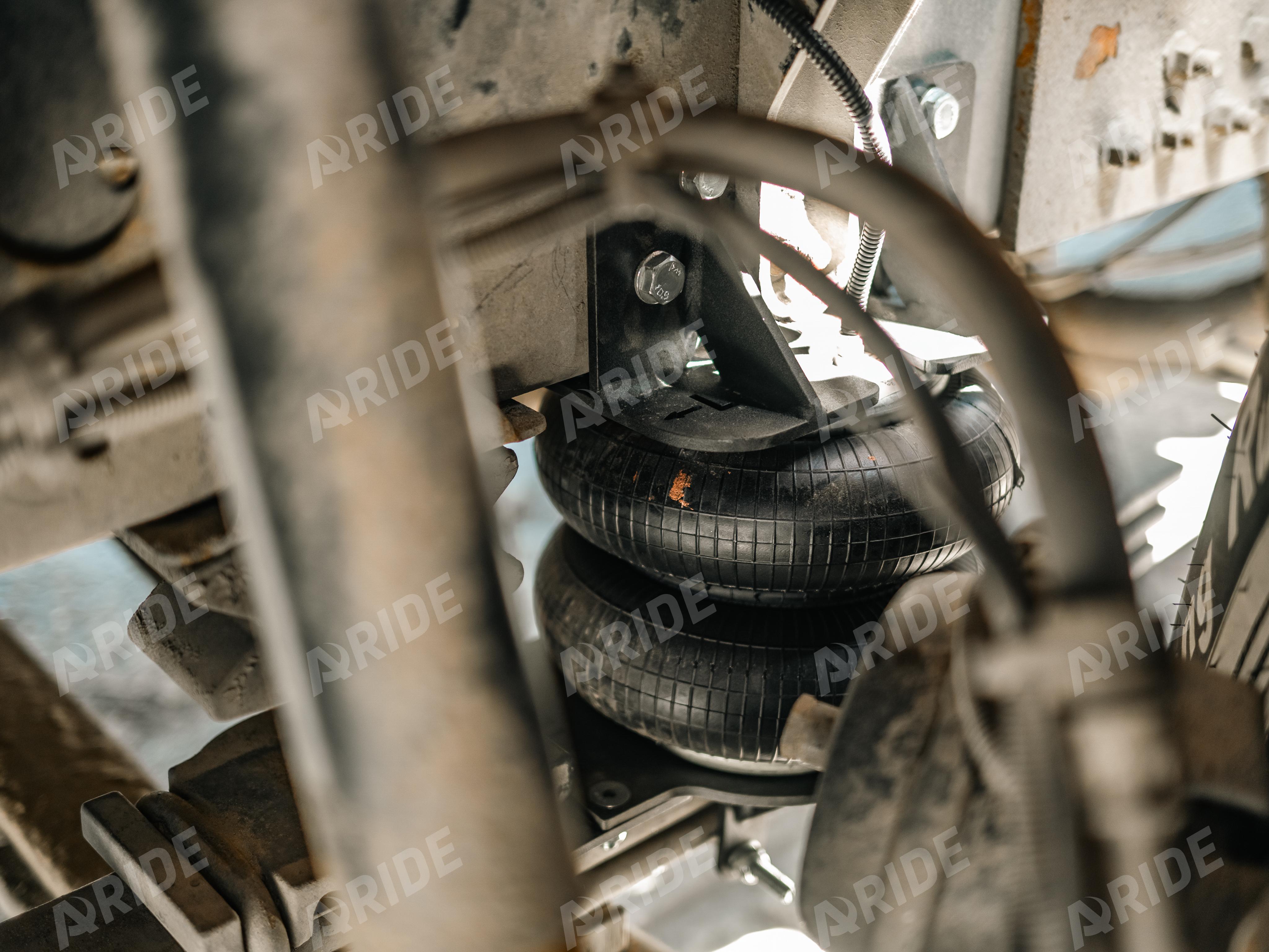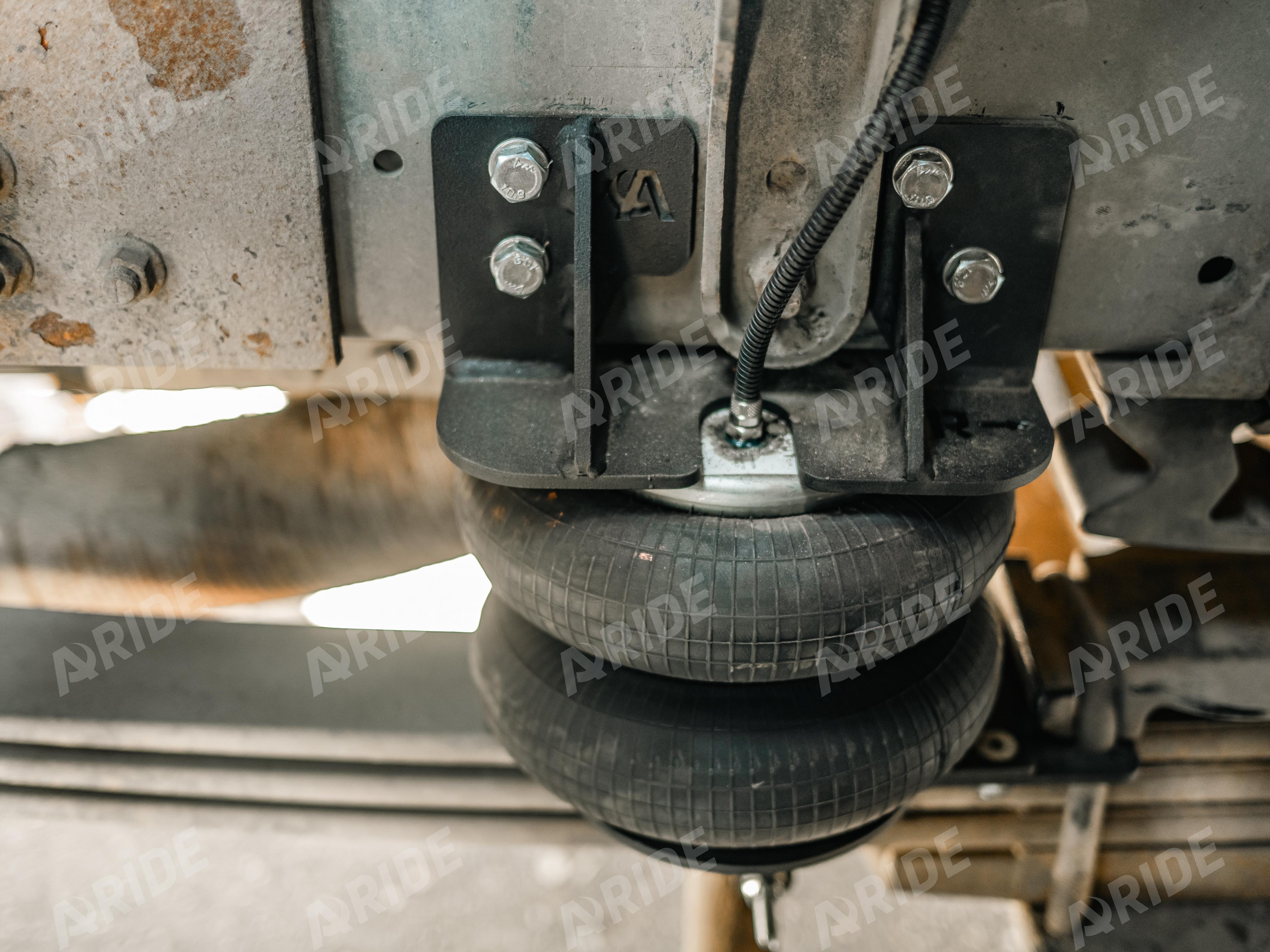 В нашем установочном центре была произведена установка вспомогательной пневматической подвески на переднюю ось автомобиля. Комплект был установлен между рессорным пакетом и рамой автомобиля. Центральная ось подушки была смещена относительно оси балки, для рационального использования всего потенциала пневмоподушки (рабочего хода). Так же при установке данного комплекта, сохраняется заводской отбойник, установленный на раме.