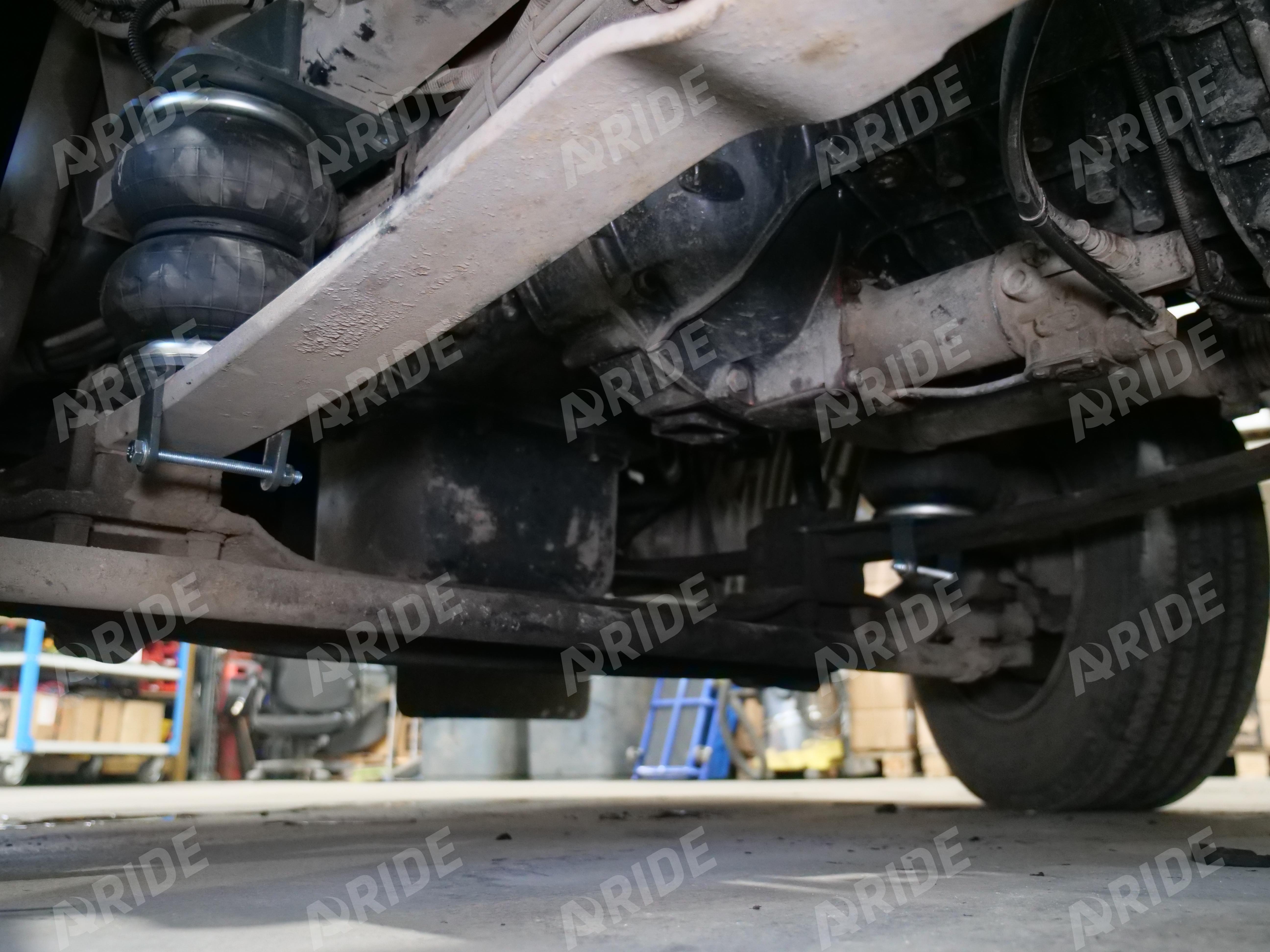 Клиентом было принято решение по установке дополнительных пневматических подушек. Данный комплект пневмоподвески устанавливается в дополнение к рессорному пакету и работает в паре с ним. Установленные пневматические подушки компенсируют до 3000 килограмм нагрузки с передней оси. Характерным плюсом вспомогательной пневматической подвески является то, что у водителя всегда есть возможность регулировки жёсткости, грузоподъёмности и клиренса. Данная регулировка обеспечивается при помощи специальной системы управления. Данная система состоит из одного контура и подключается к заводской воздушной системе.