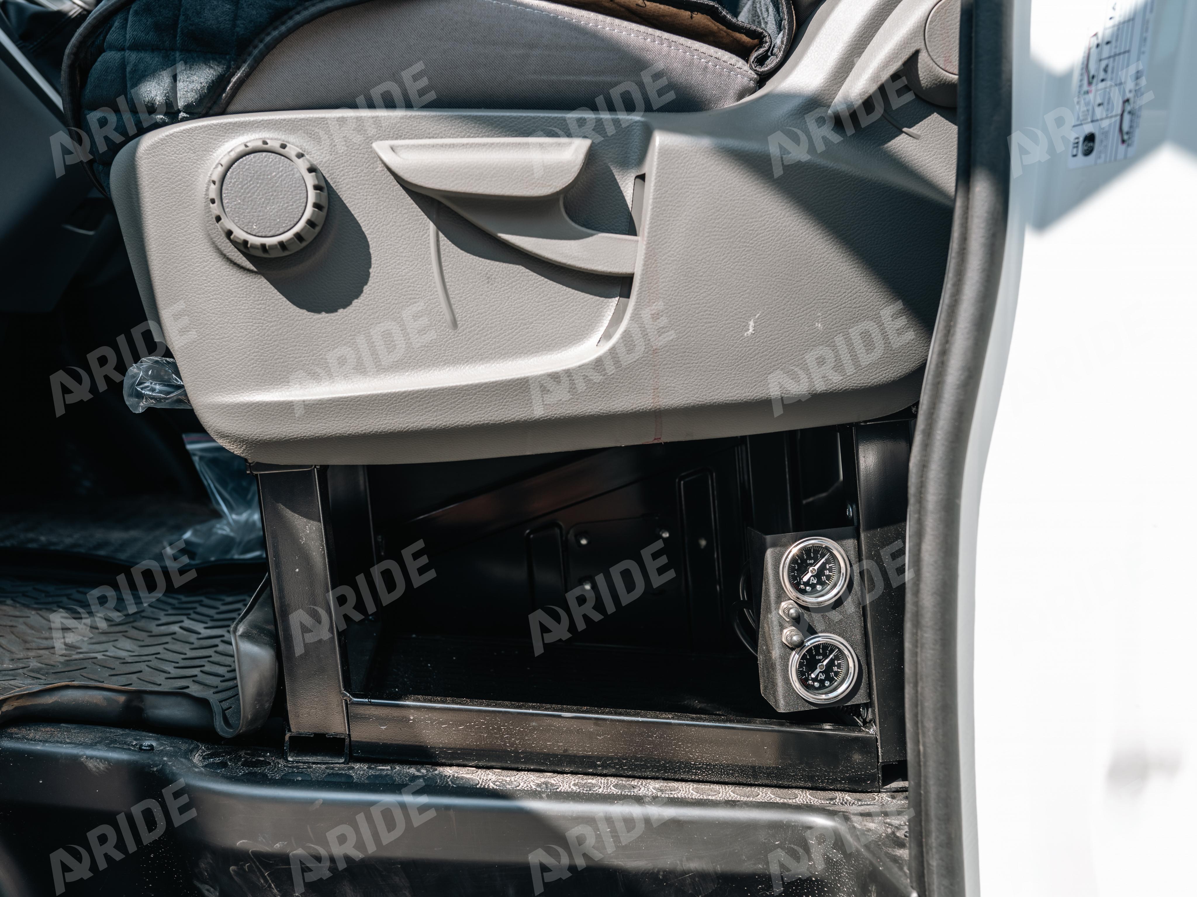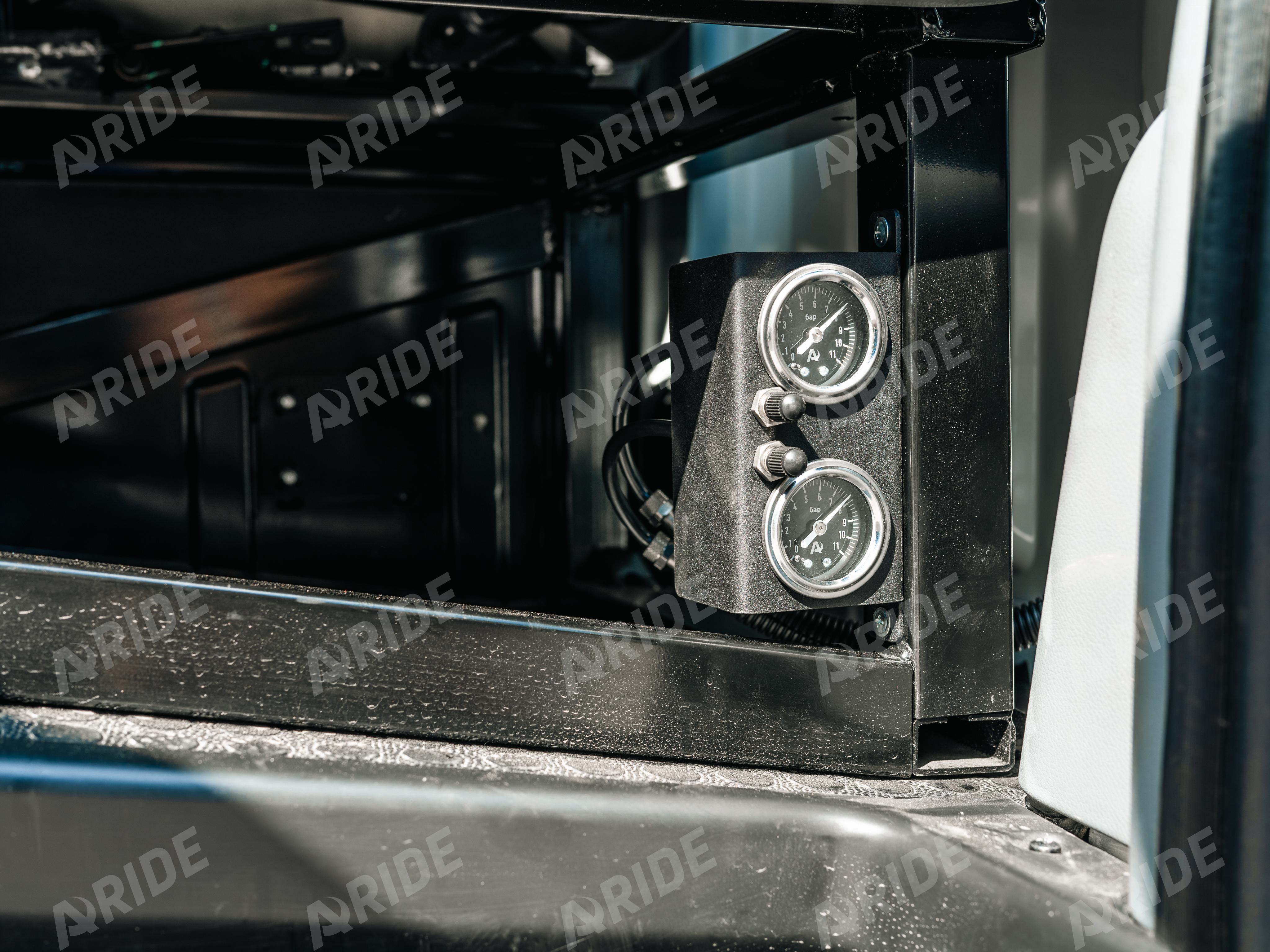Так же на автомобиль была установлена система для отслеживания и регулировки давления. Блок с манометрами и ниппелями был установлен под водительское сидение, для удобства при эксплуатации.