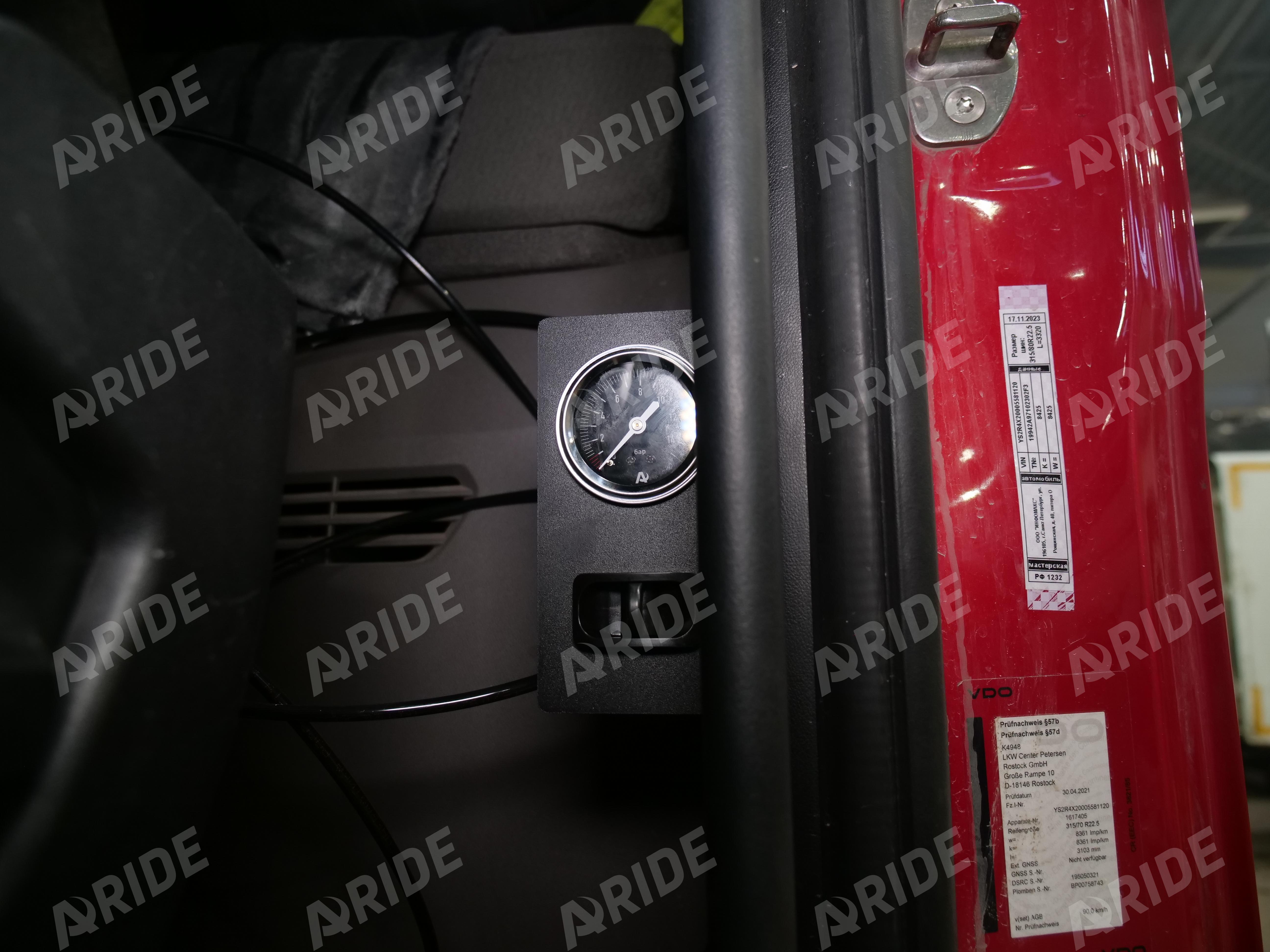 Для управления давлением в подушках, на автомобиль была установлена одноконтурная система 1.ОБ.ПС. Регулировка и отслеживание давления реализовано через однострелочный манометр и пневматическую клавишу. Данная система подключается к заводскому воздуху автомобиля.