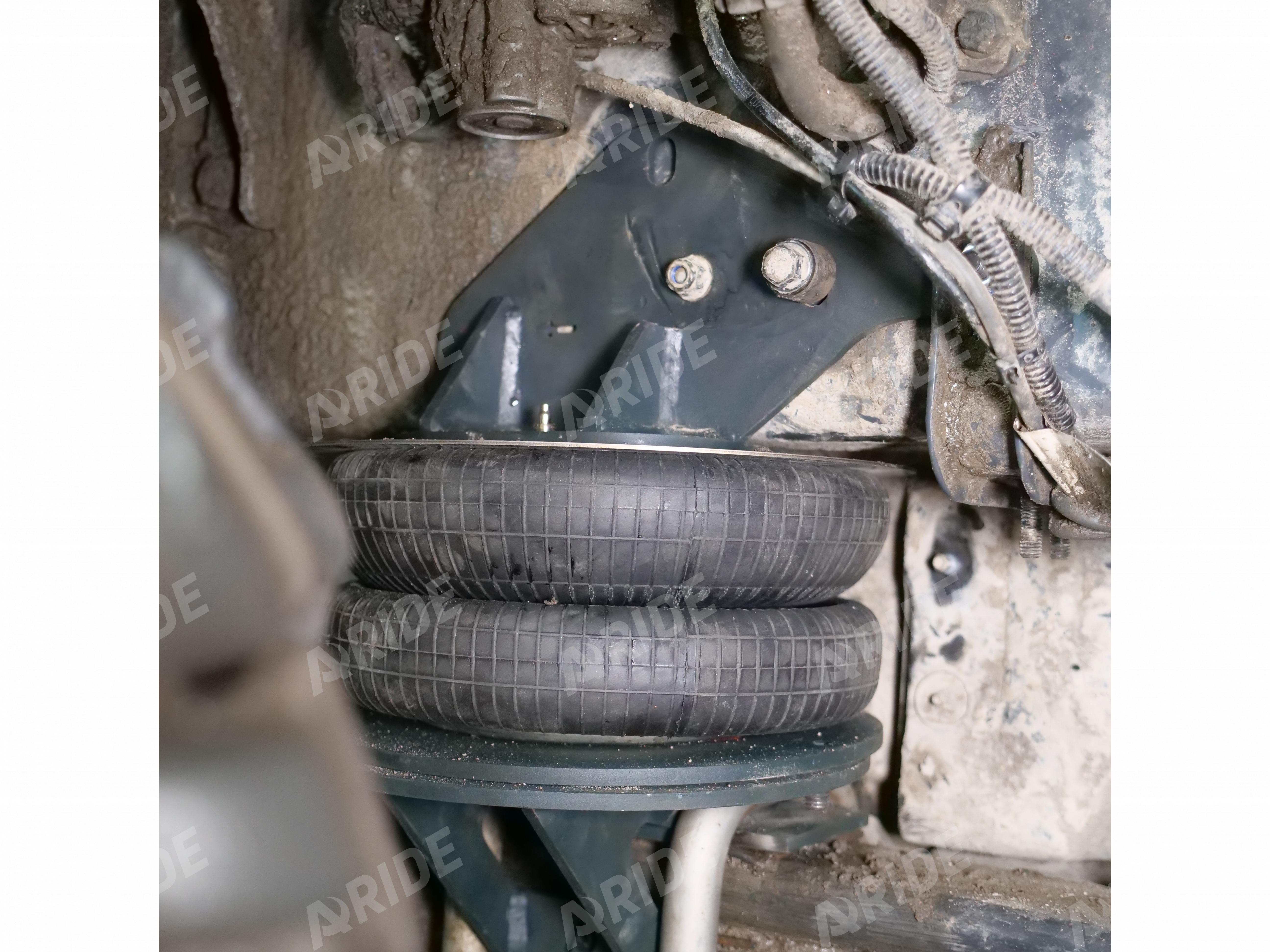 С завода автомобиль оборудован пневматической подвеской на ведущей задней оси, и рессорной подвеской на передней оси. Рессорный пакет состоит из двух листов. И несмотря на то, что автомобиль имеет небольшой пробег, рессоры уже просели, и это отрицательно сказывается на комфорте и проходимости автомобиля. Клиент обратился в нашу компания для решения данной проблемы. Нашими конструкторами был разработан комплект вспомогательной пневматической подвески, который устанавливается на переднюю ось и крепится к раме, а так же к стремянным болтам.