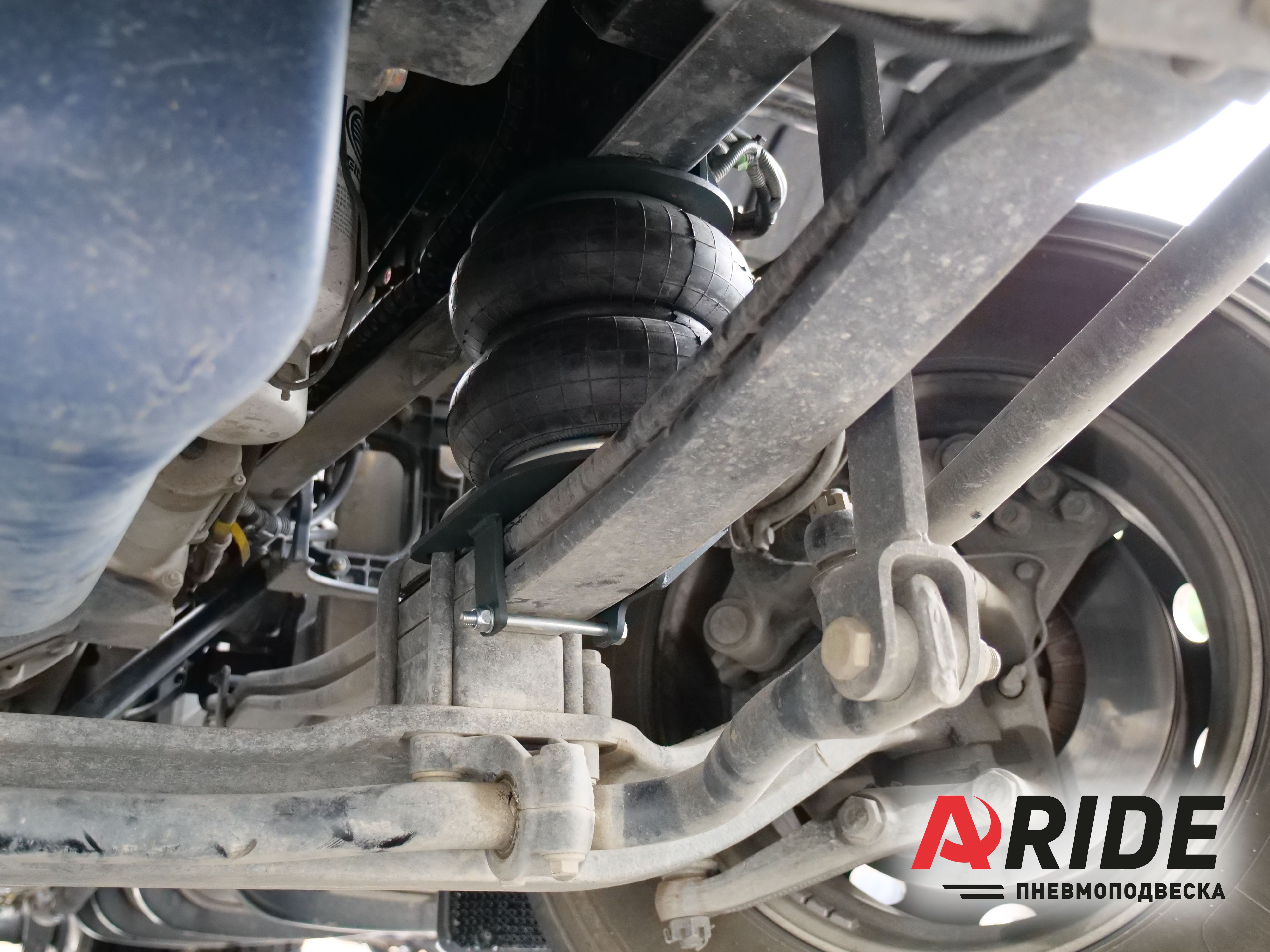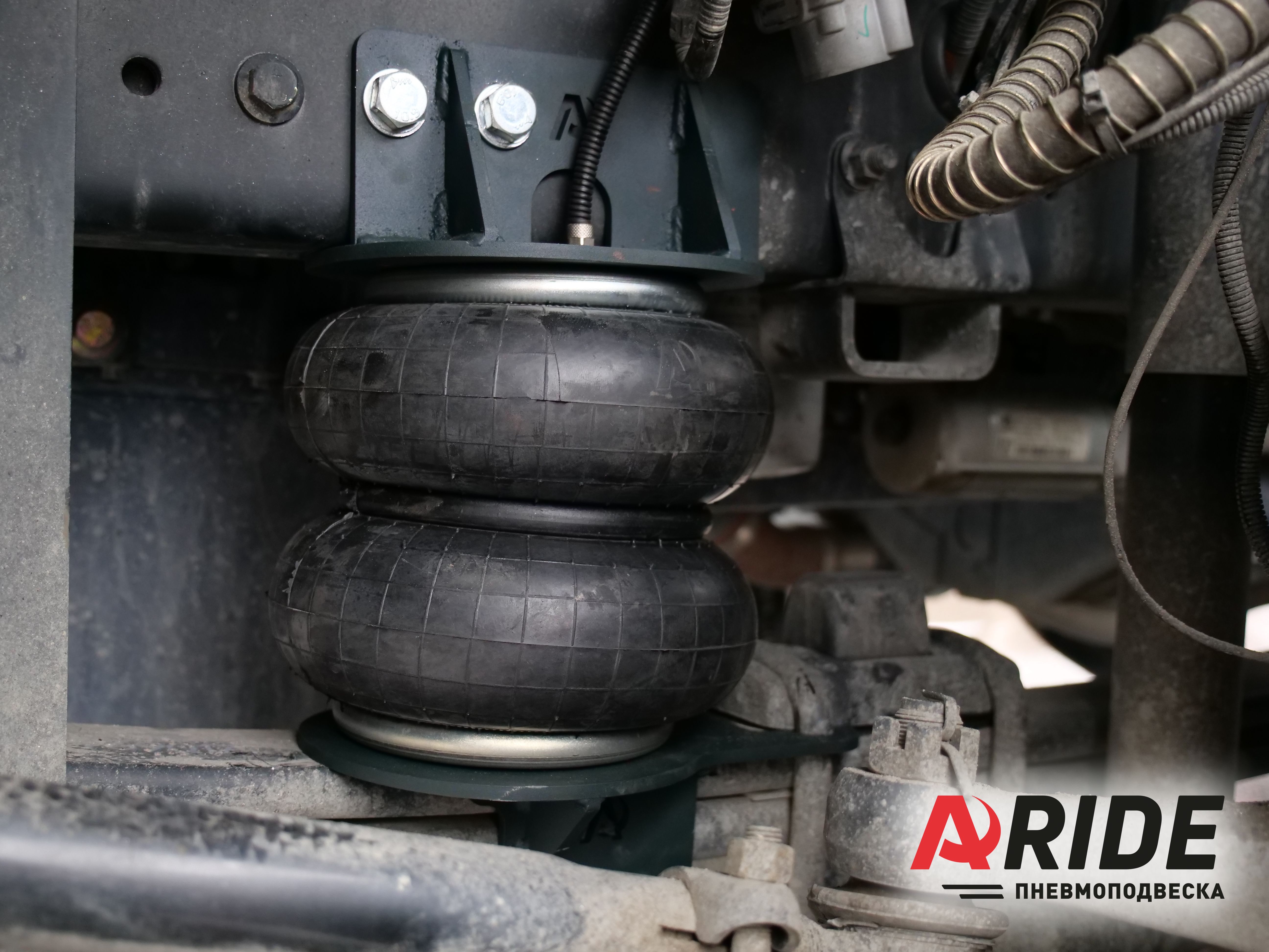 Подушки устанавливаются в дополнение к переднему рессорному пакету. Монтаж вспомогательных пневмоэлементов происходит за счёт специальных кронштейнов, которые были разработаны исключительно под данный автомобиль. Комплект состоит из верхних и нижних кронштейнов. Верхние кронштейны крепятся к раме через заводские отверстия в ней. Нижние кронштейны устанавливаются на рессорный пакет, максимально близко к передней балке, для того чтобы не создавать дополнительное давление на уязвимые части рессор. Такое расположение пневмоэлементов выбрано не с проста. Подушки ставятся рядом с балкой, для того чтобы сохранить заводской отбойник, который предотвращает всевозможные ударные непредвиденные нагрузки.
