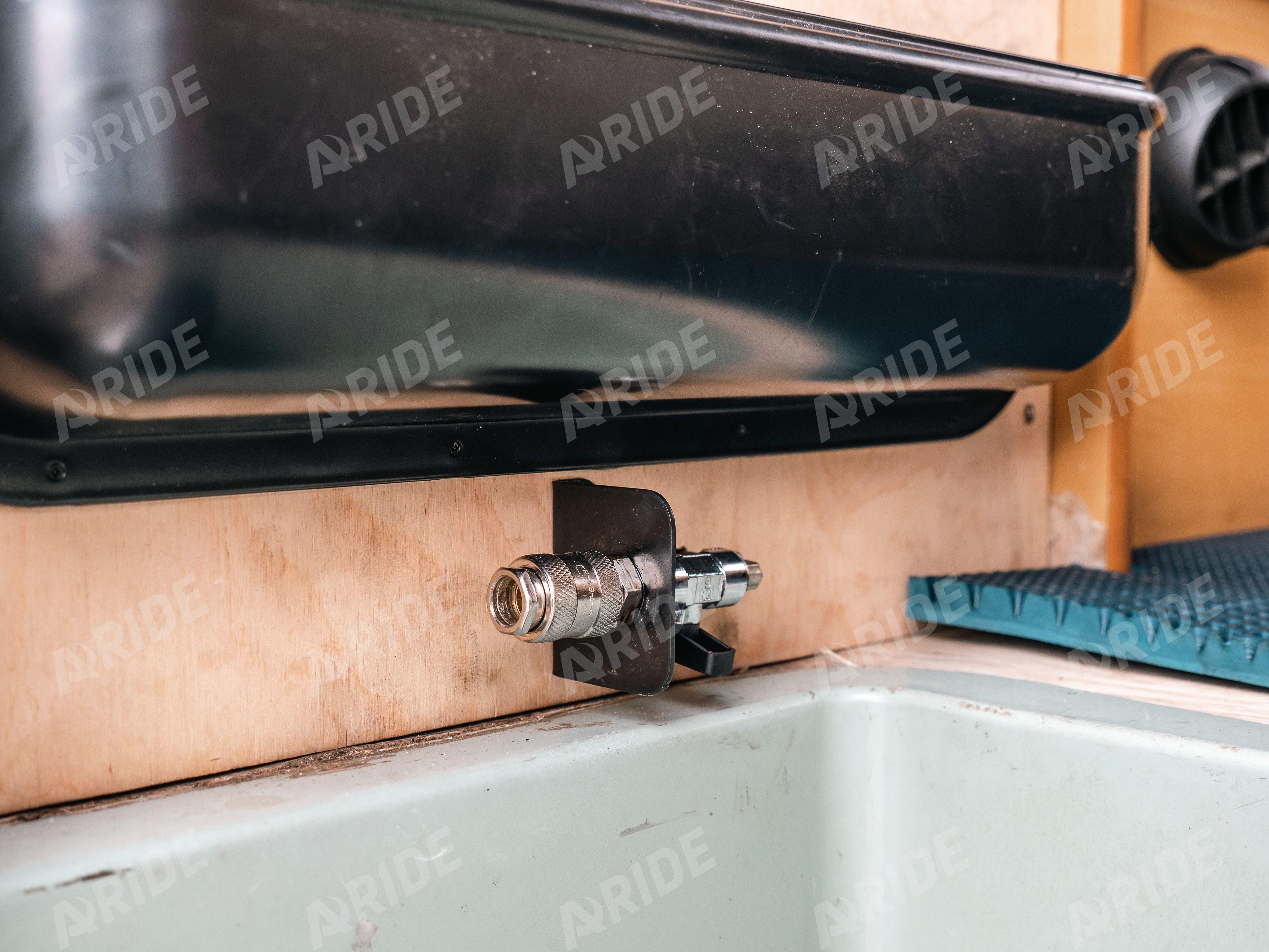 Регулировка давления в подушках реализована за счёт установленной двухконтурной системы управления. Так как это автодом, по просьбе клиента, система была установлена в заднюю часть автомобиля. Блок управления врезан в боковую панель, так же рядом с блоком был выведен разъём для подкачки колёс.