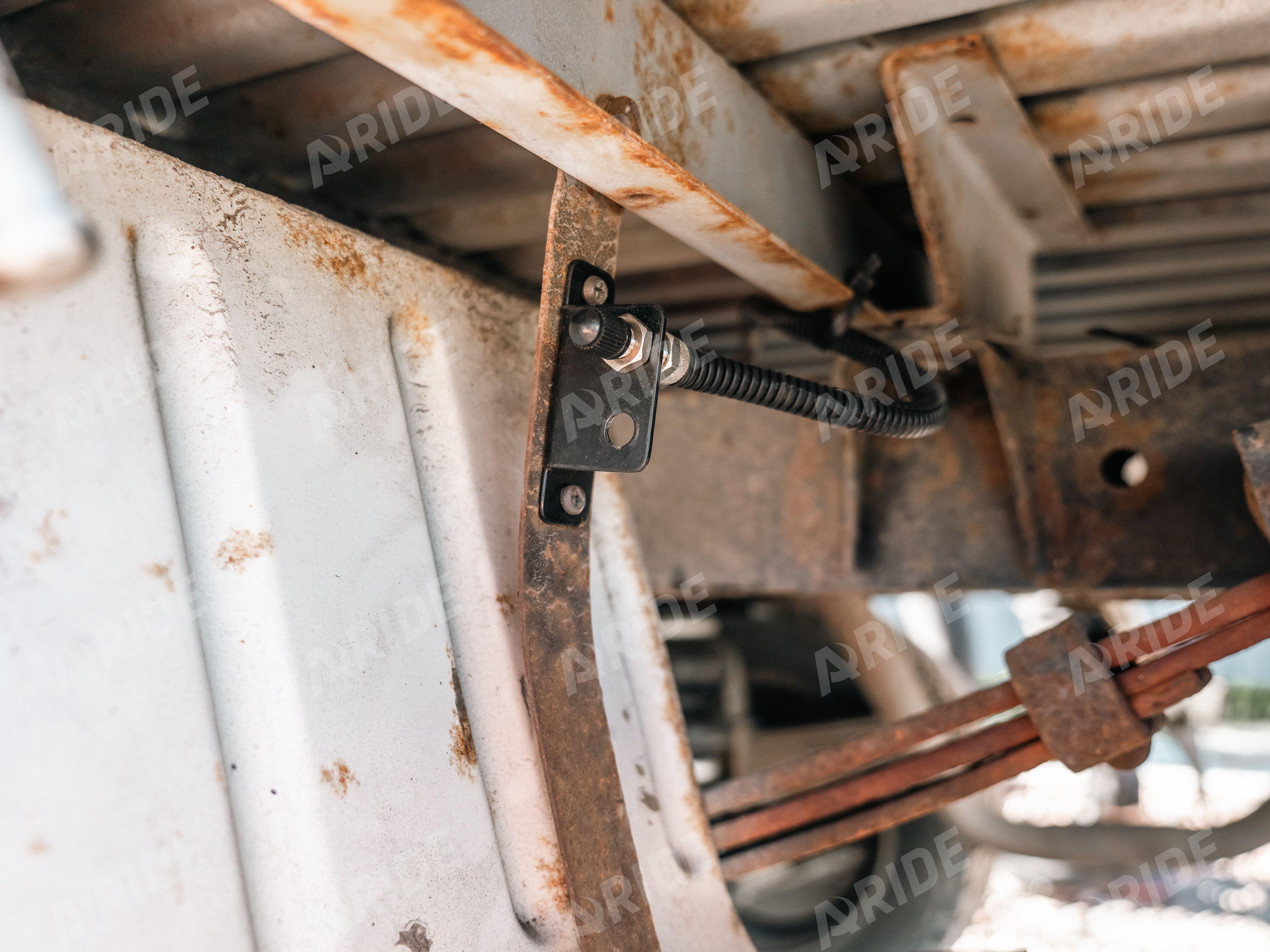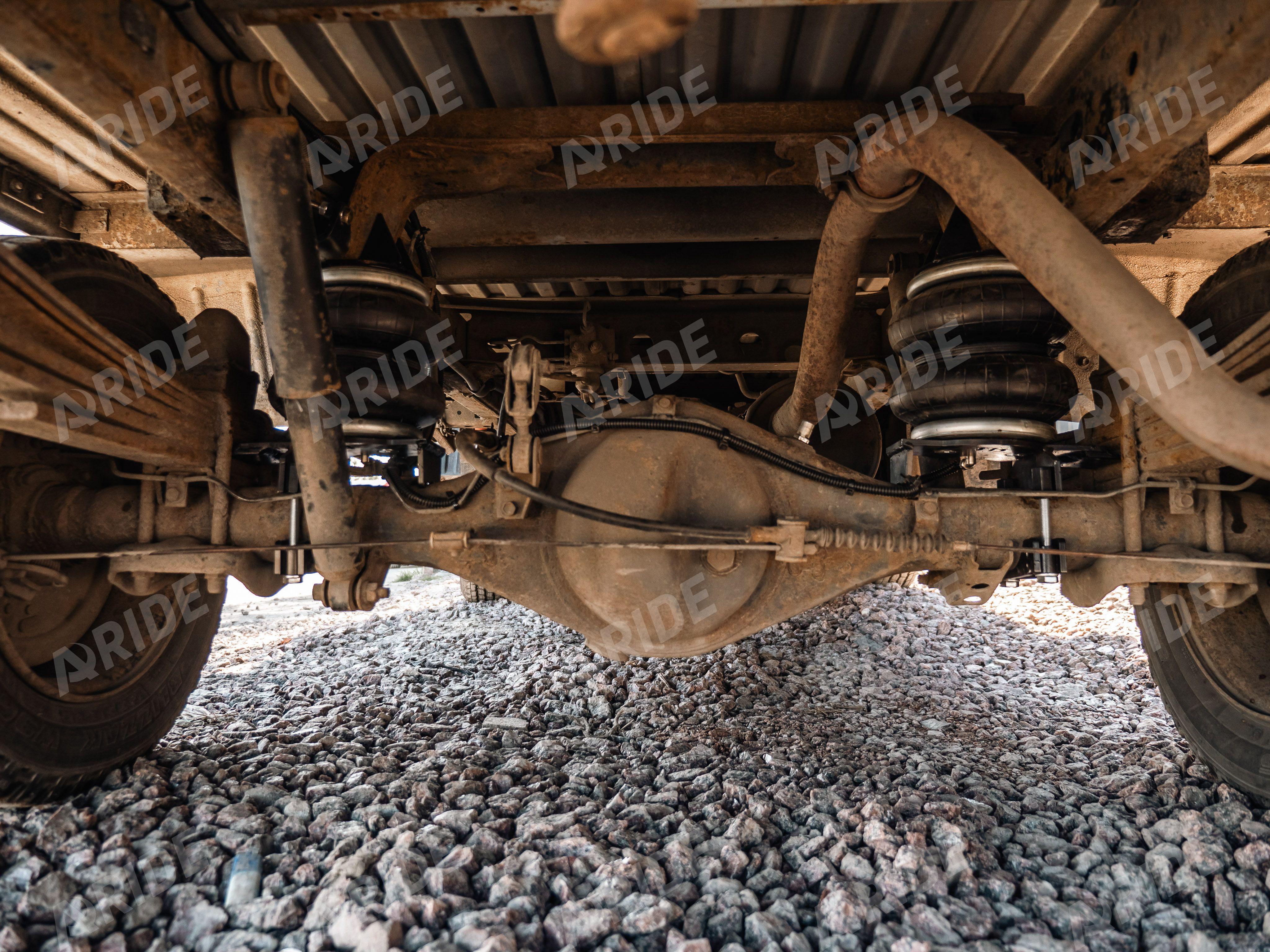 Нашими конструкторами был разработан комплект на заднюю ось, в дополнение к заводским рессорам. Пневмоподушки монтируются между рамой и мостом. Такой стандартный конструктив позволяет равномерно распределить нагрузку между рессорами и пневматическими подушками. Грузоподъёмность каждого пневмоэлемента - 2000кг при давлении в нём - 8 бар.
