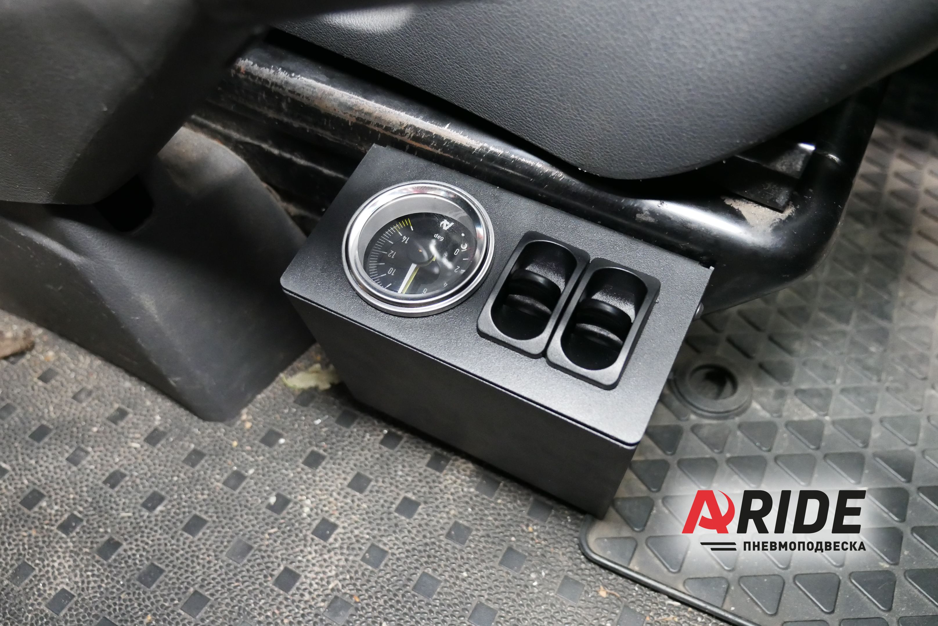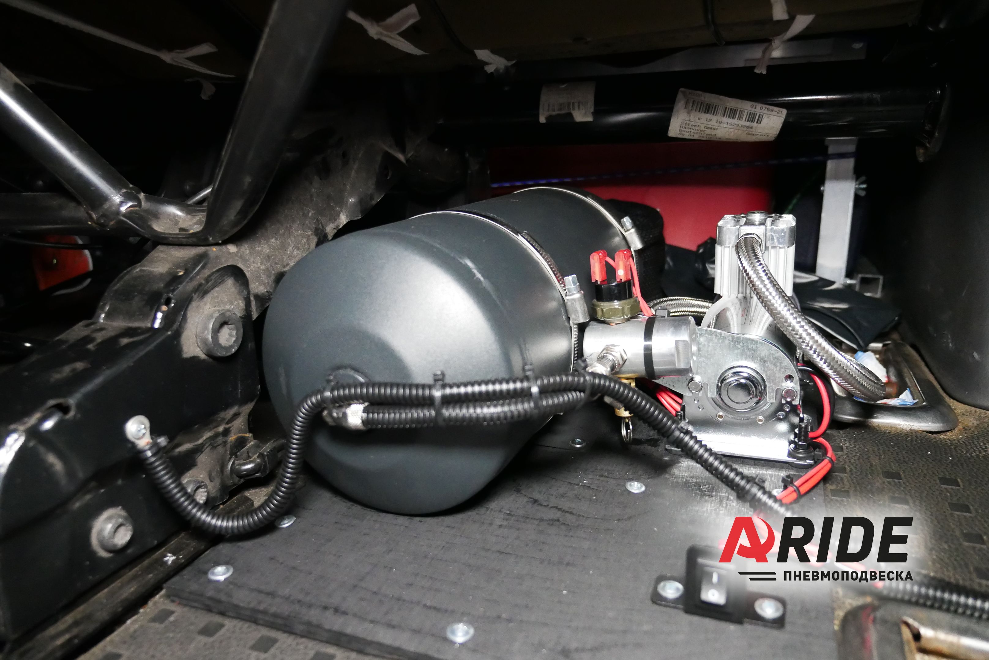 Для управления давлением в пневмоэлементах была выбрана двухконтурная система 2.120.ПС. Данная система оснащена высокопроизводительным компрессором ARIDE 100C и пятилитровым ресивером. Ключевым плюсом данной системы является то, что в ресивере всегда поддерживается давление 8 атмосфер, это обеспечивает очень быстрое нагнетание воздуха в пневмоподушки. Блок управления пневмоподвеской расположен справа от водительского сидение. Ресивер, компрессор, датчики, всё расположилось под задним рядом сидений.