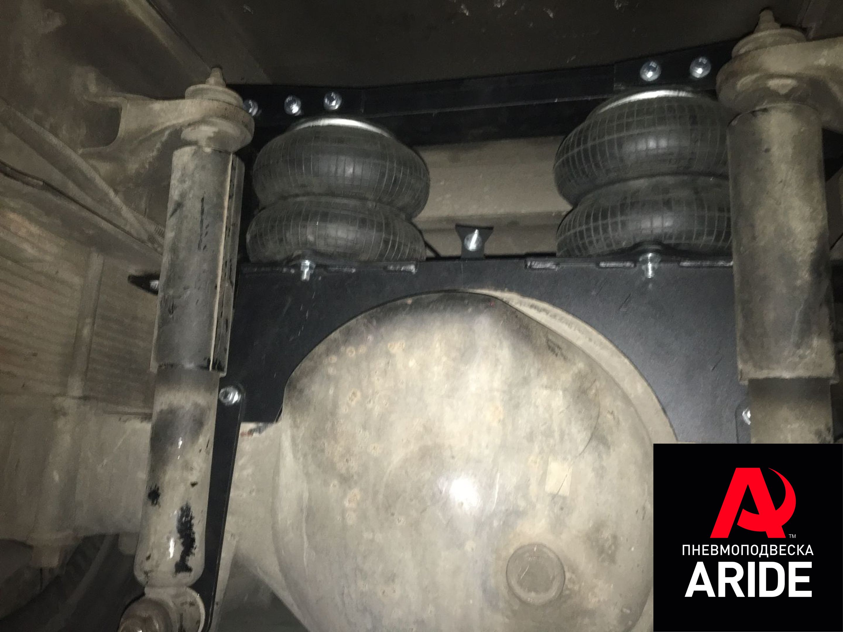 С помощью пневмоподвески нам удалось компенсировать с рессор по передней оси до 3000 кг, и по задней оси до 4000кг. Верхние кронштейны обоих комплектов были установлены и закреплены в заводские отверстия в раме. На передней оси нижние кронштейны закреплены за стремянные болты и полностью обхватывают пакет рессор и зажимаются с нижней части болтом. На задней оси нижние кронштейны пневмоподвески стоят на чулке моста и закреплены за штатные болты крепления амортизаторов.