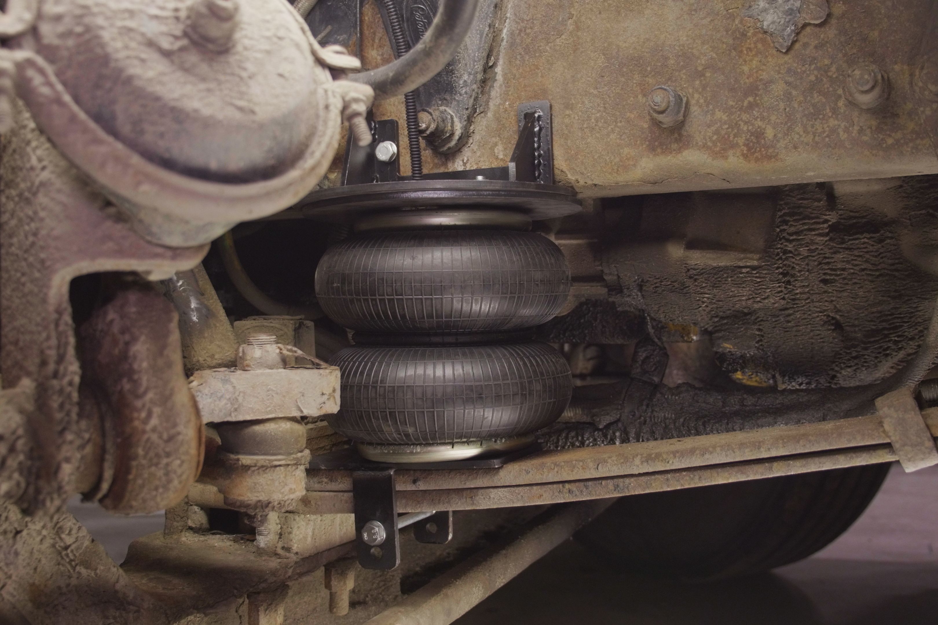 Это американский тягач, который с завода имеет переднюю рессорную подвеску. За время эксплуатации она сильно износилась, рессоры просели и машина ездит "на отбойниках". Замена рессор на данном тягаче, не дешёвая процедура, и более целесообразным является установка вспомогательной пневмоподвески, не затрагивая старые рессоры.